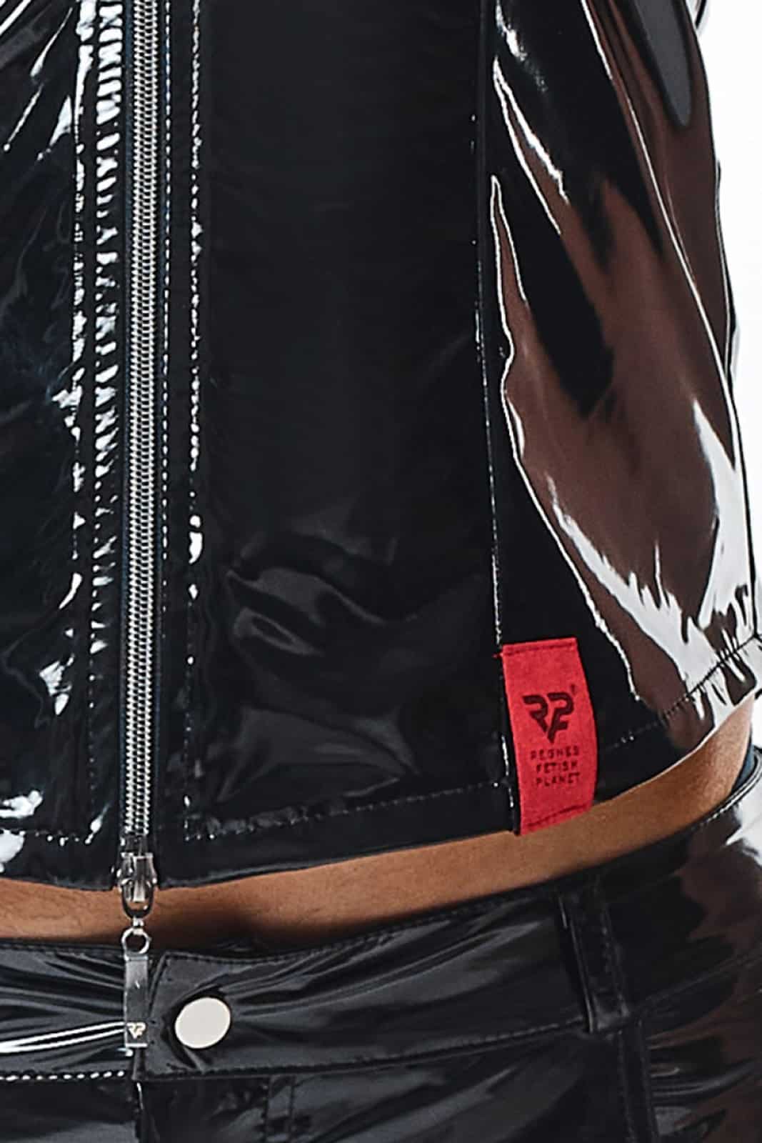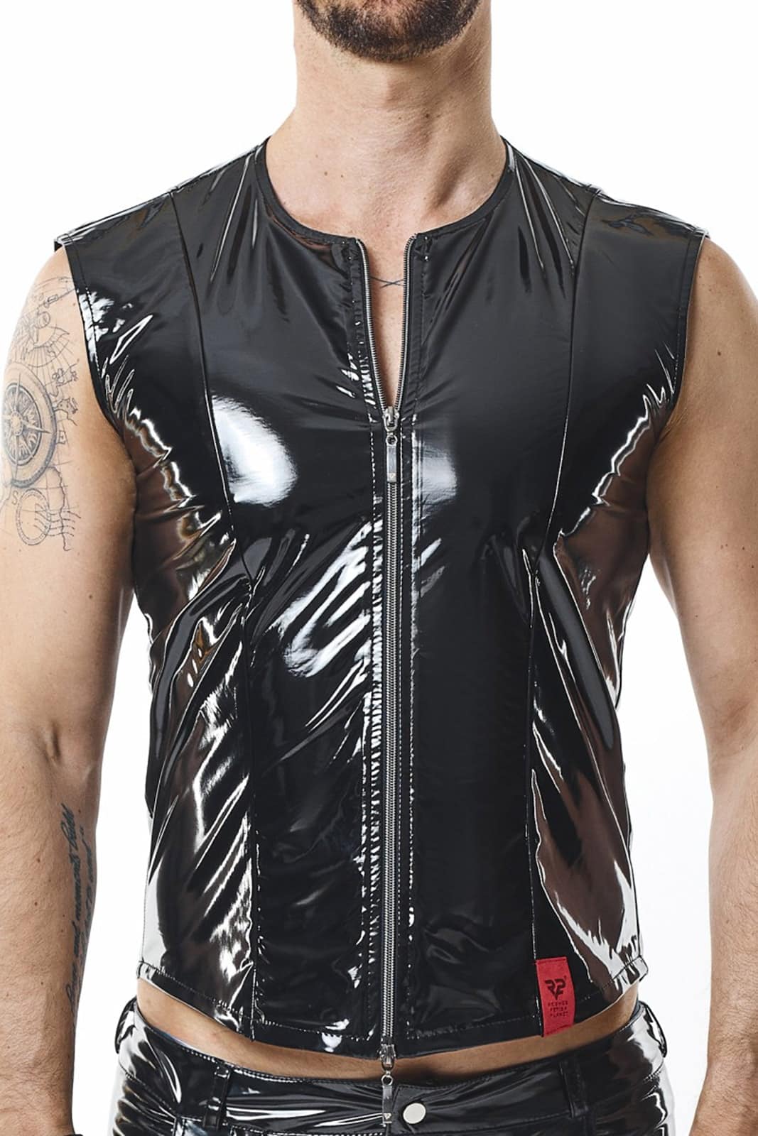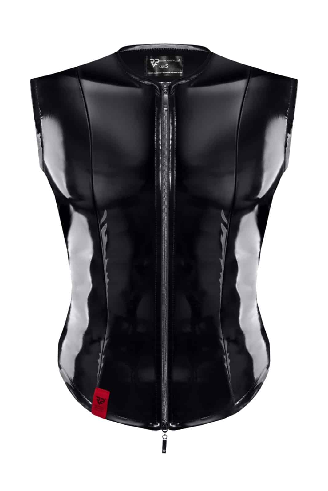 Einzigartige, moderne Weste aus schwarzem, elastischem PVC. Auf der Vorderseite befindet sich ein dunkler, abnehmbarer Reißverschluss, der sowohl von oben als auch von unten geöffnet werden kann. Auf den Reißverschlüssen ist das Logo von RFP eingraviert. Auf der Vorder- und Rückseite befinden sich vertikale Nähte, die für einen einzigartigen Look sorgen und gleichzeitig die Taille optisch verschlanken und die Schulter- und Brustlinie verbreitern, wodurch eine muskulösere Silhouette entsteht.