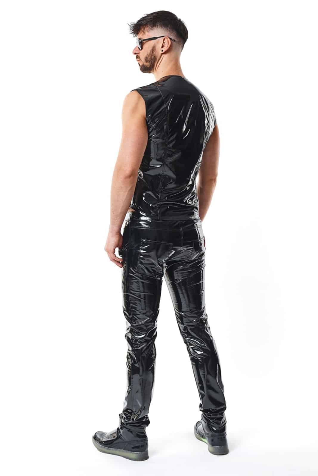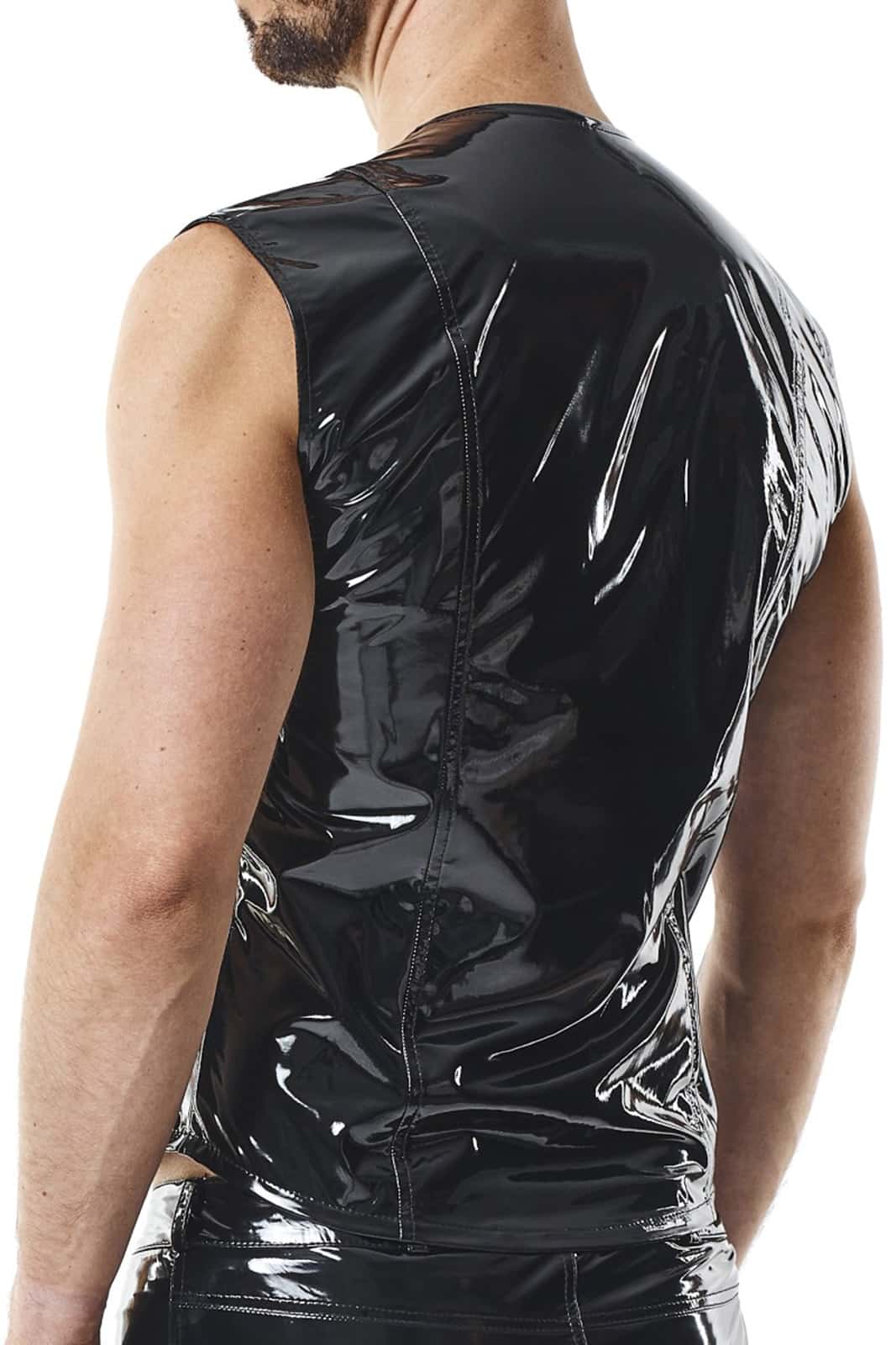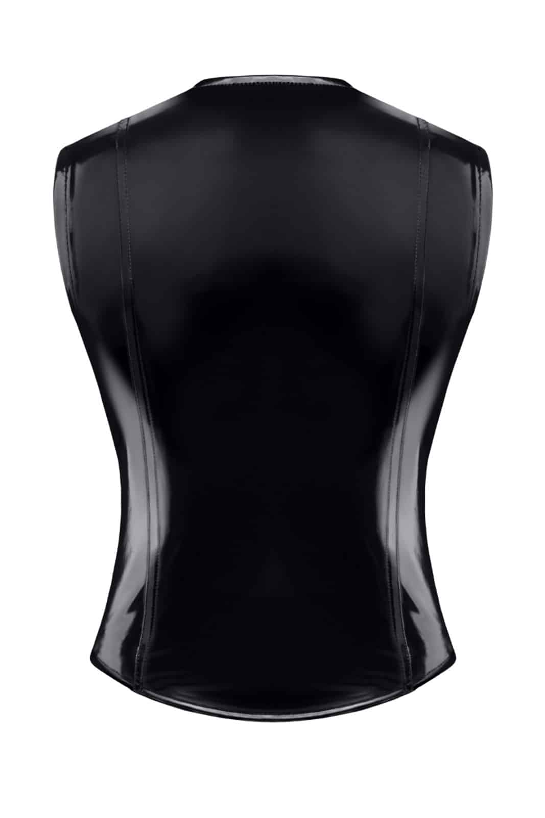 Einzigartige, moderne Weste aus schwarzem, elastischem PVC. Auf der Vorderseite befindet sich ein dunkler, abnehmbarer Reißverschluss, der sowohl von oben als auch von unten geöffnet werden kann. Auf den Reißverschlüssen ist das Logo von RFP eingraviert. Auf der Vorder- und Rückseite befinden sich vertikale Nähte, die für einen einzigartigen Look sorgen und gleichzeitig die Taille optisch verschlanken und die Schulter- und Brustlinie verbreitern, wodurch eine muskulösere Silhouette entsteht.