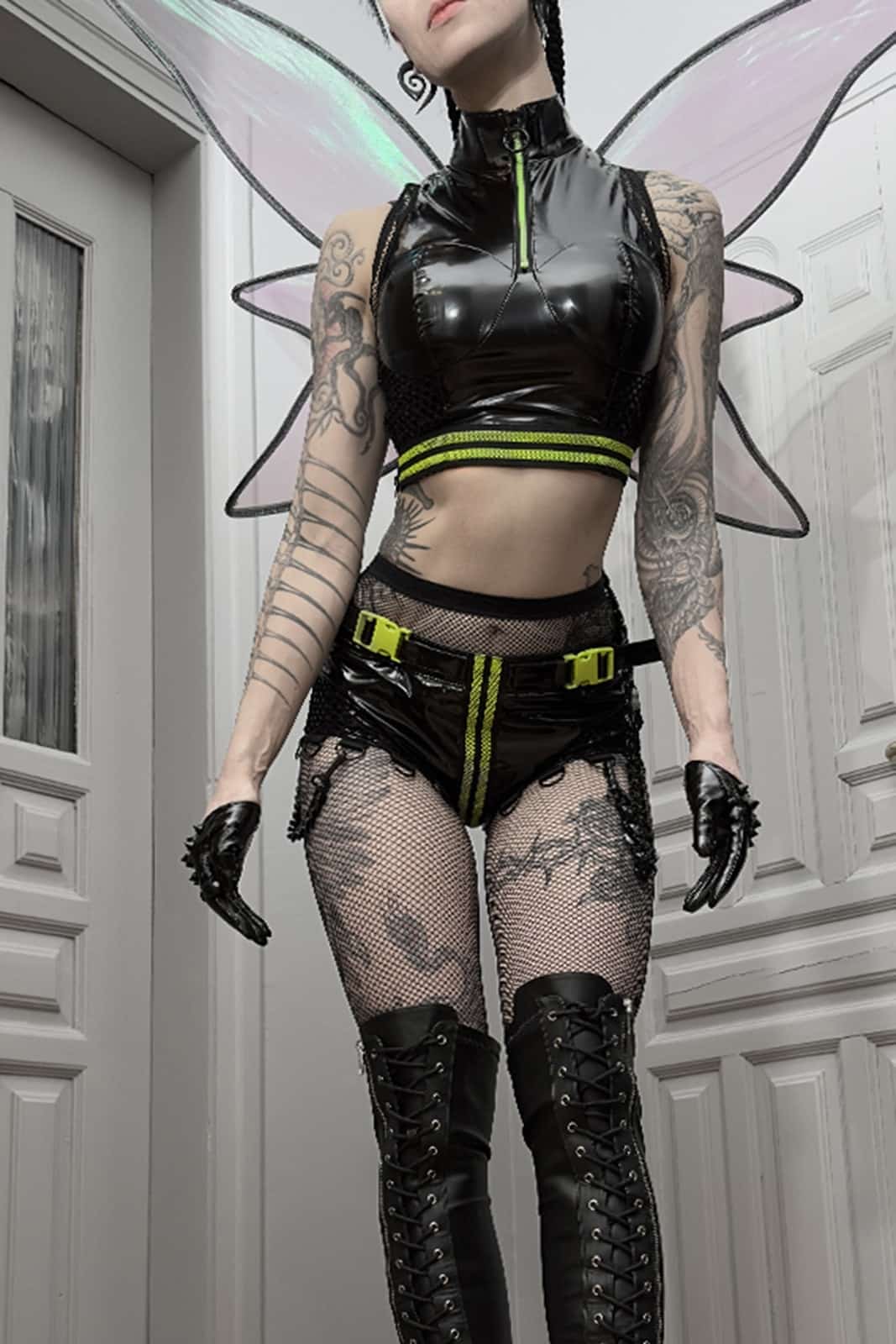 Die Cyber ??Raver Shorts sind wie geschaffen für Bewegung in der neonbeleuchteten Unterwelt und vereinen industriellen Stil mit futuristischem Design. Aus glänzendem schwarzem Kunstleder mit auffälligen grünen Akzenten gefertigt, ziehen diese Shorts alle Blicke auf sich. Seitliche Schnallenriemen an der Taille verleihen einen funktionalen Touch, während Mesh-Einsätze Struktur und Kontrast verleihen. D-Ring-Details unterstreichen die Ästhetik, und der Reißverschluss hinten sorgt für sicheren Sitz.