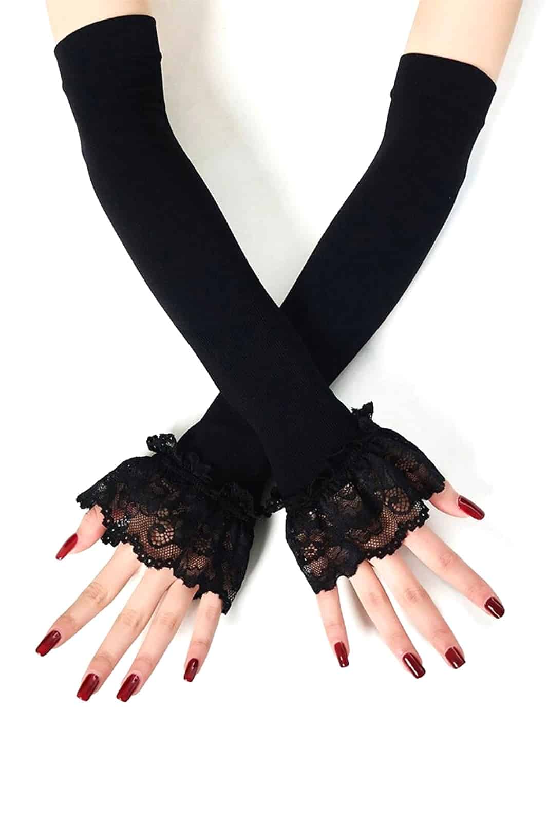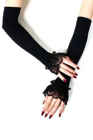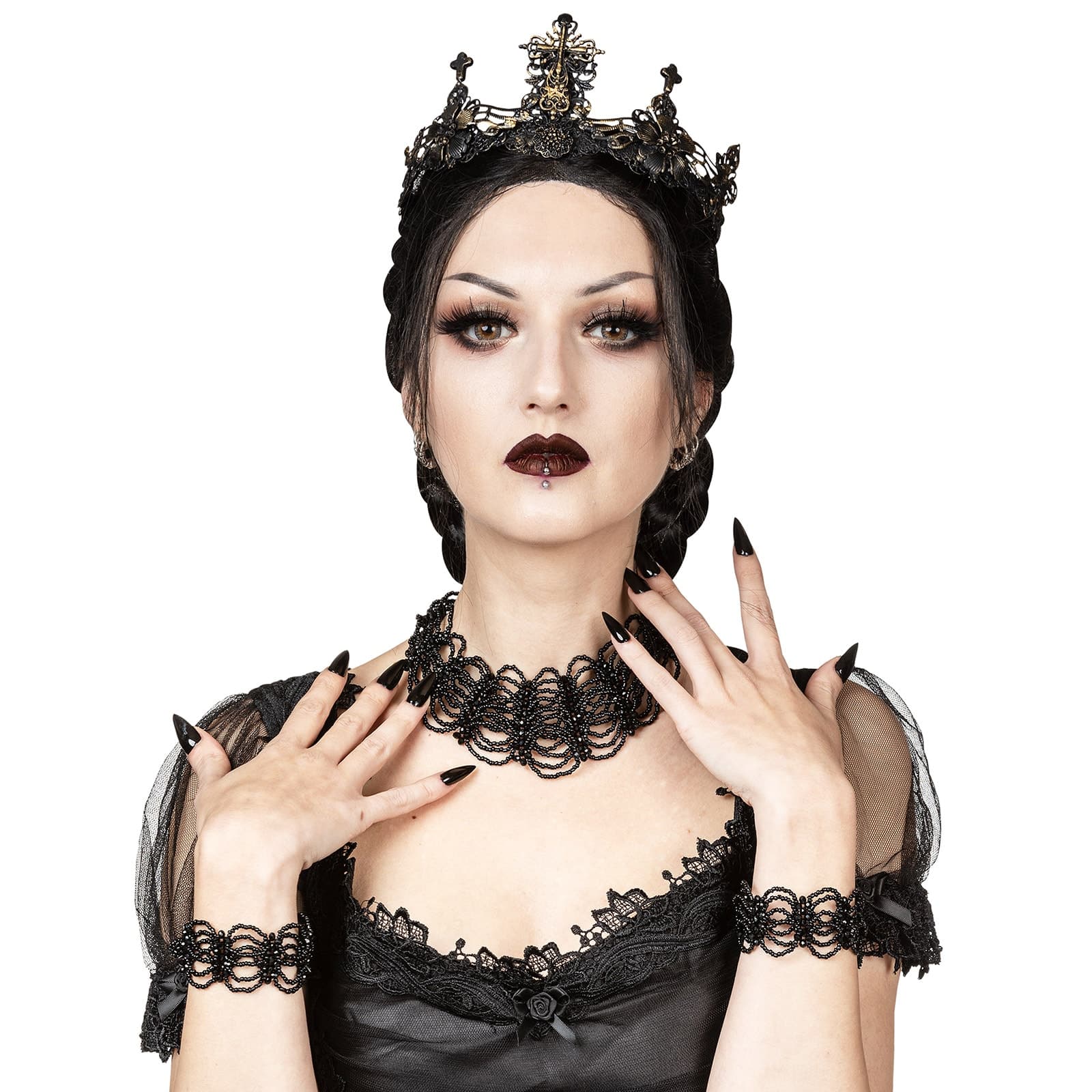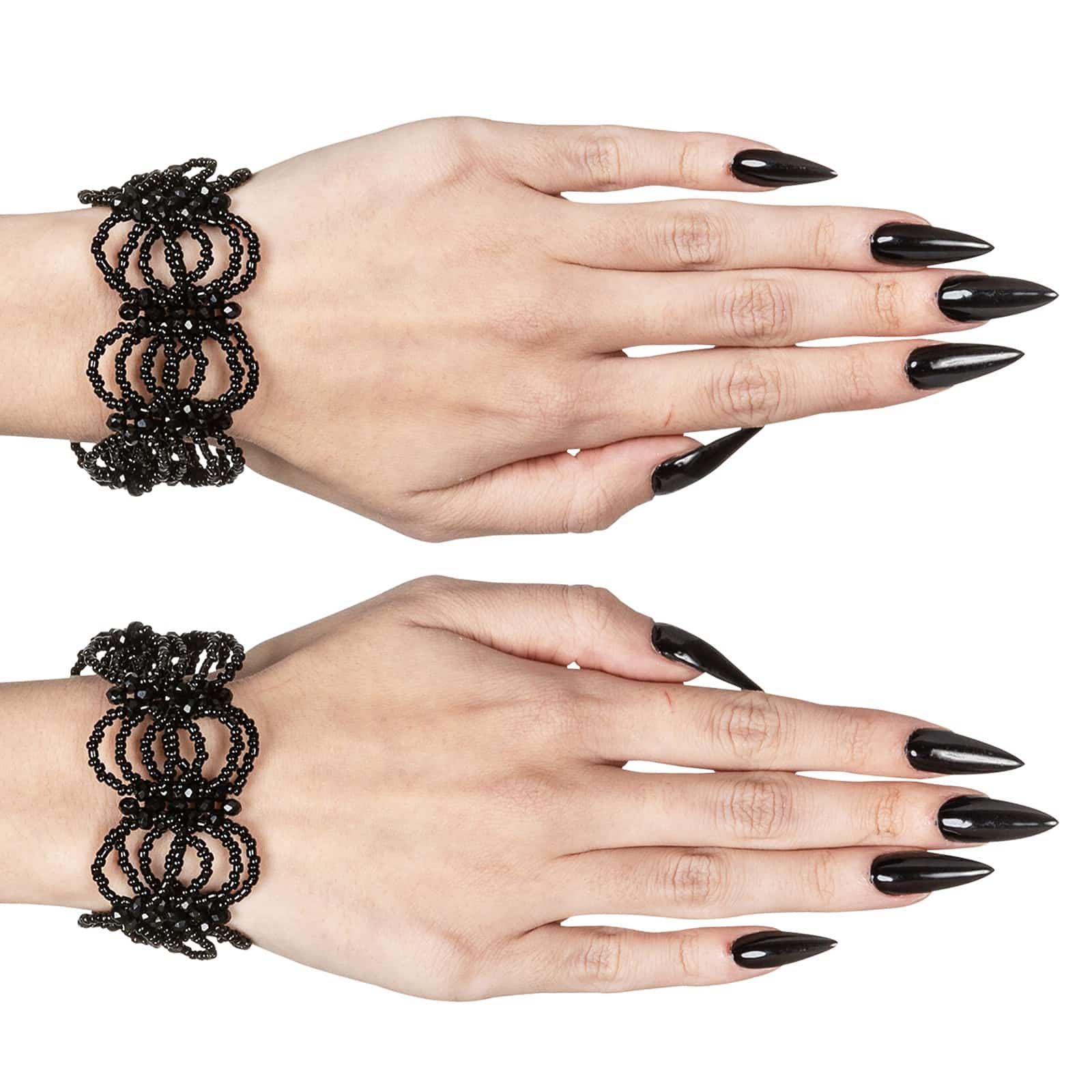 Schicke viktorianische Manschetten aus schwarzen Glasperlenschnüren, die durch rautenförmige Glasperlen zu Schlaufen zusammengehalten werden. Diese Manschetten sind verstellbar.