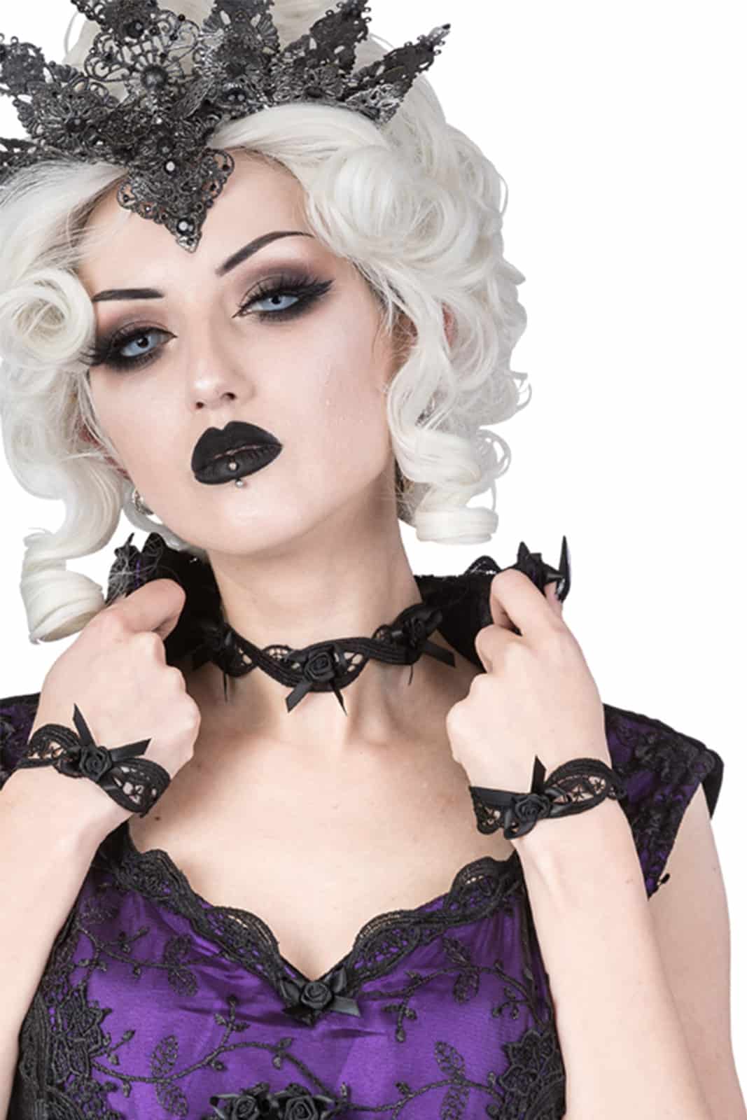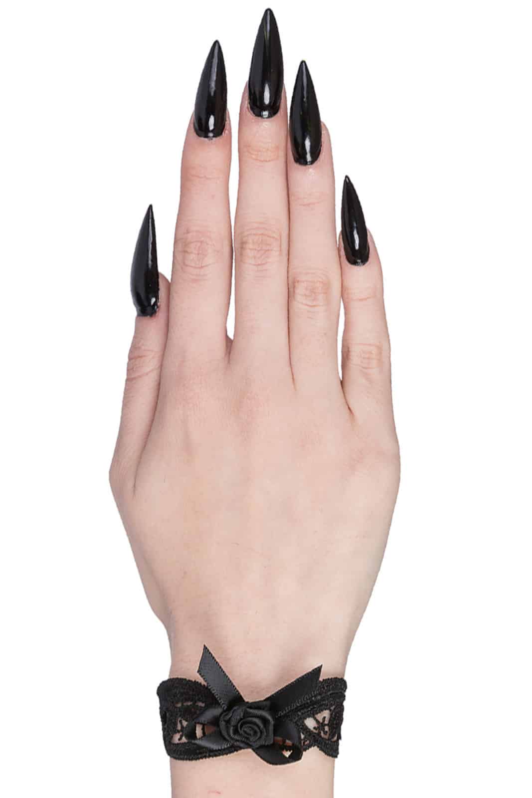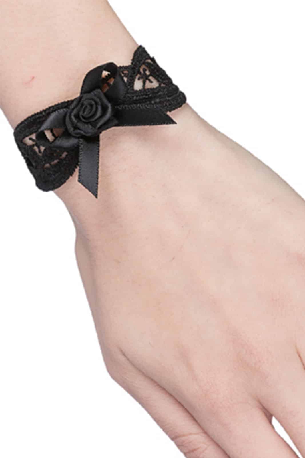 Ein Paar filigrane Armbänder aus venezianischer Spitze. In der vorderen Mitte sind die Manschetten mit einer kleinen schwarzen Satinschleife und einer schwarzen Satinrose verziert. Diese Manschetten haben zwei Druckknöpfe auf der Rückseite, um die Größe anzupassen.