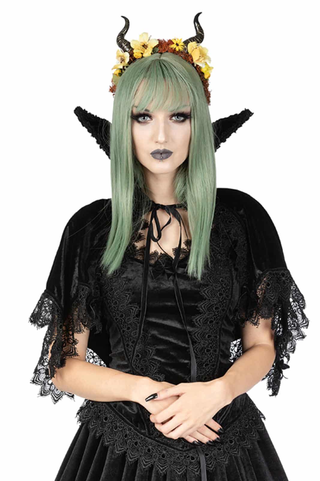 Samt-Umhang mit Vampir-Kragen, der sanft die Schultern bedeckt. Der untere Teil des Umhangs ist mit Spitzbögen geformt. Entlang des Saums der Bögen ist der Umhang mit venezianischer Spitze und schwarzem Samtband besetzt und jede Spitze ist mit einer großen Samtschleife verziert. Der steife Vampirkragen besteht aus zwei Lagen Samt, um sowohl die Innenseite des Kragens als auch die Außenseite zu bedecken, und ist auf beiden Seiten mit venezianischer Spitze besetzt. Verschluss mit Samtriemen vorne.