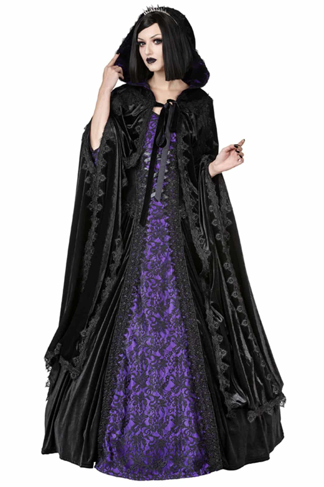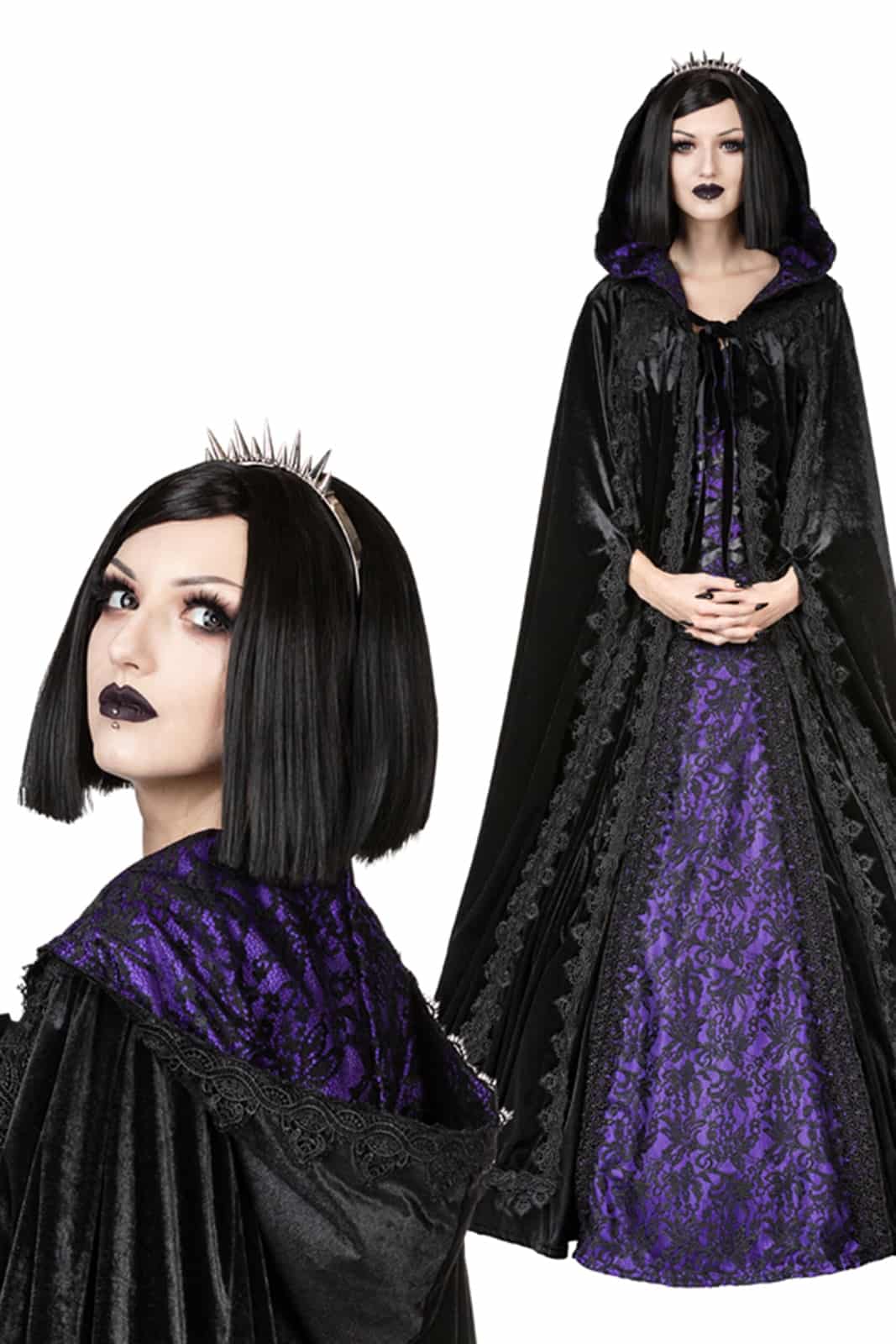 Langer schwarzer Samtumhang mit Kapuze und venezianischem Besatz entlang der Säume. Die beiden seitlichen Schlitzöffnungen für die Hände sind mit venezianischer Spitze besetzt und mit schwarzen Samtschleifen verziert. Die Kapuze ist mit seidig weichem Satin gefüttert und mit einer schwarzen sizilianischen Spitzenauflage überzogen. Vorne mit Samtbandverschluss.