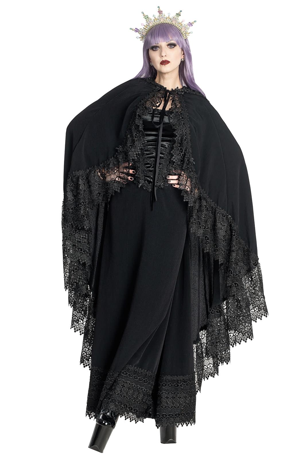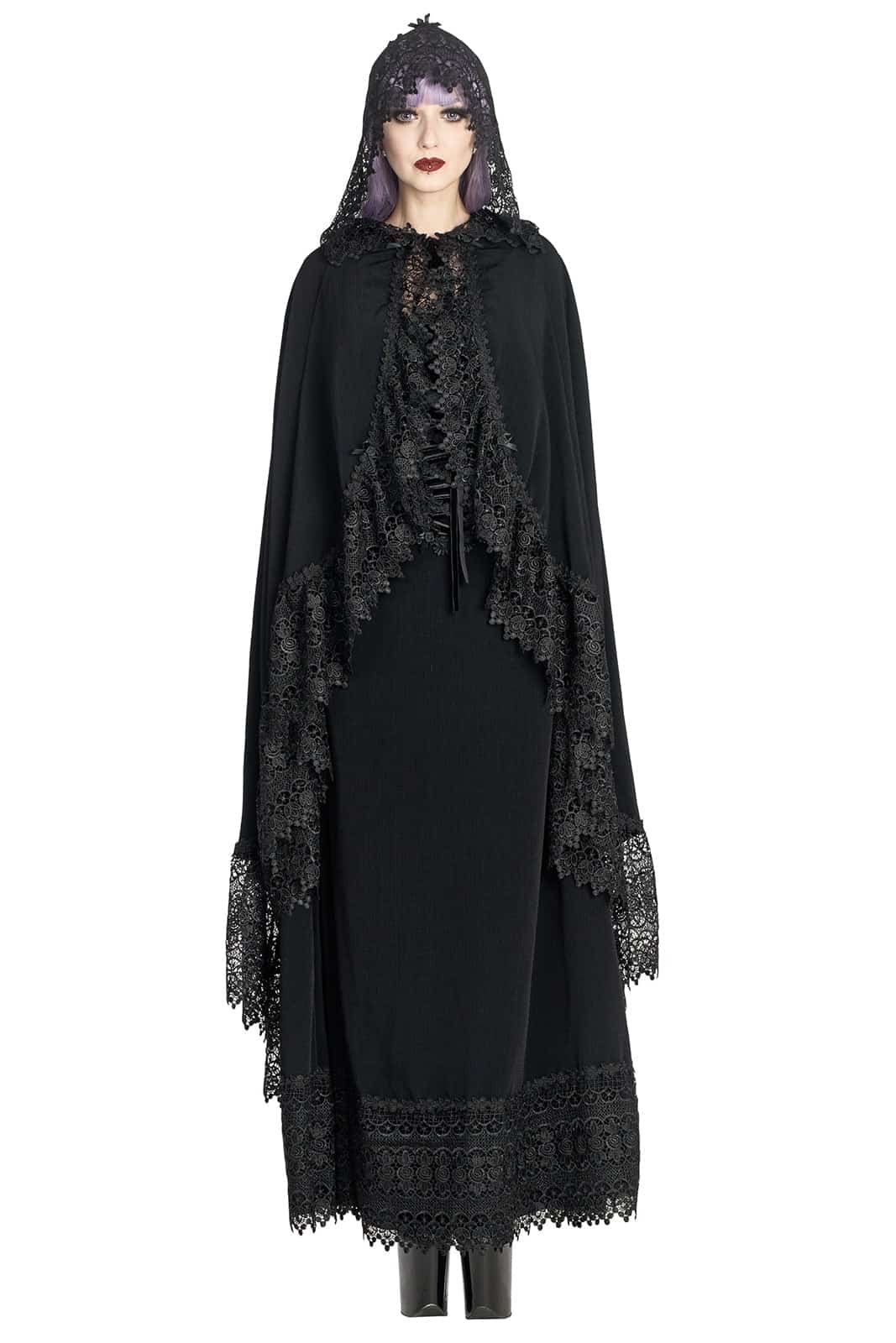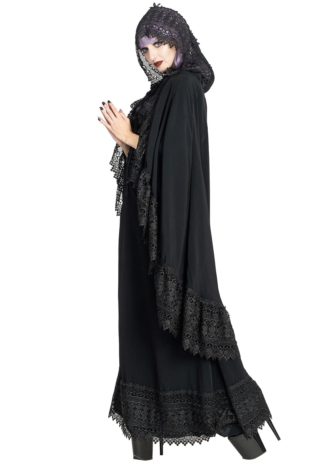 Dieser atemberaubende Gothic-Umhang verleiht jedem Auftritt eine geheimnisvolle, fast übernatürliche Ausstrahlung. Aus fließendem, schwarzem Twill gefertigt, fällt er elegant und umhüllt die Silhouette mit dramatischer Leichtigkeit. Die große Kapuze ist mit einer Satinschleife und edler Brokatspitze verziert, während fein gearbeitete Spitzenkanten und kleine Satinrosen den Rand schmücken. Geöffnet entfaltet der Umhang flügelartige Bahnen – ein eindrucksvolles Detail für magische Auftritte.
