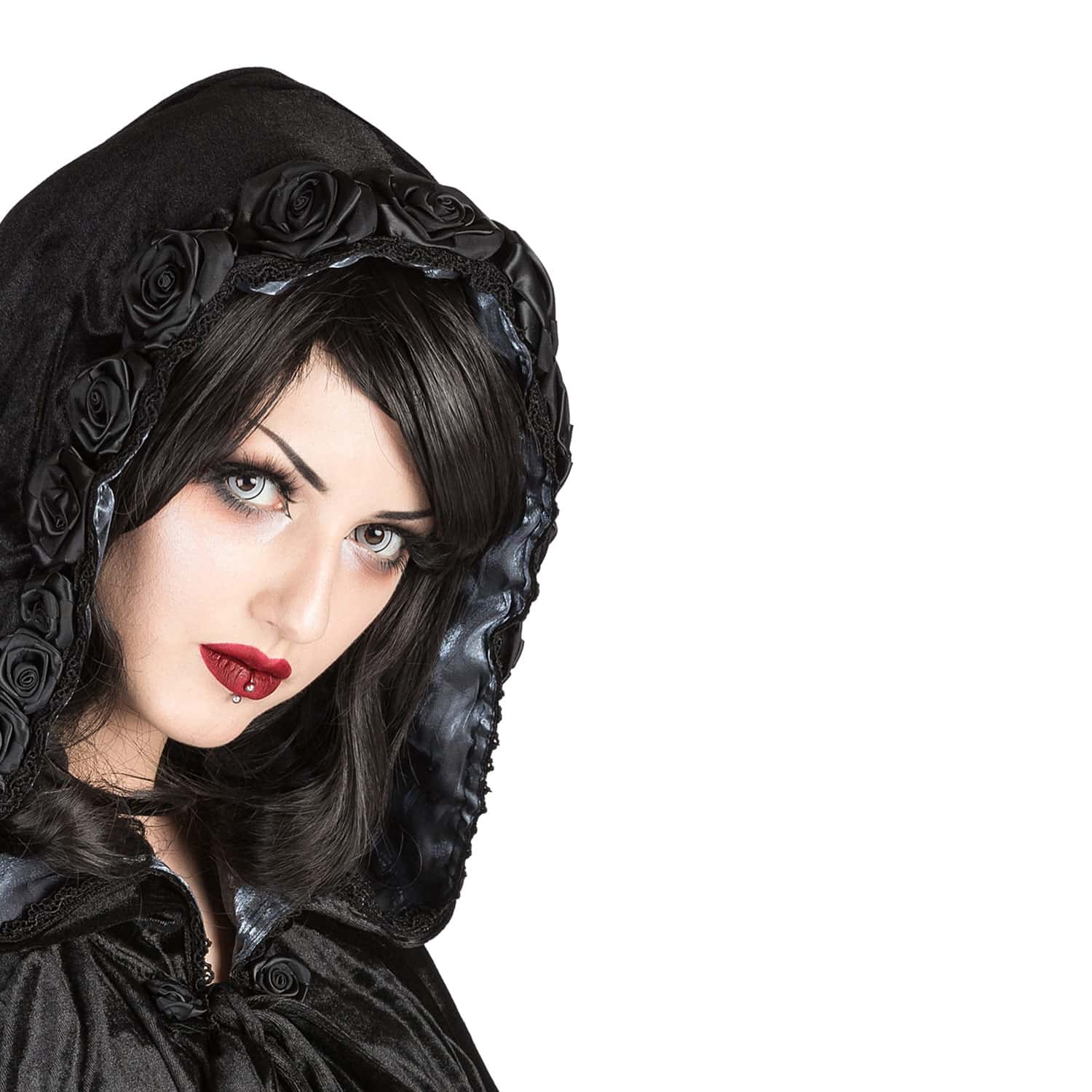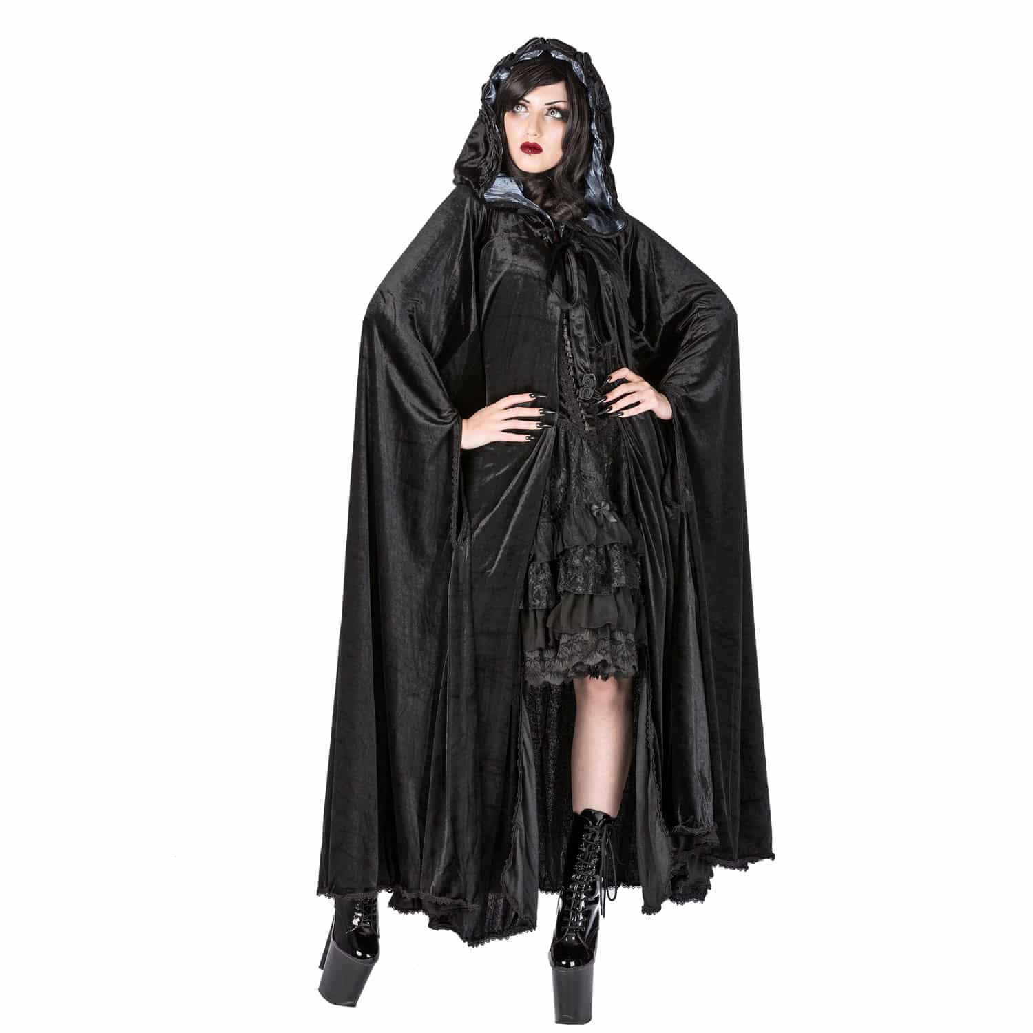Weiter Samtumhang mit rosenbesetzter Kapuze. Weit schwingend geschnitten, mit dezenter, schwarzer Spitze verziert. Kapuze mit farbigem Organza gefüttert. Vampiristisch, gotisch und geheimnisvoll.