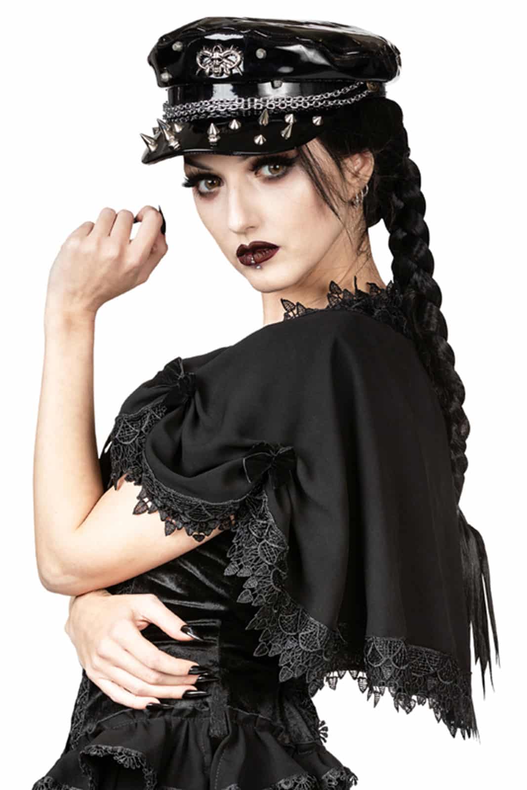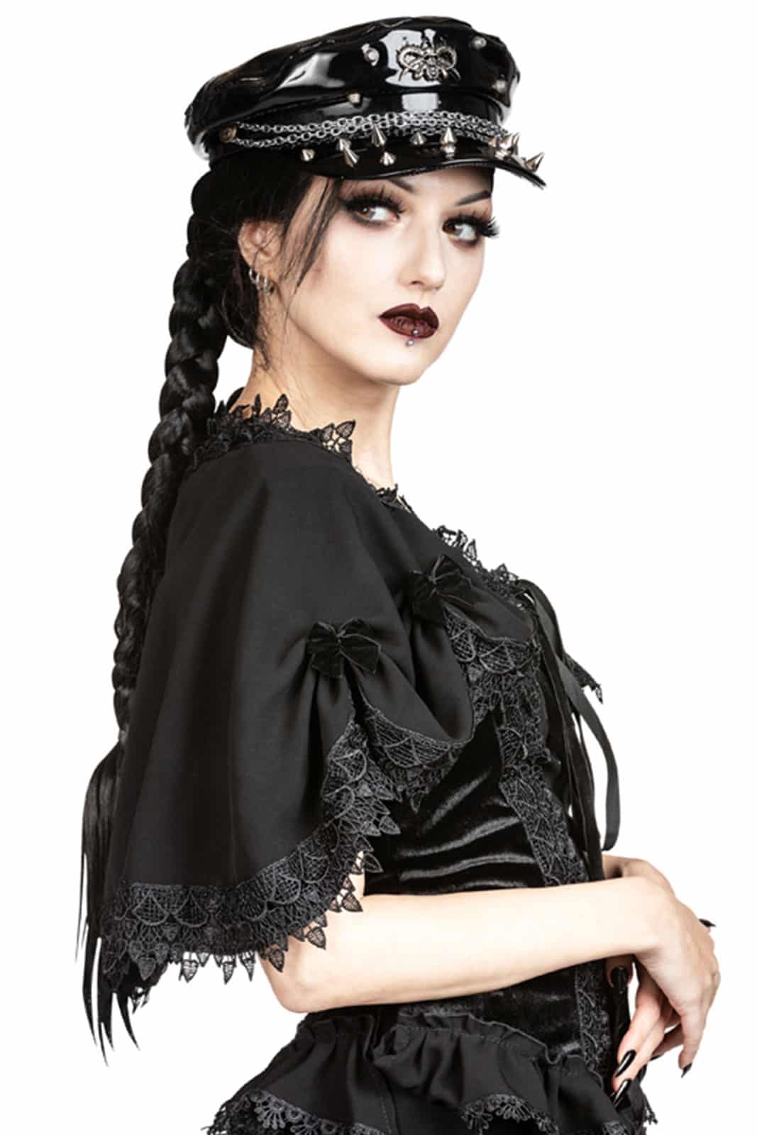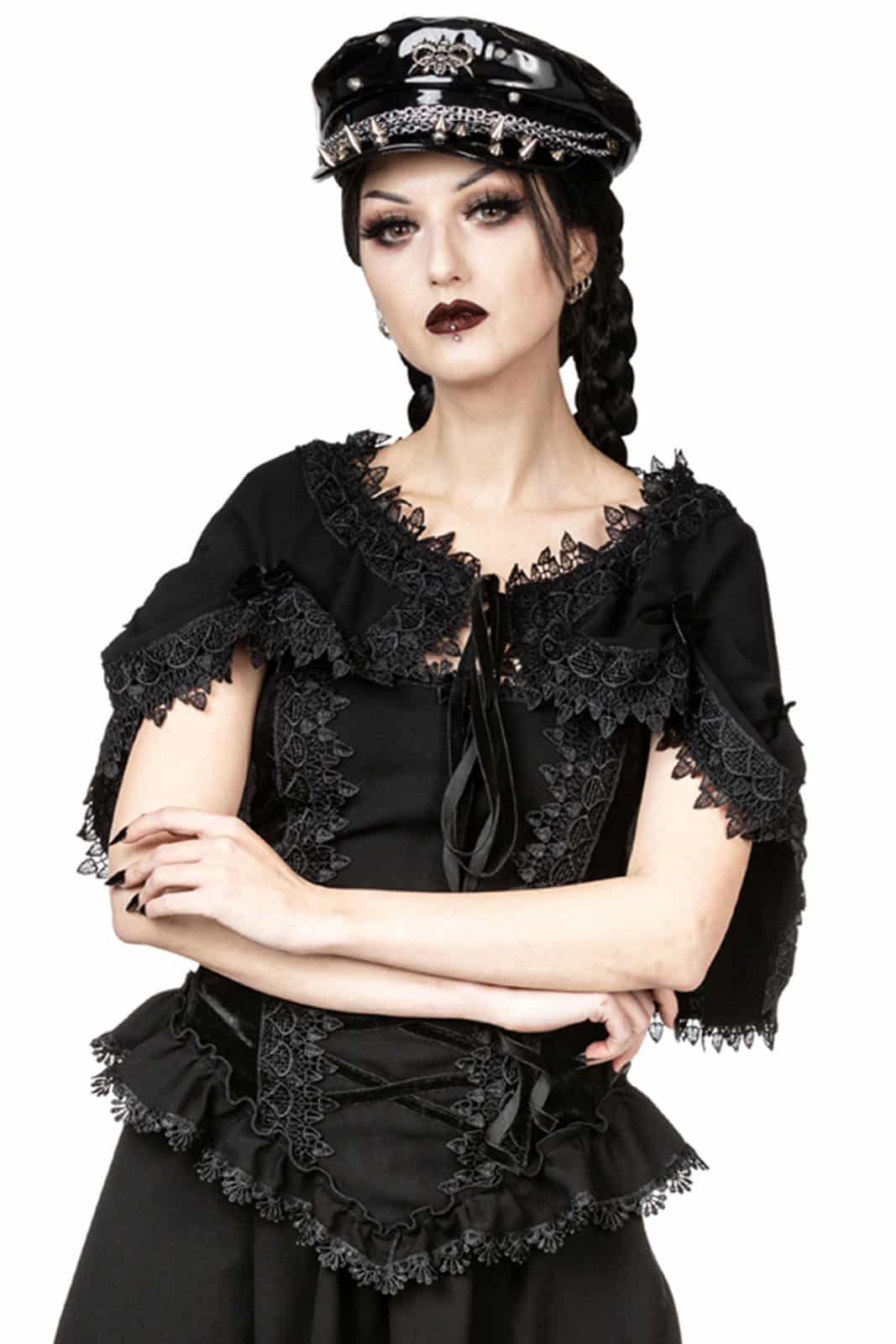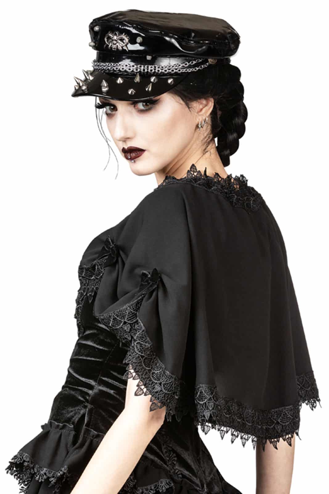 Schwarzer Twill-Umhang mit U-Ausschnitt und schwarzem Samtband als Riemenverschluss vorne. Der Twill an der Vorderseite des Umhangs ist mit großen schwarzen Samtschleifen gerafft, um eine abfallende Drapierung zu ermöglichen. Der Ausschnitt und der Saum des Umhangs sind mit schwarzer venezianischer Spitze besetzt.
