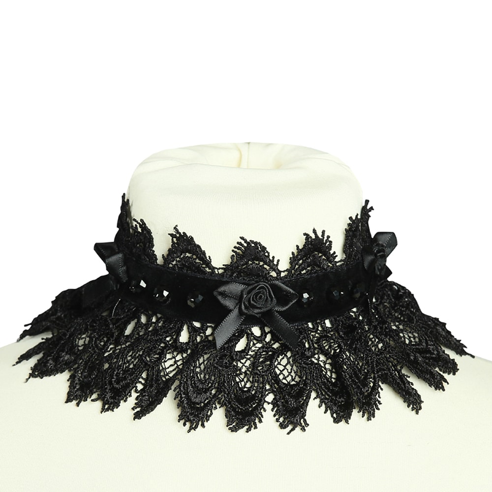 Gothic Halsband aus schwarzem Samt verziert mit einer breiten Spitzenbordüre, Satinrosen und schwarzen Perlen.