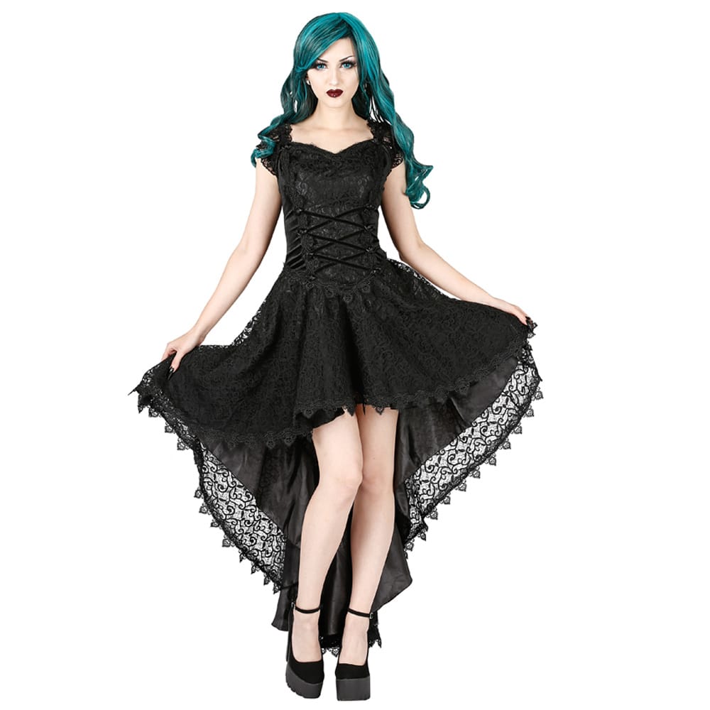 Gothic Trägerkleid aus Samt, Spitze und Satin. Vorne kurz geschitten, mit wunderschönem, schwarzen Spitzenoverlay, reich verziert mit kleinen Rosen und Spitzenbordüren. Mit breiten, elastischen Trägern aus weicher Spitze.