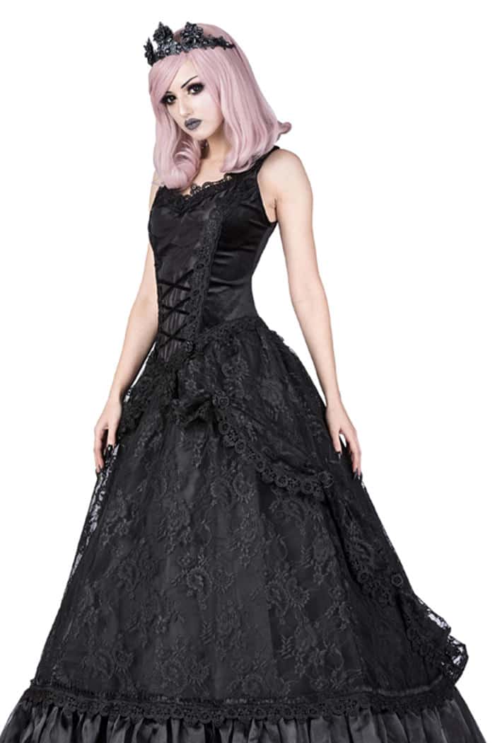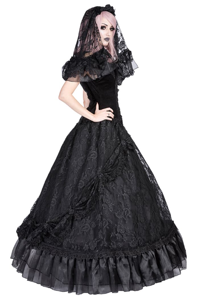 Aufwändig gestaltetes Gothic Kleid aus Samt, Spitze und Tüll. Das ärmellose Oberteil aus weichem Samt weist Satineinsätze mit glänzenden Organza-Overlays auf und ist vorne im unteren Bereich mit schmalen Samtbändern versehen. Das Rockteil besteht aus einer Lage festen Tülls und sorgt für ausladendes Volumen. Darüber finden sich zwei Lagen aus edler Spitze mit Rosen- und Paisleymotiven. Eine dieser Lagen ist mit kleinen Satinrosen gerafft, die andere mit einem wunderschön glänzenden Volant aus Organza versehen. Beide Stofflagen sind mit Spitzenbordüren verziert. Ausgestattet mit Satinfutter.