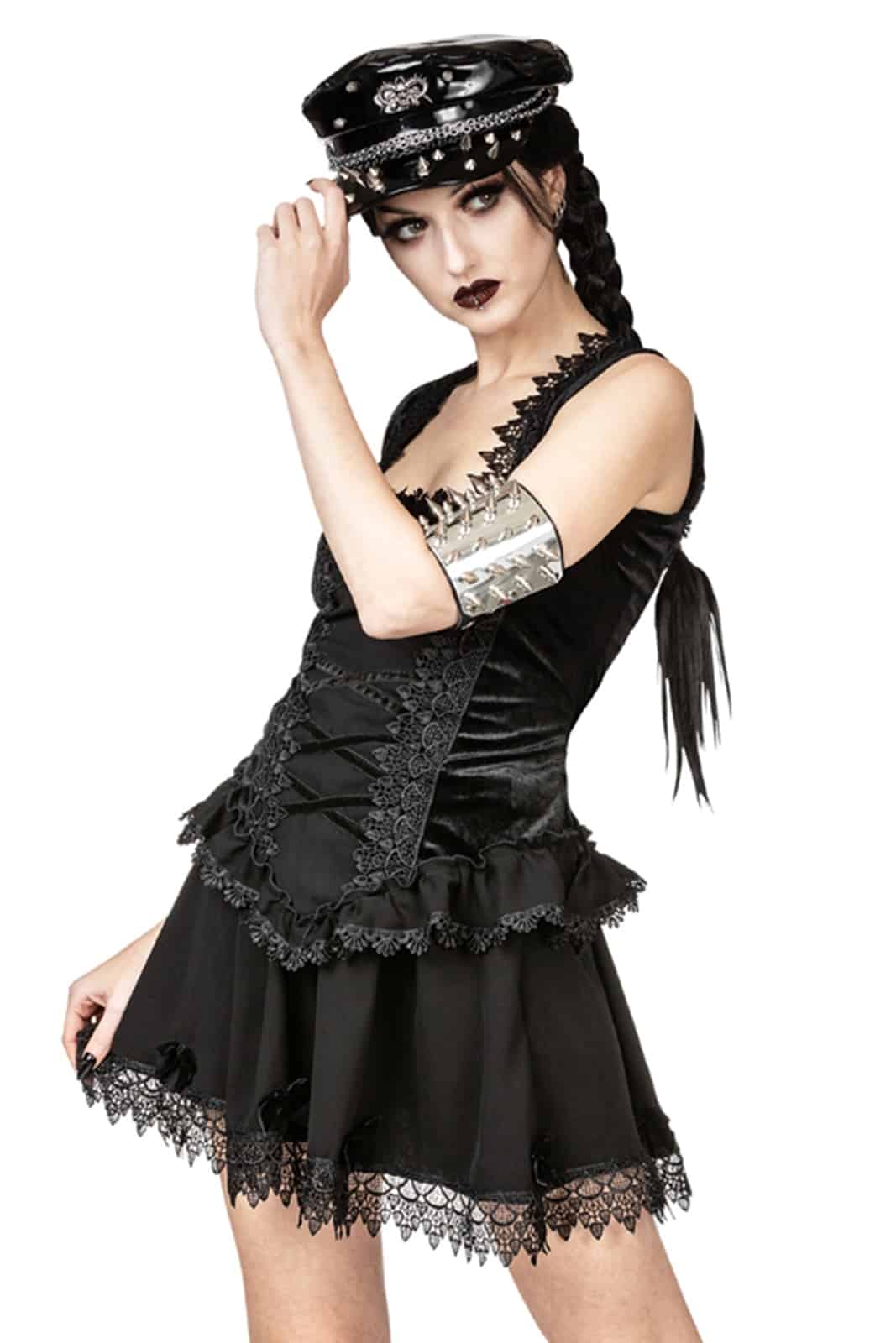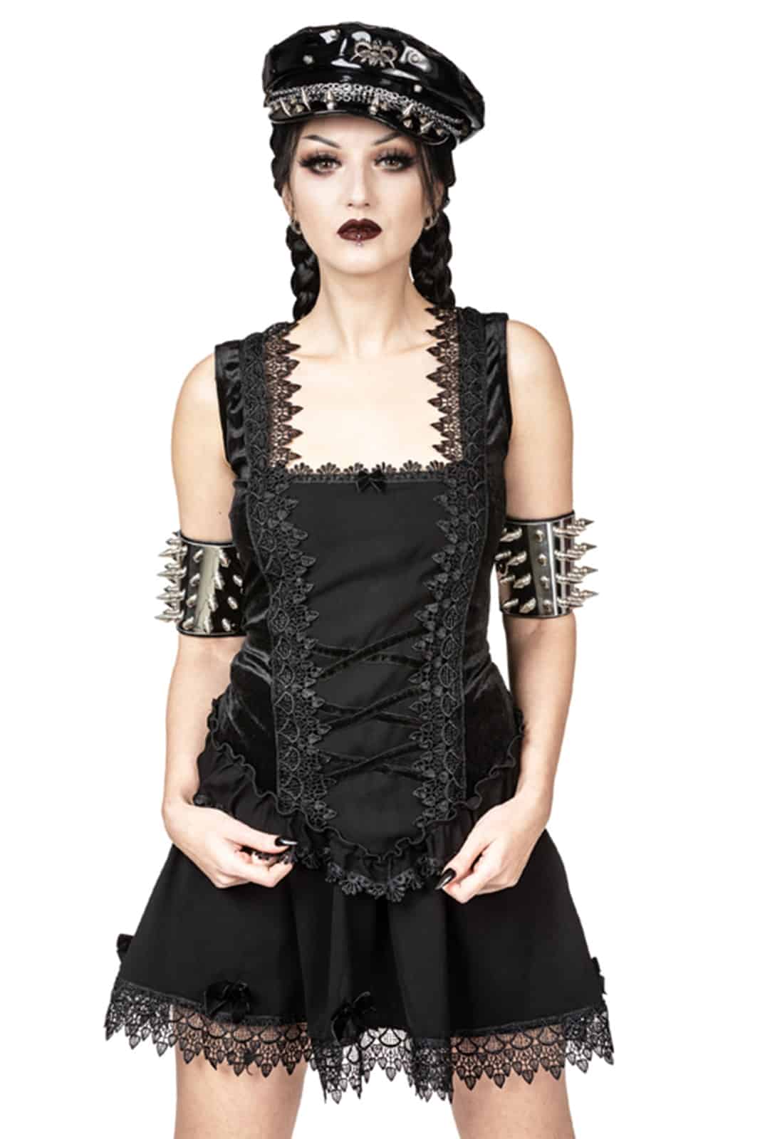 Schwarzer Gothic-Lolita-Minirock aus Twill mit elastischem Bund und verstecktem Reißverschluss an der Seite für eine perfekte Passform. Am Saum ist der weite, fließende Minirock mit schwarzem venezianischem Spitzenbesatz und großen schwarzen Samtschleifen verziert.