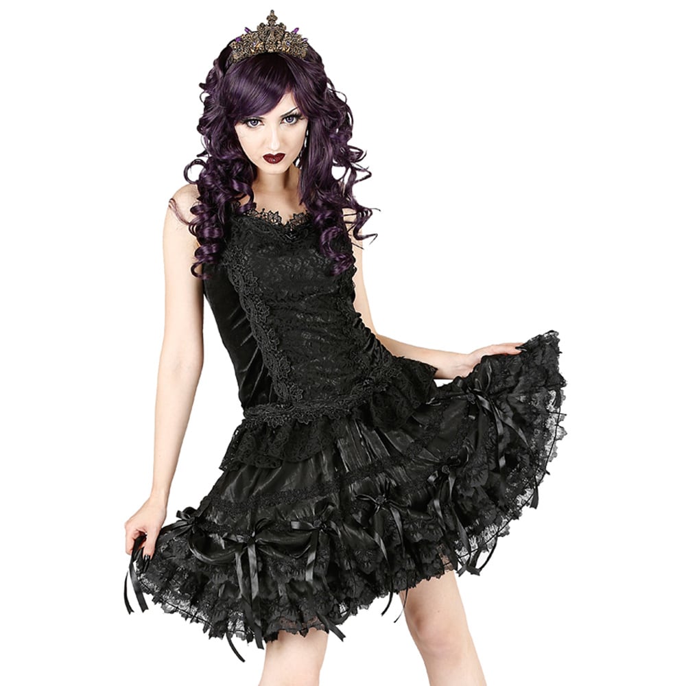Klassischer, mehrlagiger Gothic Minirock aus schwarzem Organza. Verziert mit üppigen Spitzenrüschen, Schleifen und Rosen. Ausgestattet mit bequemem Gummizugbund.