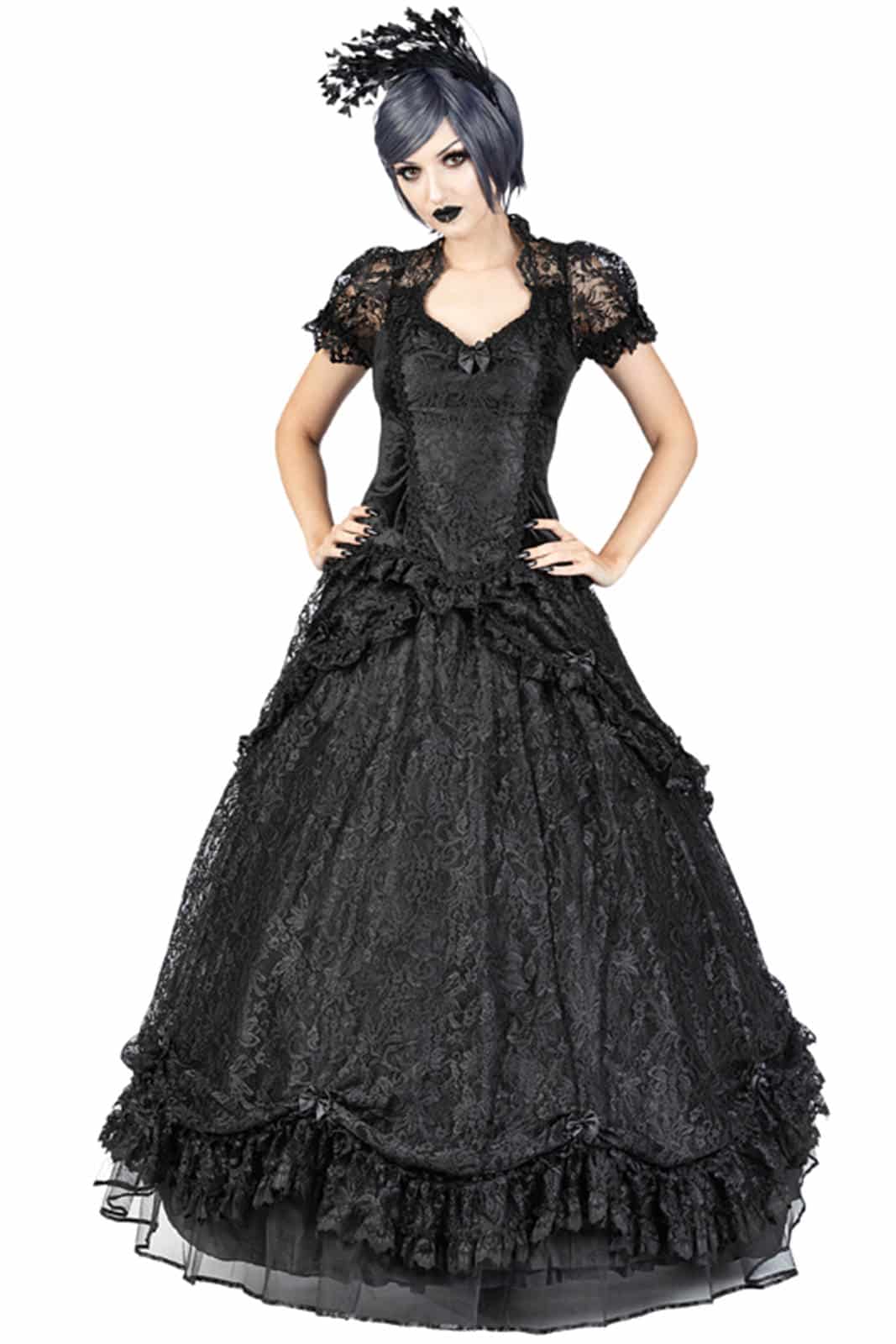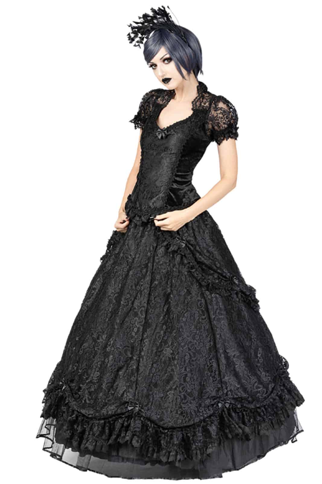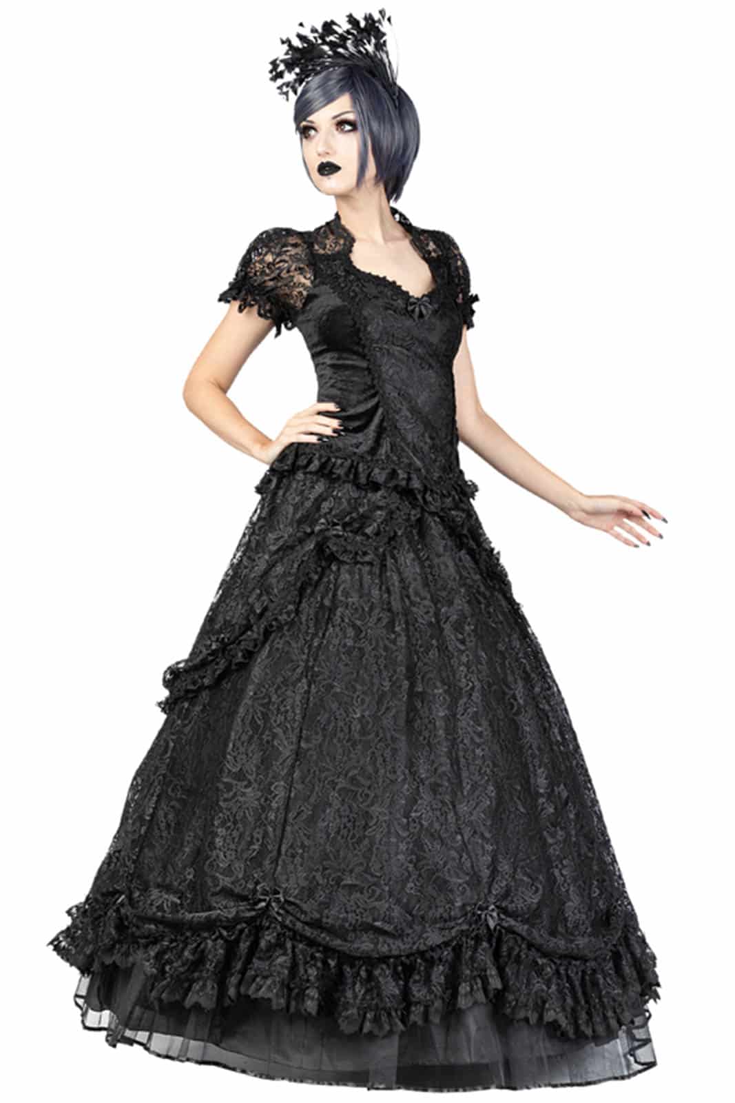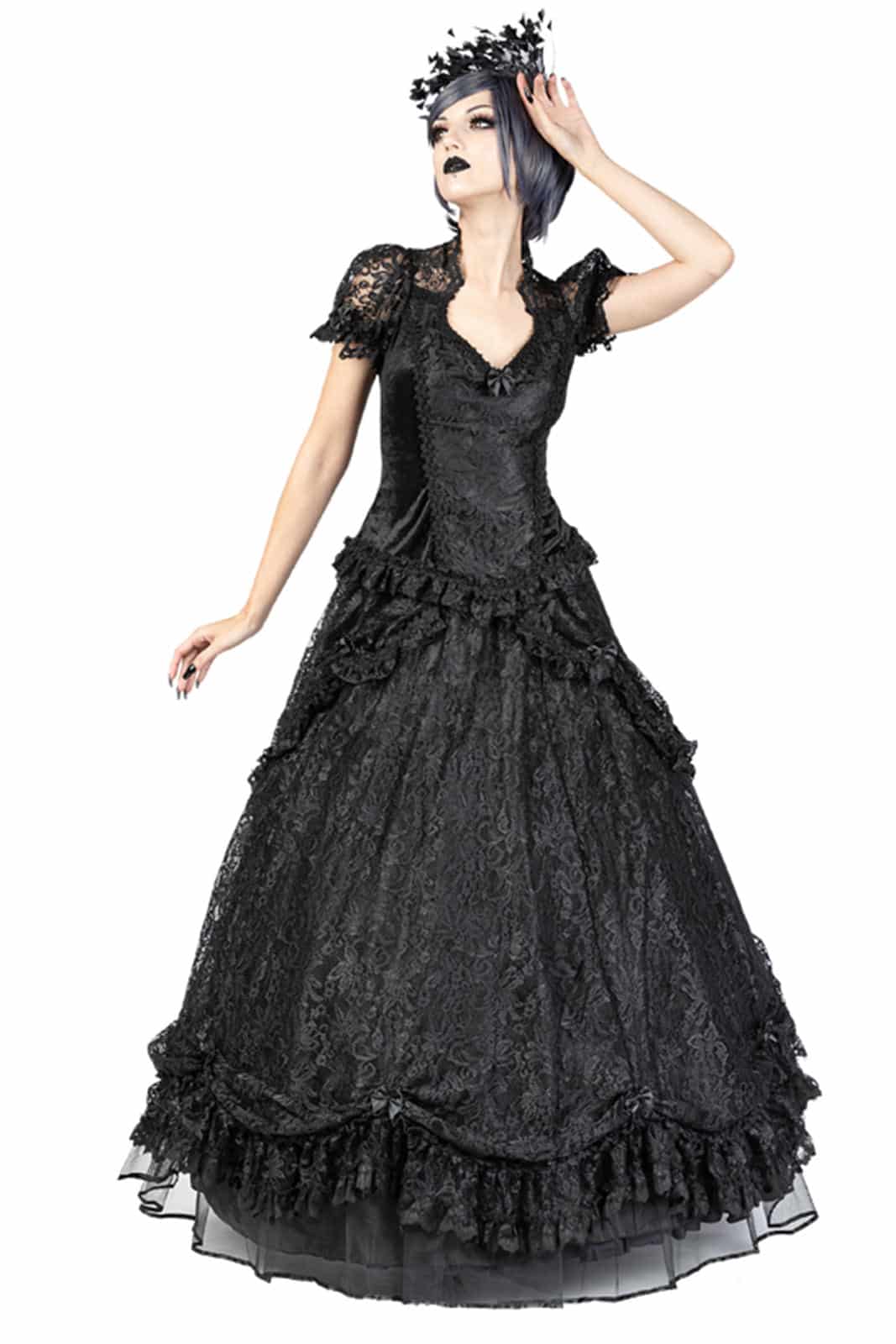 Mehrlagiger viktorianischer Rock aus venezianischer Spitze. Dieser Spitzenrock hat einen klassischen Spitzenüberzug mit absteigender Drapierung von vorne nach hinten, wird von großen Satinschleifen gerafft und mit einer schwarzen Spitzenrüsche verziert, die mit venezianischer Spitze eingefasst ist. Das seidig weiche Futter hat im unteren Teil eine breite Lage aus steiferem Tüll, um ein volles Volumen zu schaffen. Am unteren Ende des Spitzenrocks ist eine breite Reihe von Spitzendrapierungen geschmückt, die von schwarzen Satinschleifen gerafft und mit schwarzer Venetain-Spitze besetzt sind. Der Rock hat einen elastischen Bund für eine bequeme Passform und einen verdeckten Reißverschluss an der Seite.