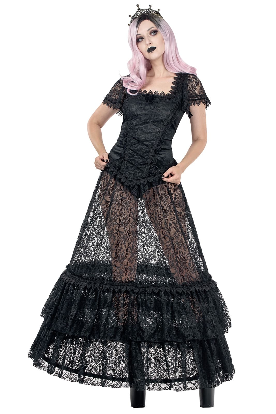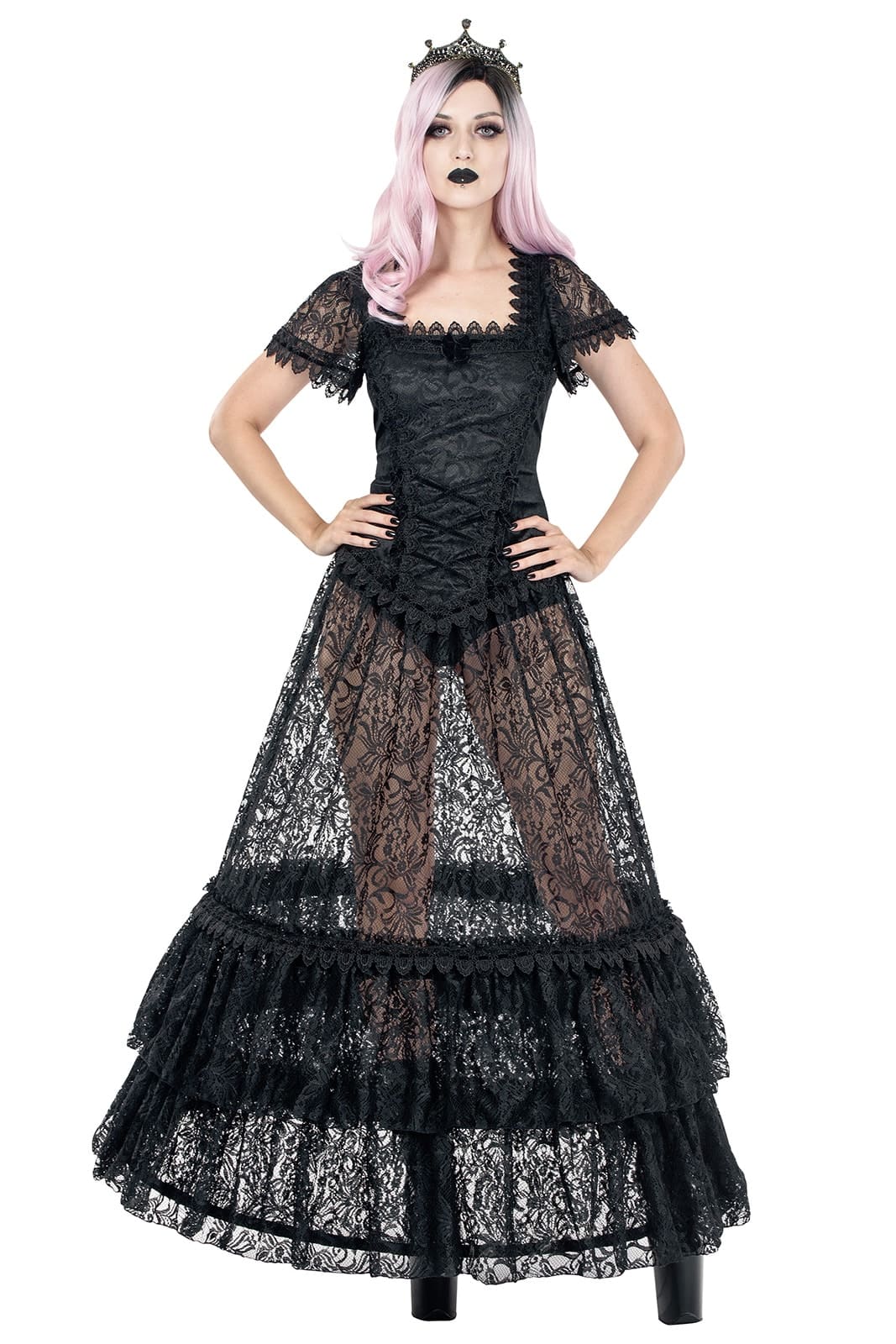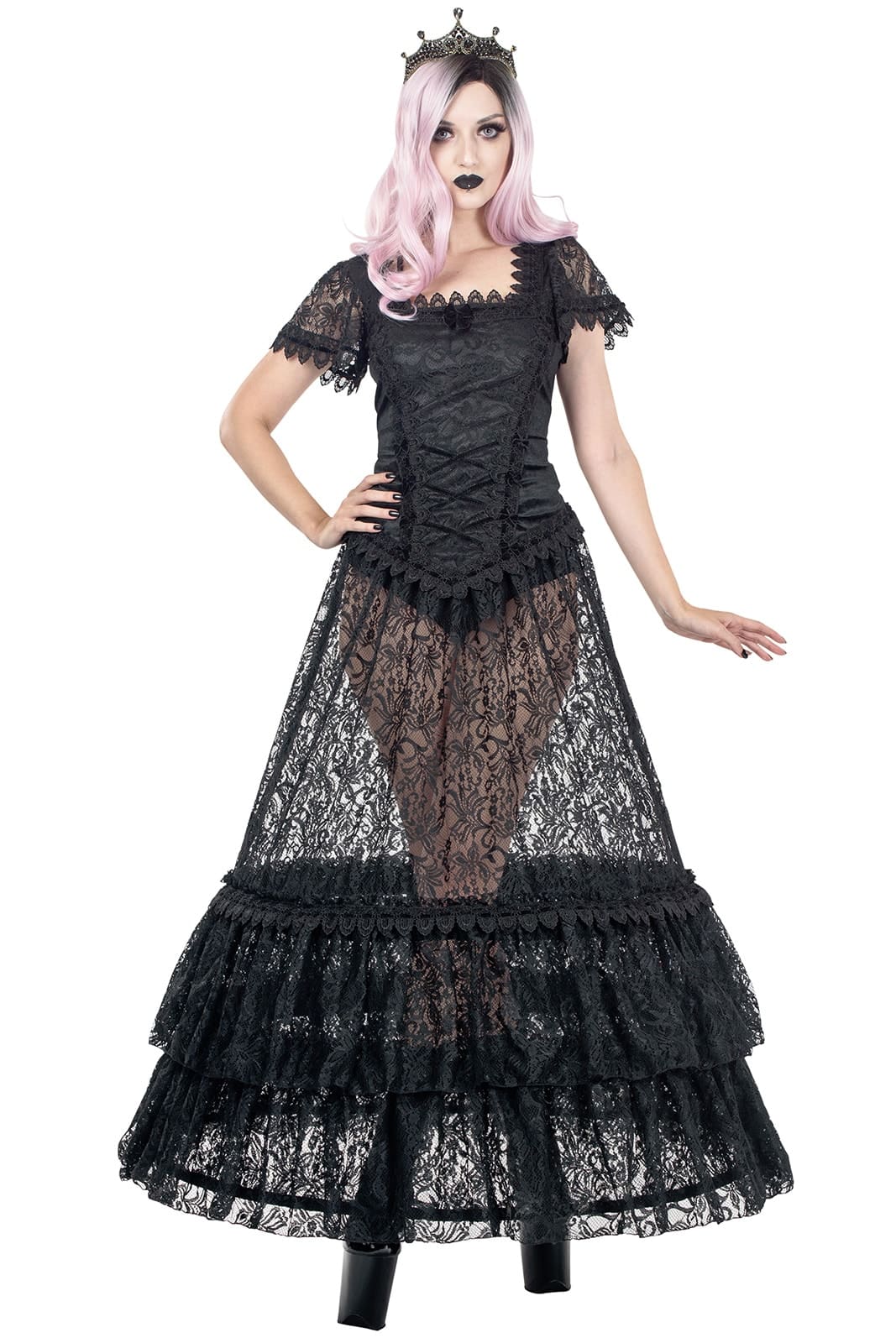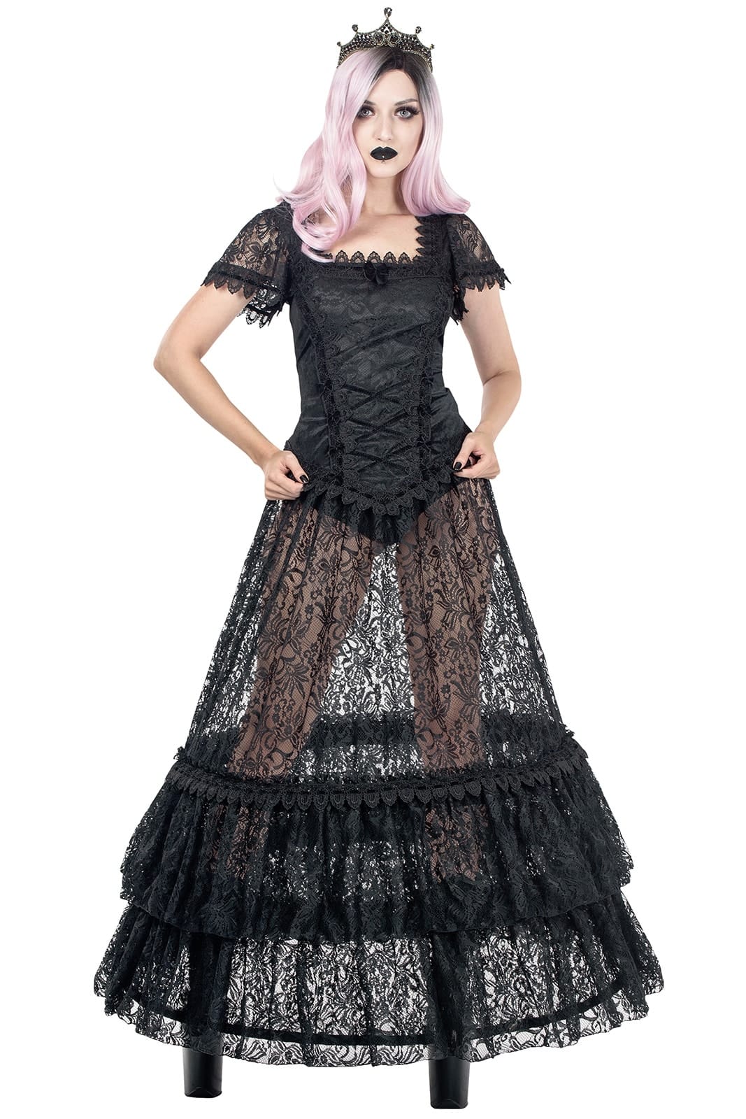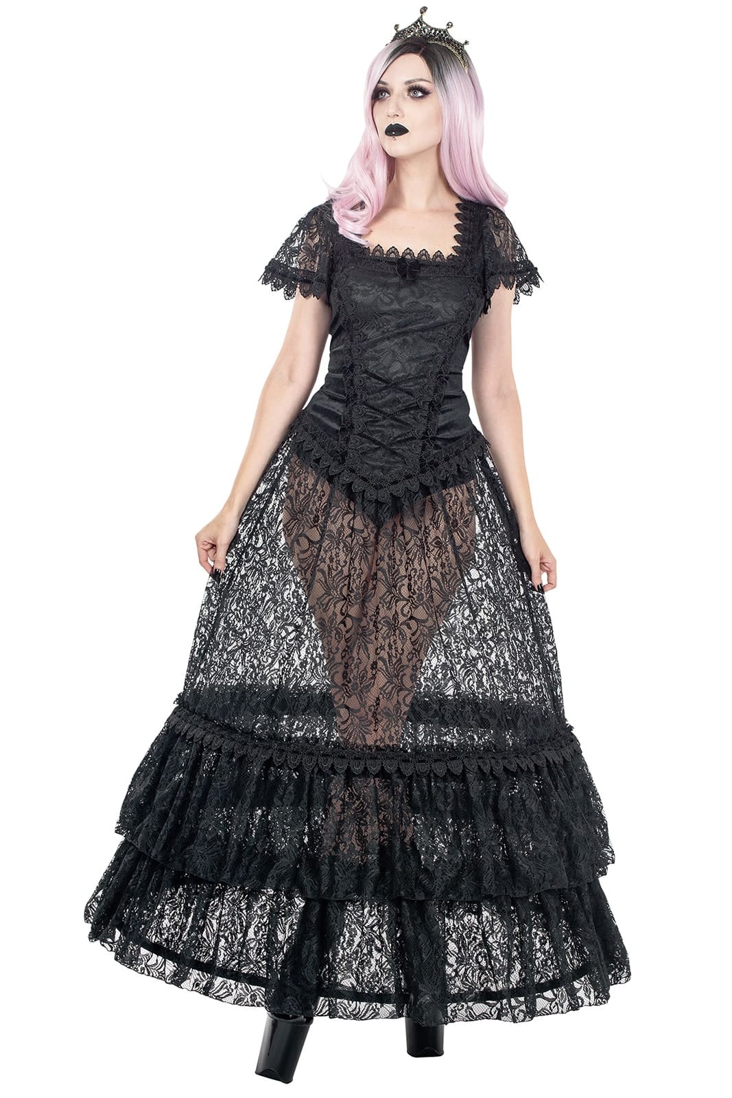 Schwarzer Reifrock aus sizilianischer Spitze, elastischer Bund für perfekte Passform und verdeckter Reißverschluss an der Seite. Die Krinoline verfügt über drei Stahlringstangen für einen starken Spreizeffekt. Der untere Teil des Rocks ist mit zwei breiten, gerüschten Stufen aus sizilianischer Spitze verziert. Jede Etage ist mit einer schwarzen Samtbandschnürung durch Brokat-Spitzenbesatz verziert. Ideal, um Röcken und Kleidern mehr Weite und Volumen zu verleihen.