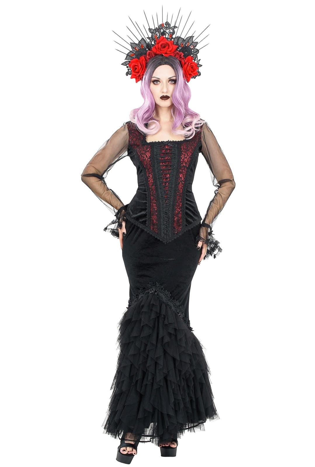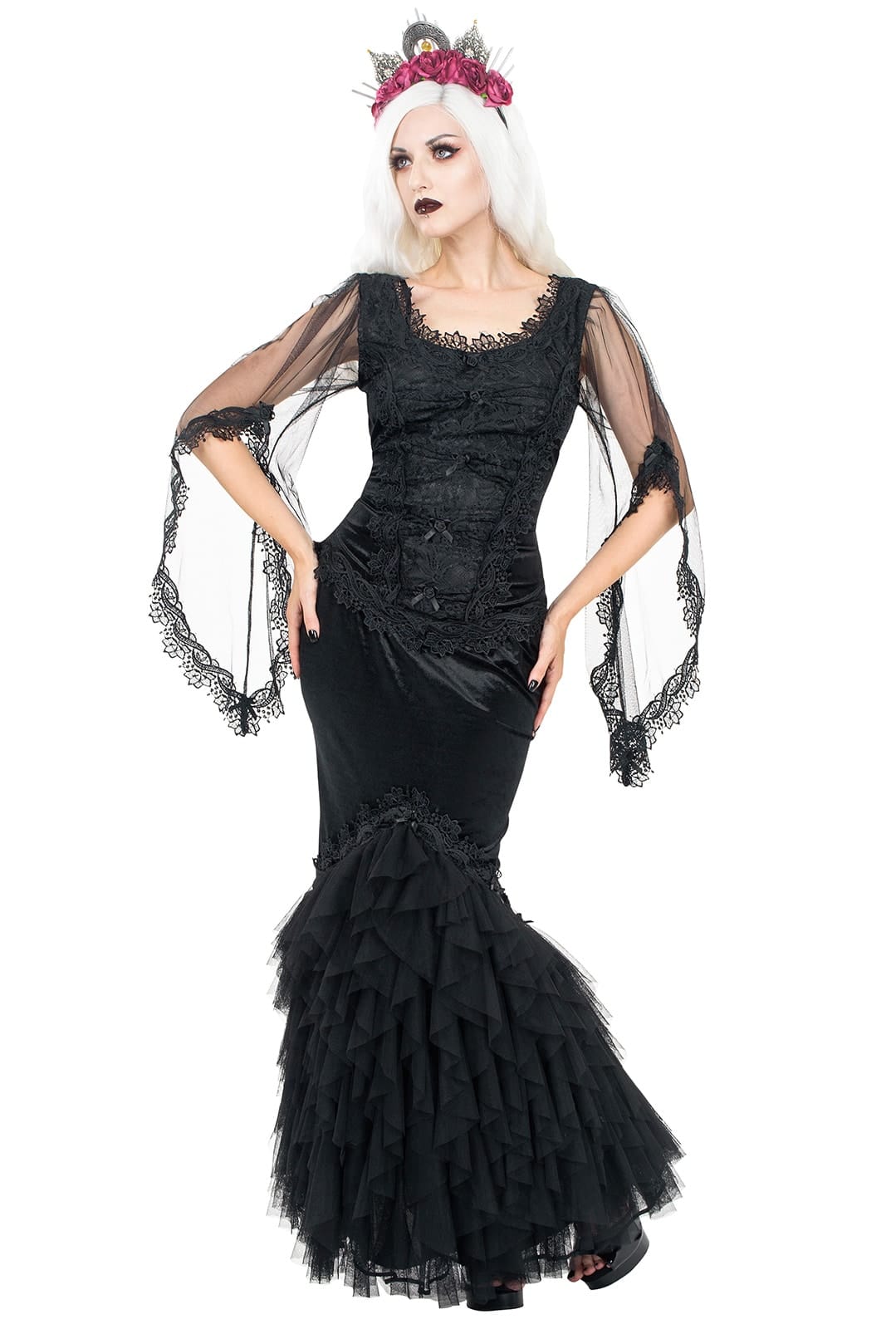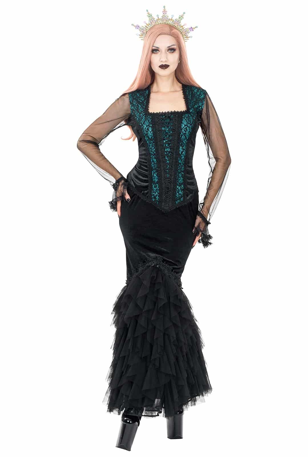 Eleganter Samt-Mermaid-Rock mit dramatischer Mesh-Fishtail-Silhouette und opulenten Verzierungen – ein mystisch wirkendes Statement für besondere Momente.