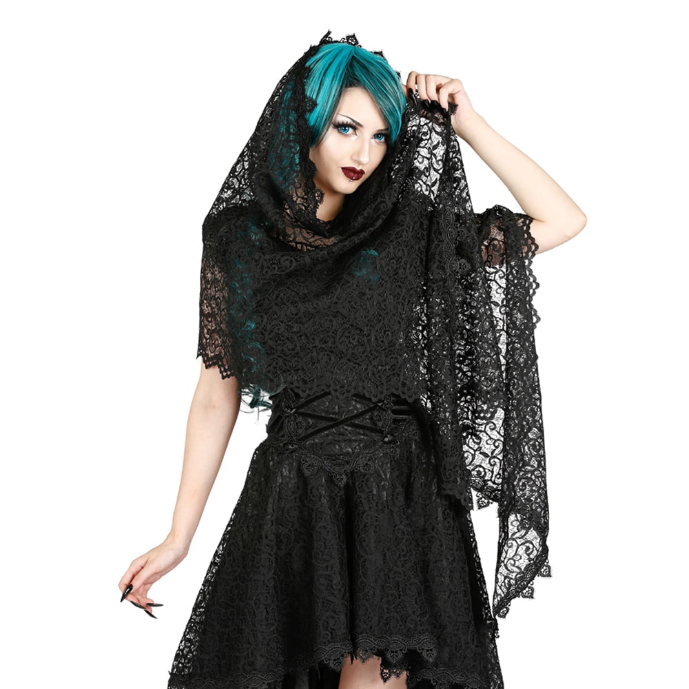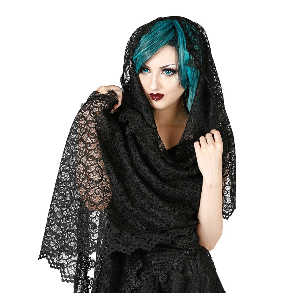 Breites Schaltuch aus wunderschöner, schwarzer Spitze, verziert mit zwei kleinen Satinrosen.
