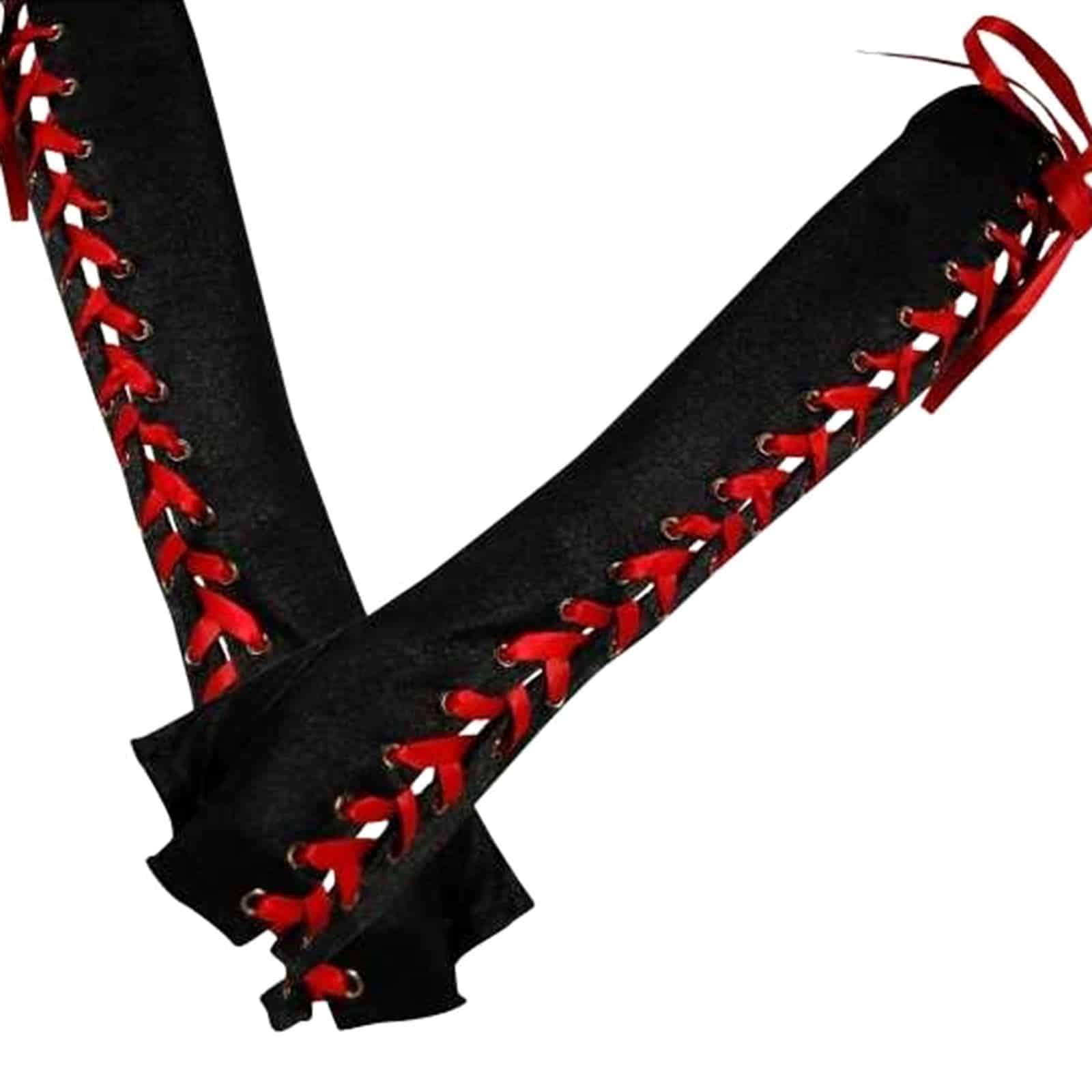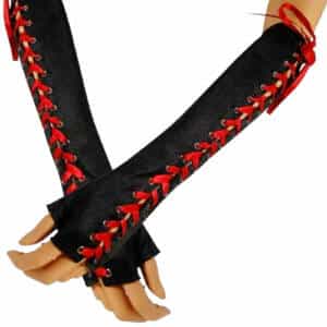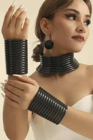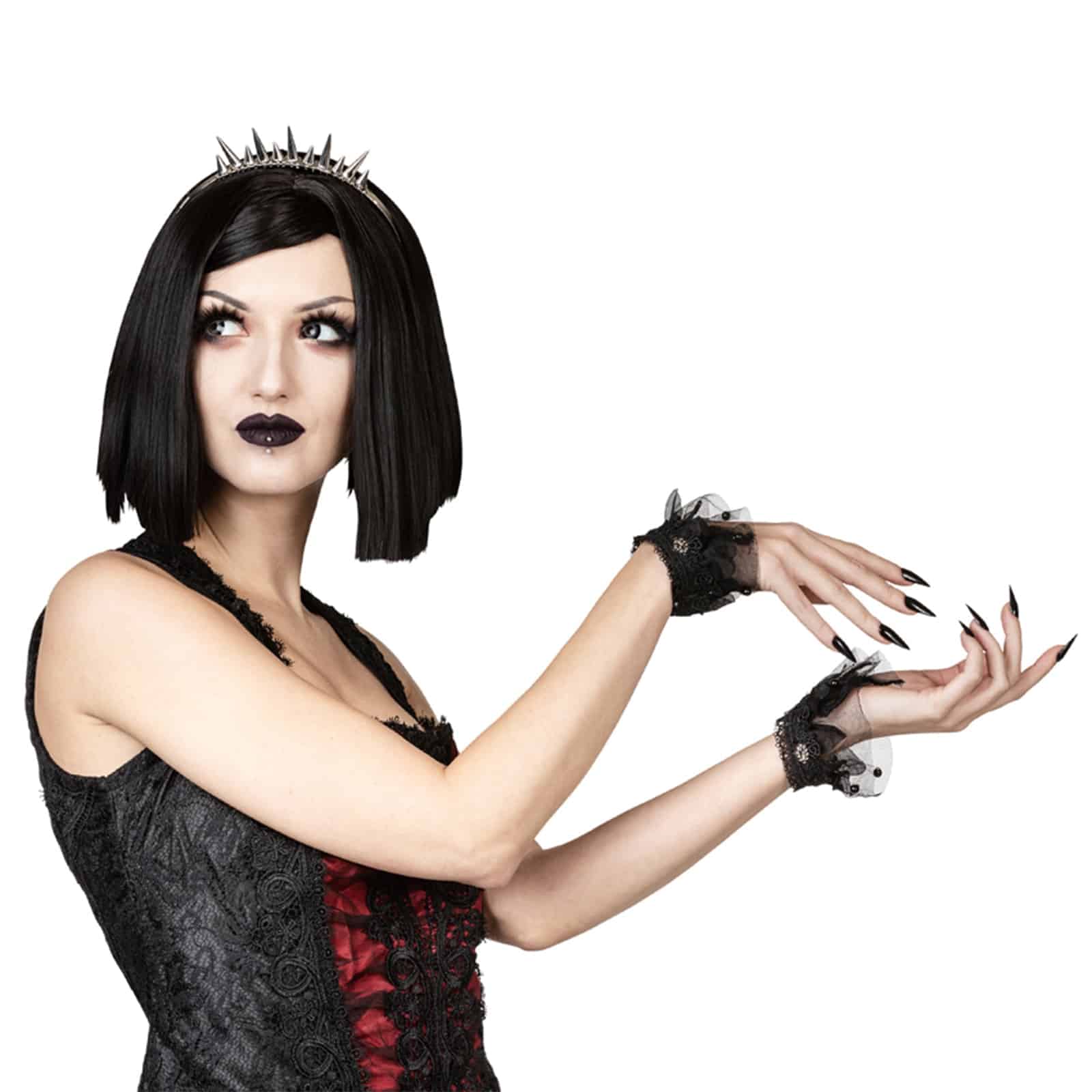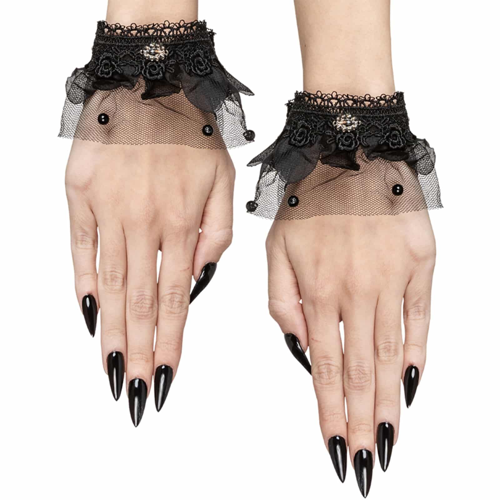 Diese eleganten Gothic-Manschetten verleihen jedem Outfit einen feinen, düster-romantischen Akzent. Zarte, blütenförmige venezianische Spitze trifft auf schimmernde Zierelemente und einen raffinierten Mesh-Rüschenbesatz. Schwarze Perlen und organzaförmige Blattelemente sorgen für Tiefe und eine edle, fast viktorianische Ausstrahlung – perfekt als stilvolles Detail zu Kleidern, Tops oder Corsagen.