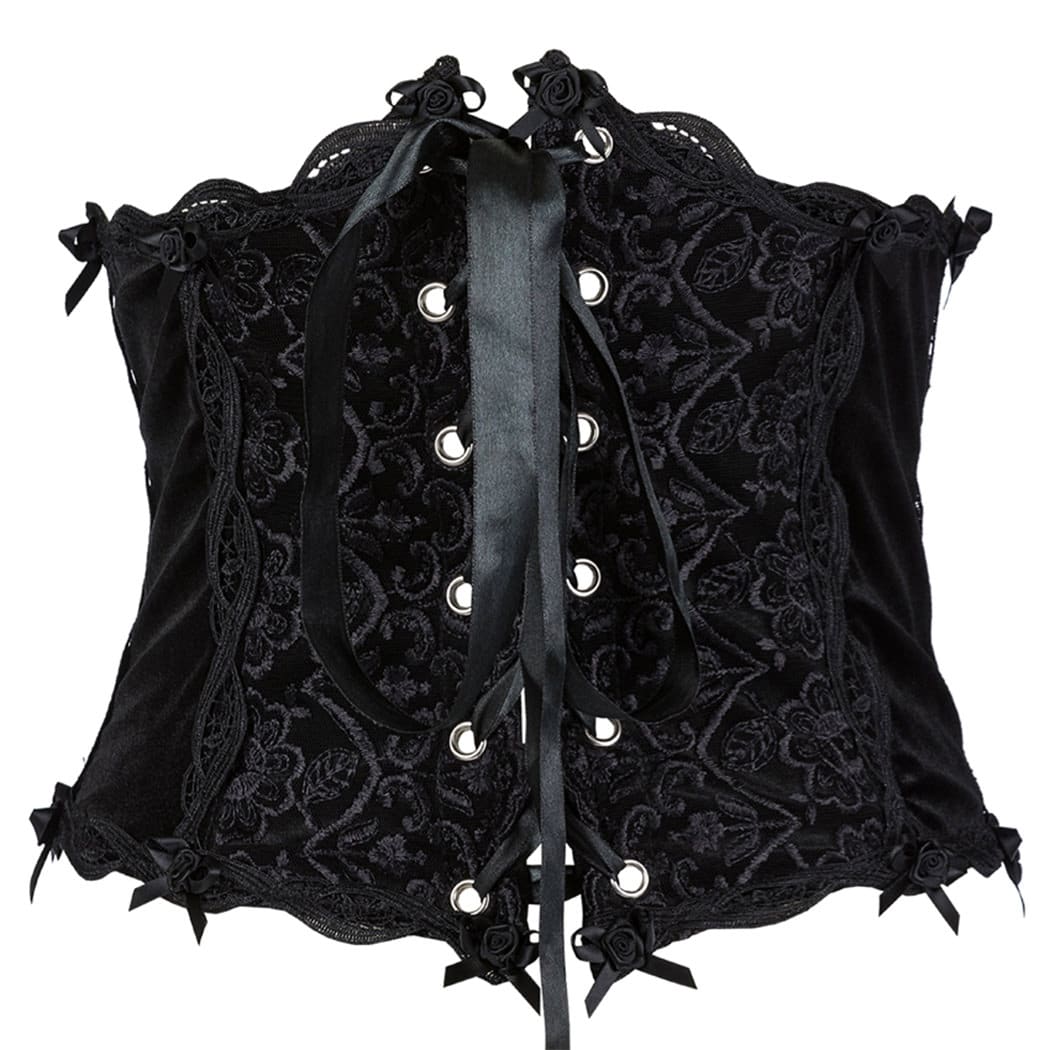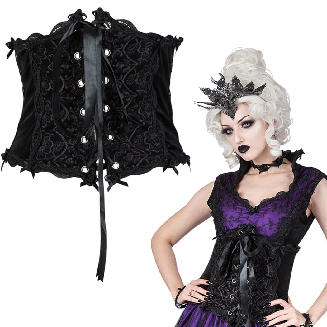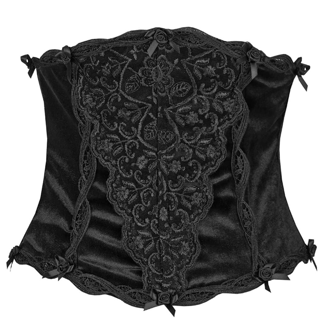 Leichtes Unterbrustkorsett aus Samt mit Kunststoff-Stäbchen und Frontschnürung. Verziert mit floralen Stickereien, Satinschleichen, Satinrosen und wunderschönen Spitzenbordüren.