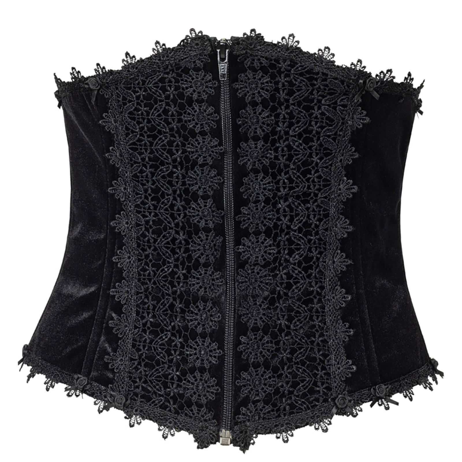 Klassisches schwarzes Gothic-Unterbrustkorsett aus Samt mit einem breiten Brokatspitzenbesatz an beiden Seiten der Metallösen. Die schwarze Satinbandschnürung durch die Metallösen kann sowohl vorne als auch hinten getragen werden. Die Rückseite des Wespenkorsetts ist mit zwei Reihen breiten Brokatspitzenbesatzes verziert, die in der Mitte durch einen Reißverschluss getrennt sind. Beide Säume sind mit schwarzem venezianischem Spitzenbesatz verziert und mit mehreren kleinen Satinschleifen, die jeweils mit einer Satinblume bedeckt sind, verziert. Die Unterbrust ist mit seidig weichem Satin gefüttert und mit flexiblen Kunststoffstäbchen versehen.
