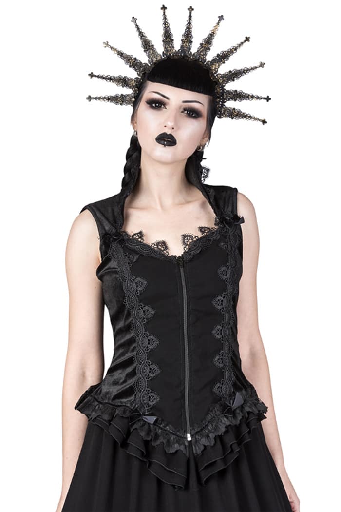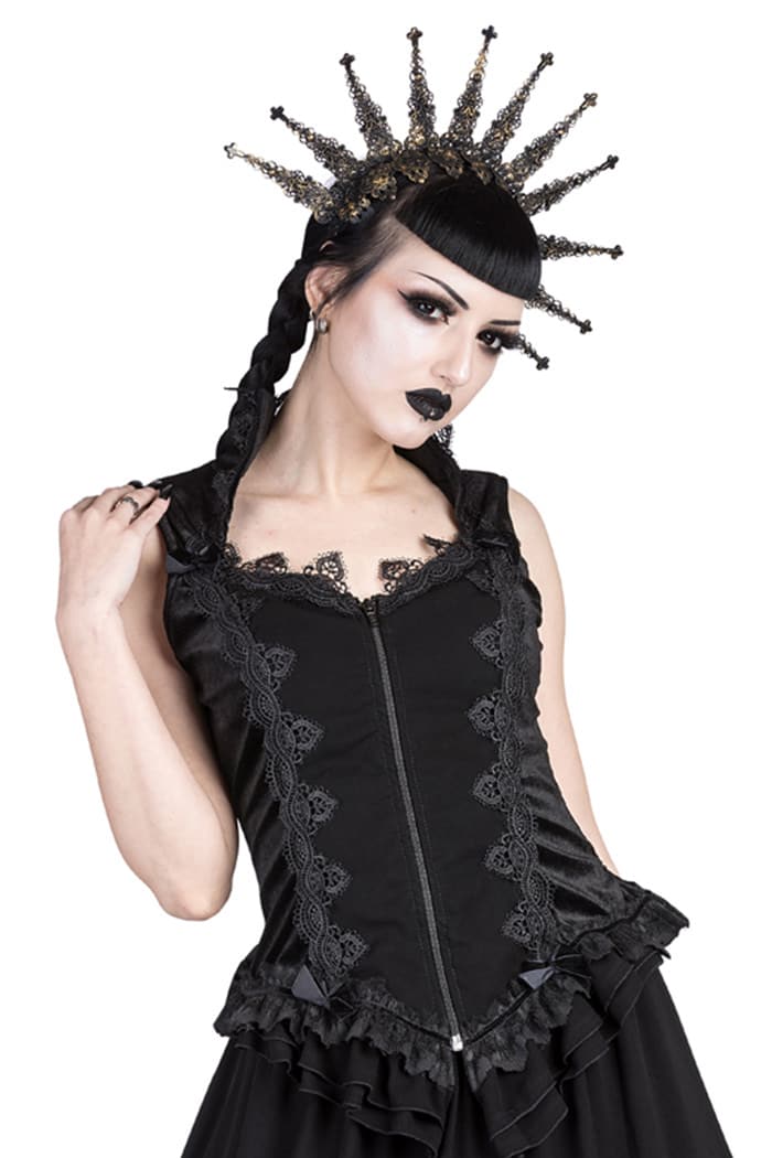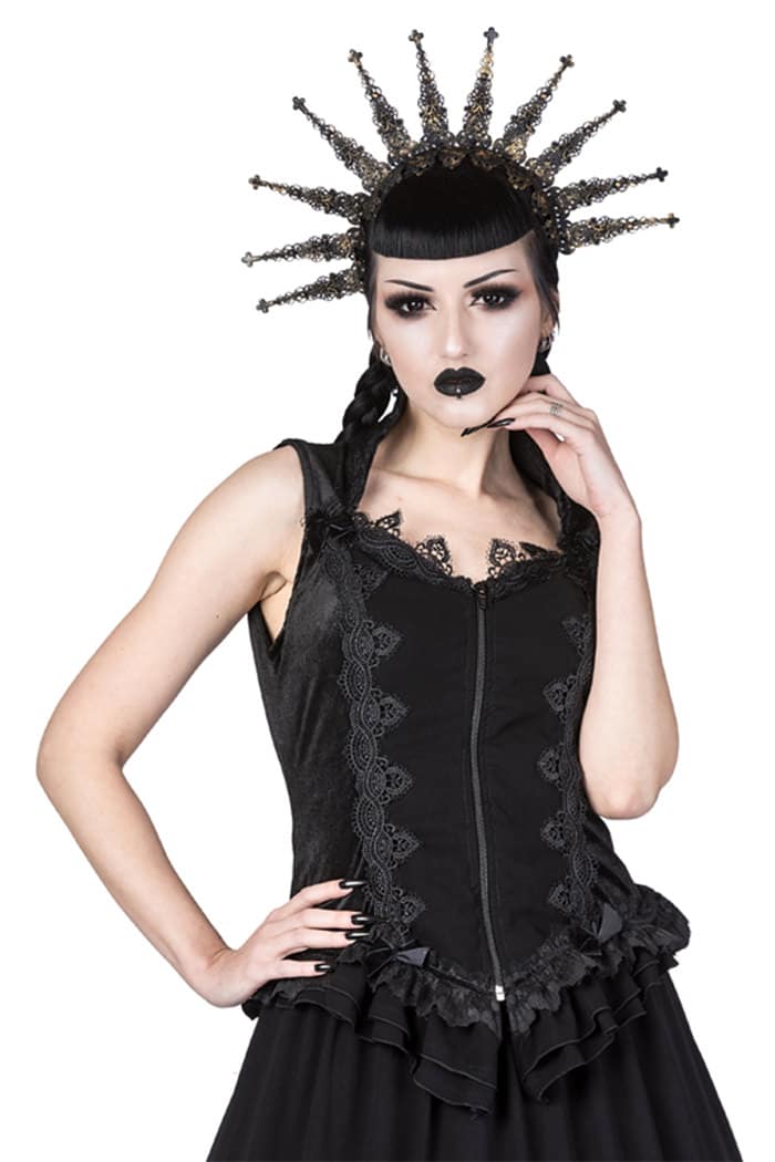 Edles ärmelloses Gothic Top aus weichem Samt mit Vampirkragen. Der Saum ist seitlich geschlitzt und mit Rüschen versehen. Reich verziert mit luxuriösen Spitzenbordüren und schmalen Samtbändern. Ausgestattet mit Frontreißverschluß.