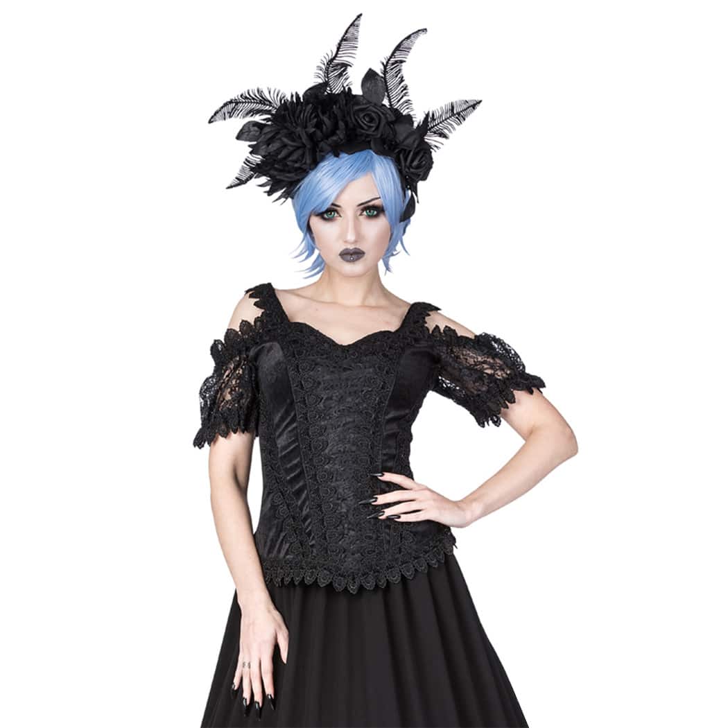 Schulterfreies Gothic Top aus Samt und Satin, edel verziert mit Spitze und Samtbändern. Ausgestattet mit Reißverschluß im Rücken.