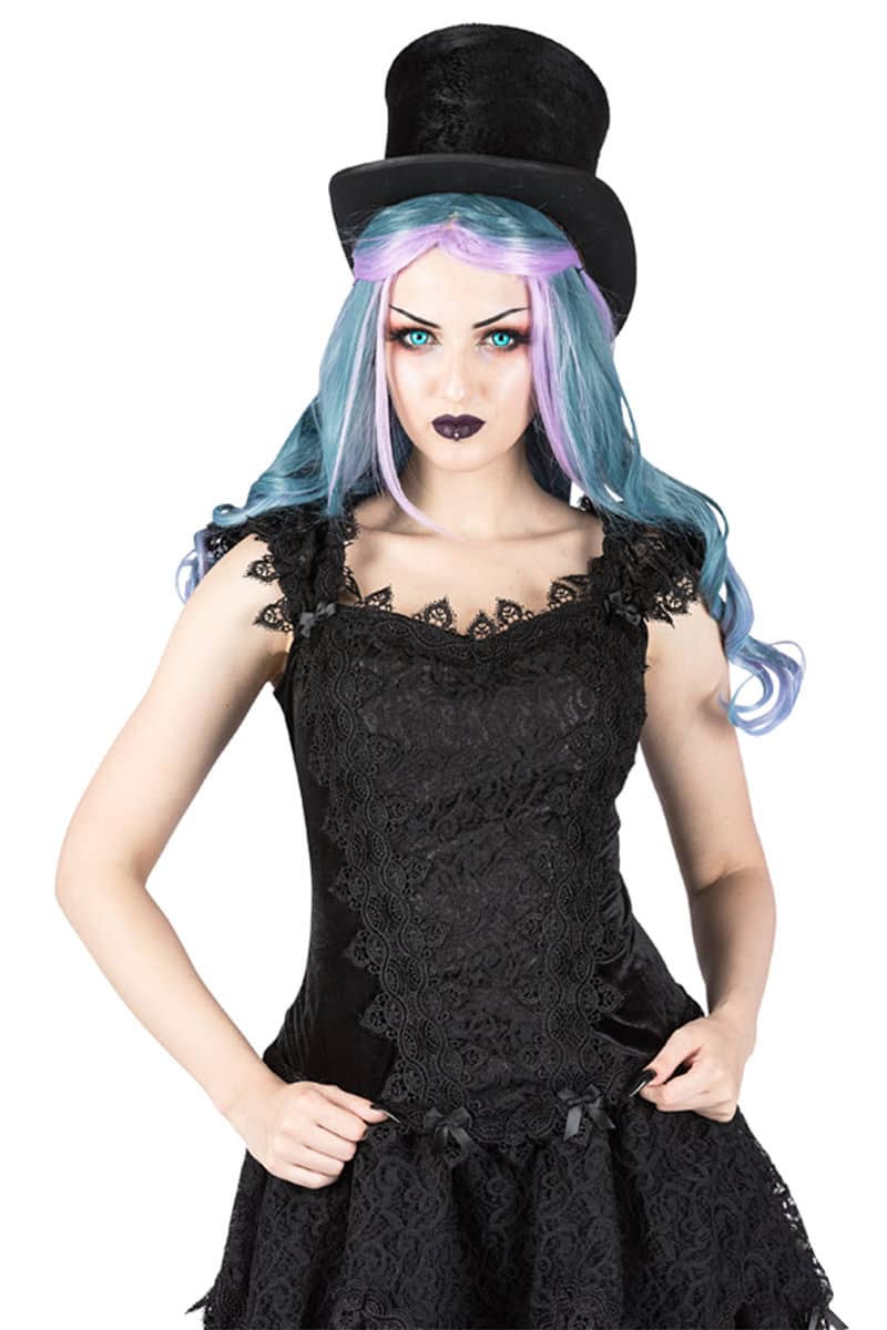Edles ärmelloses Gothic Top mit Diamantausschnitt und elastischen Schulterträgern. Die Vorder- und Rückseite aus Satin ist mit französischer Spitze überzogen und mit venzianischer Spitze besetzt.