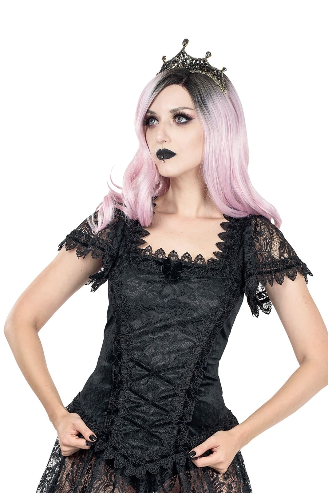 Schwarzes Gothic-Top aus Samt mit Flügelärmeln aus sizilianischer Spitze und quadratischem Ausschnitt. Der vordere Satineinsatz in der Mitte ist mit sizilianischer Spitze überzogen und mit einer kreuz und quer verlaufenden Samtbandapplikation versehen. Sowohl die Vorder- als auch die Rückseite des Oberteils sind reich mit schwarzem Samtband besetzt, das durch Brokat geschnürt ist. Vorne am Oberteil sind schwarze Samtschleifen angebracht. Reißverschluss in der Mitte hinten.