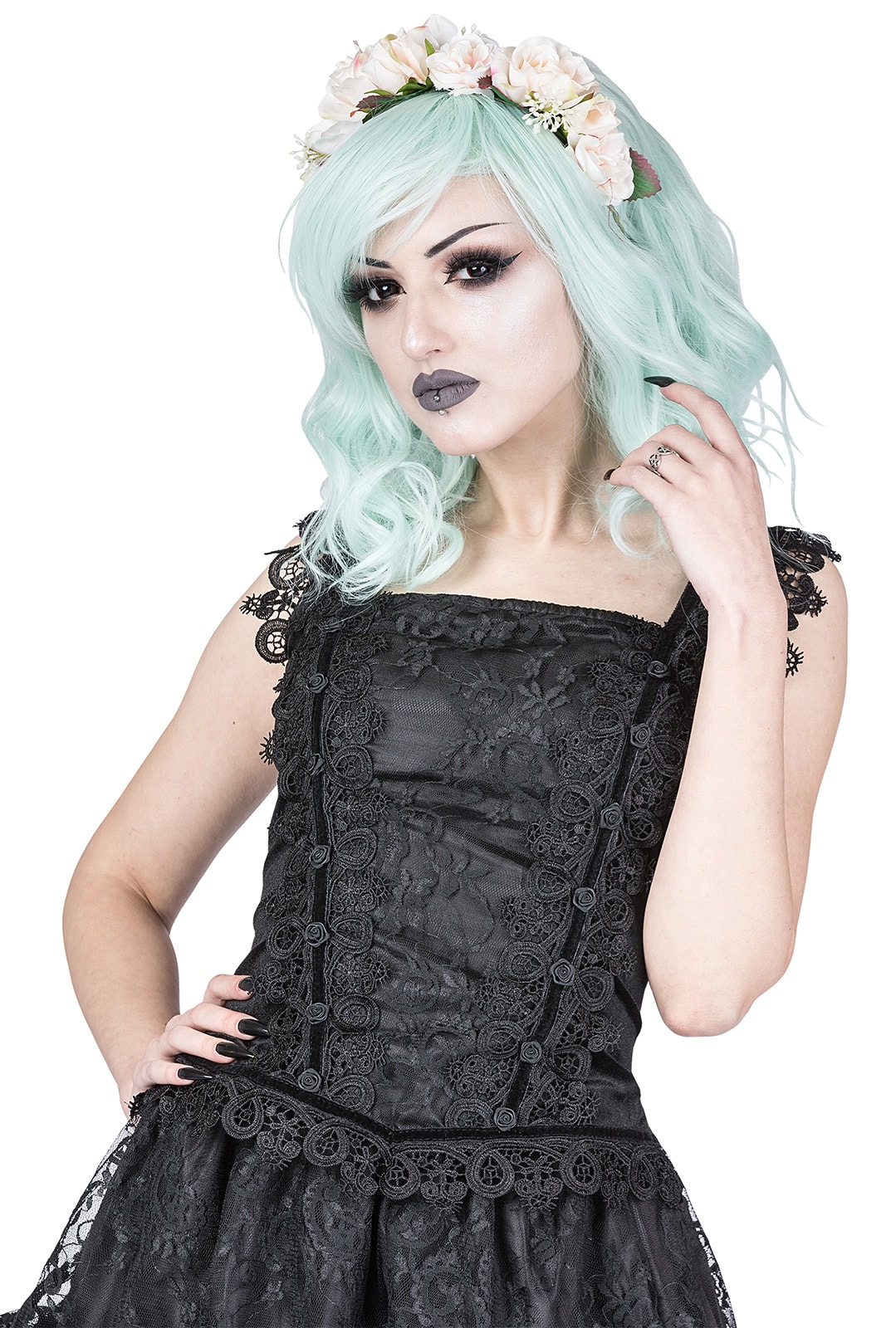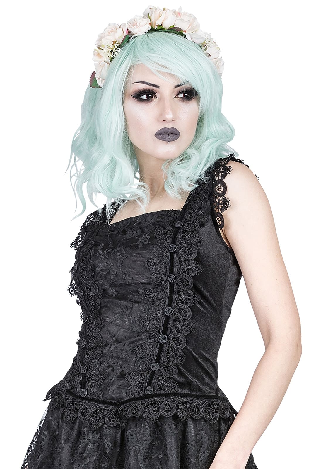 Figurnahes Samttop mit elegantem Square-Ausschnitt und detailreicher Spitzenverzierung – ein romantisch-dunkles Statementpiece.