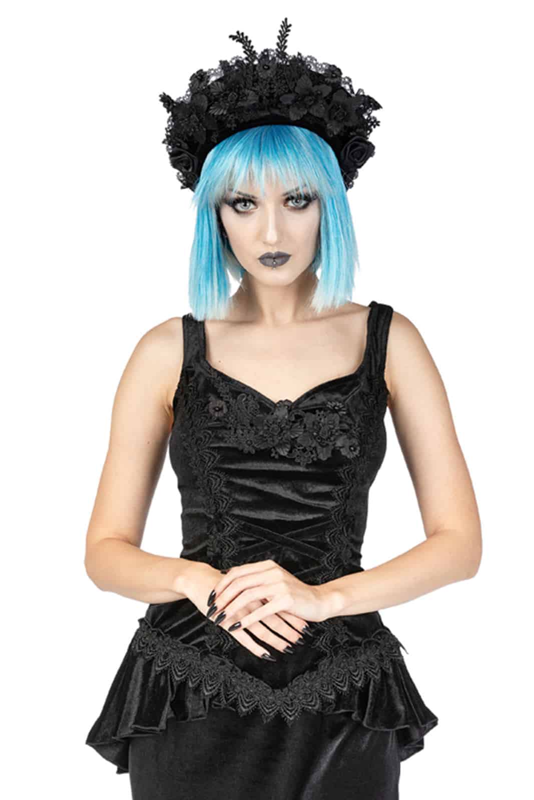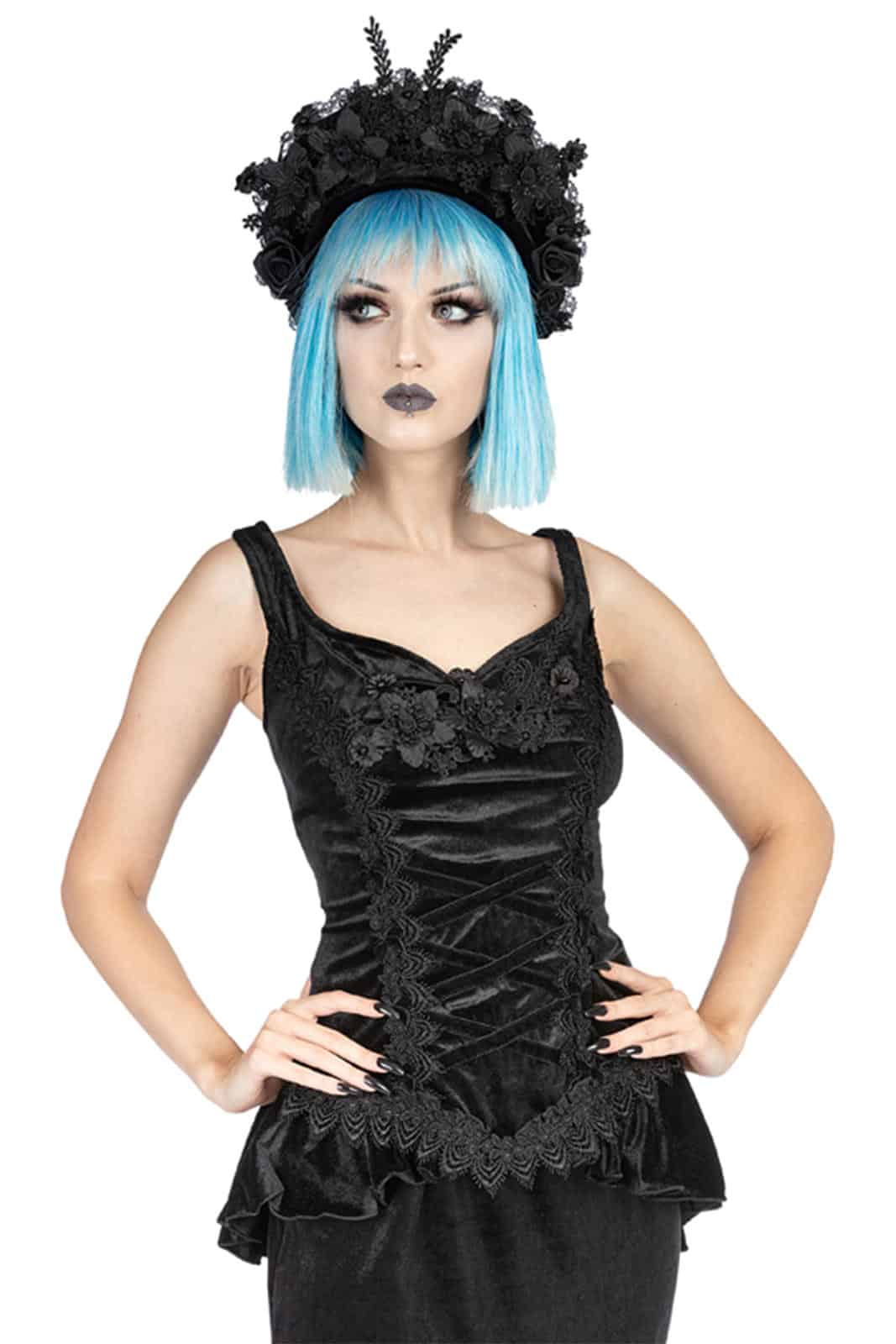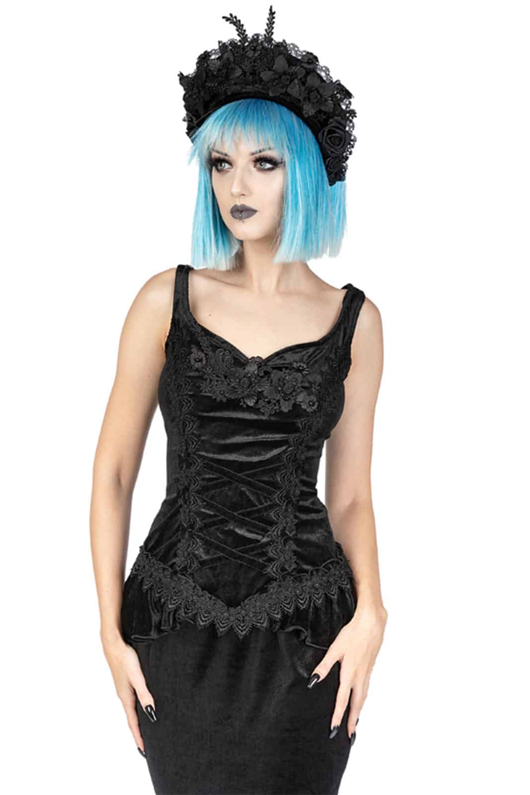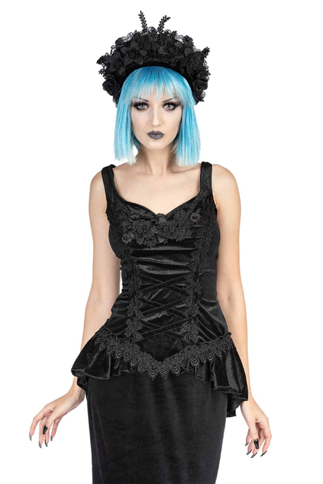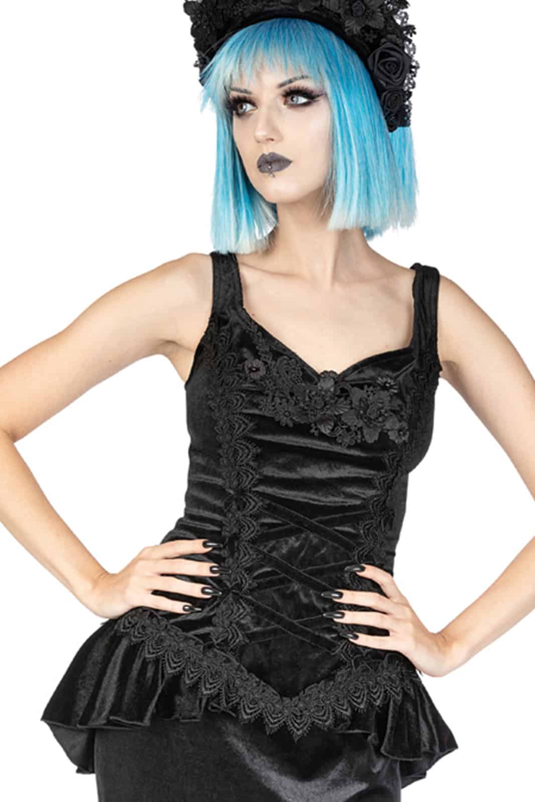 Elegantes Gothic-Top aus schwarzem Samt mit herzförmigem Ausschnitt. Das samtene Mieder hat eine die Taille betonende Frontpartie, die mit kreuz und quer verlaufenden Samtbandapplikationen verziert ist, die auf beiden Seiten mit blattförmigen Besätzen besetzt und mit kleinen schwarzen Samtschleifen verziert sind. Die Vorderseite ist ebenfalls mit einer schwarzen Blumenapplikation verziert. Der absteigende Samt-Fischschwanz beginnt an den Vorderseiten, endet länger hinten am Oberteil und hat einen Schlitz im Rücken. Reißverschluss hinten in der Mitte.