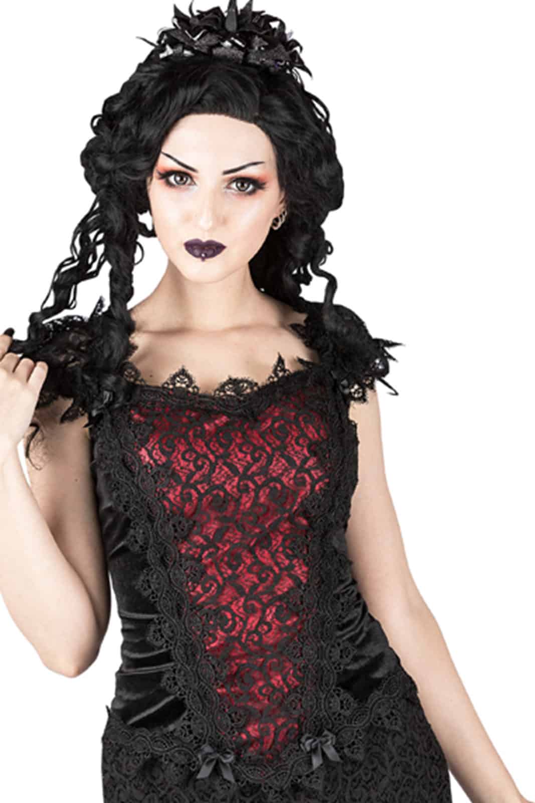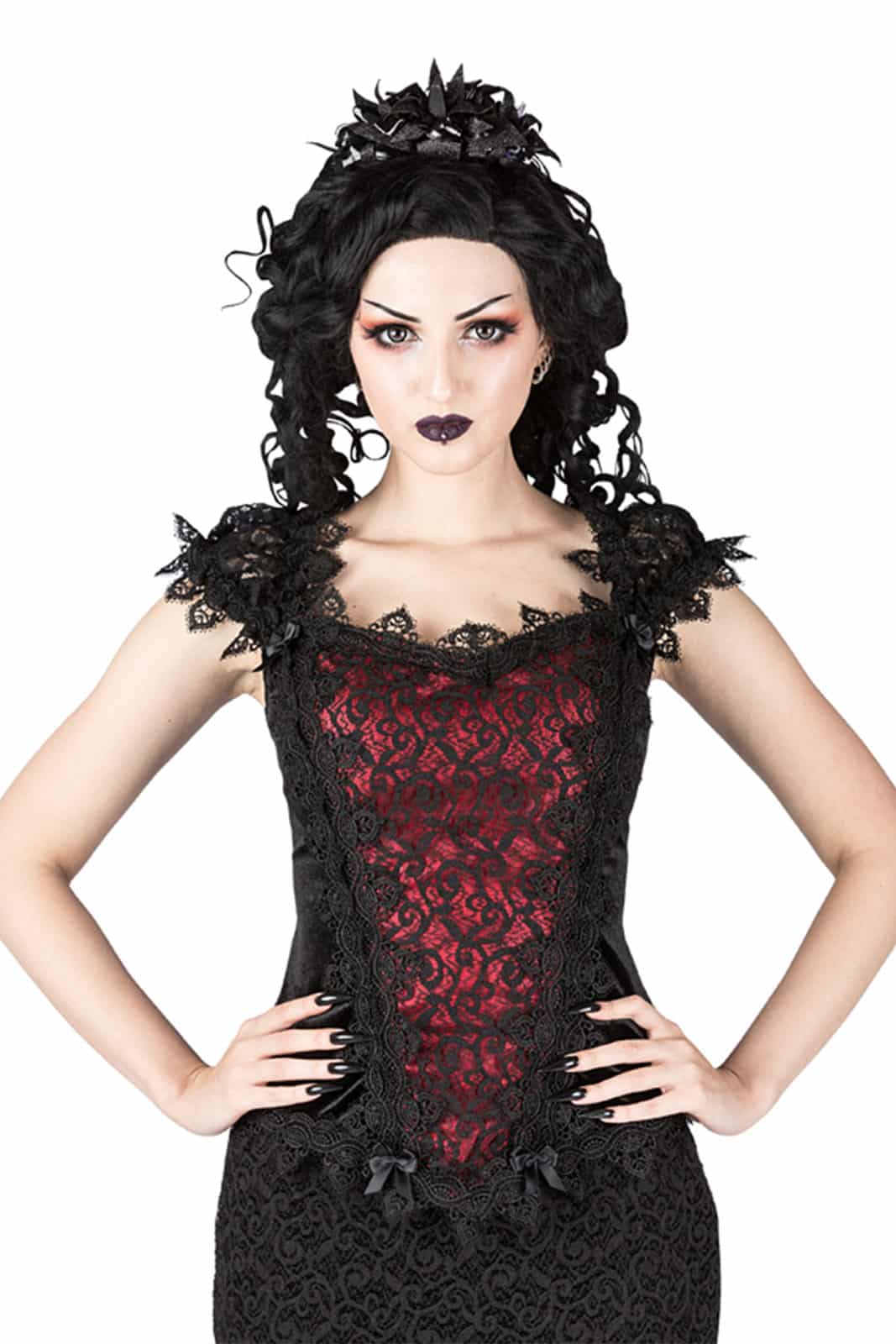 Edles ärmelloses Gothic Top mit Diamantausschnitt und elastischen Schulterträgern. Die Vorder- und Rückseite aus Satin ist mit französischer Spitze überzogen und mit venzianischer Spitze besetzt.