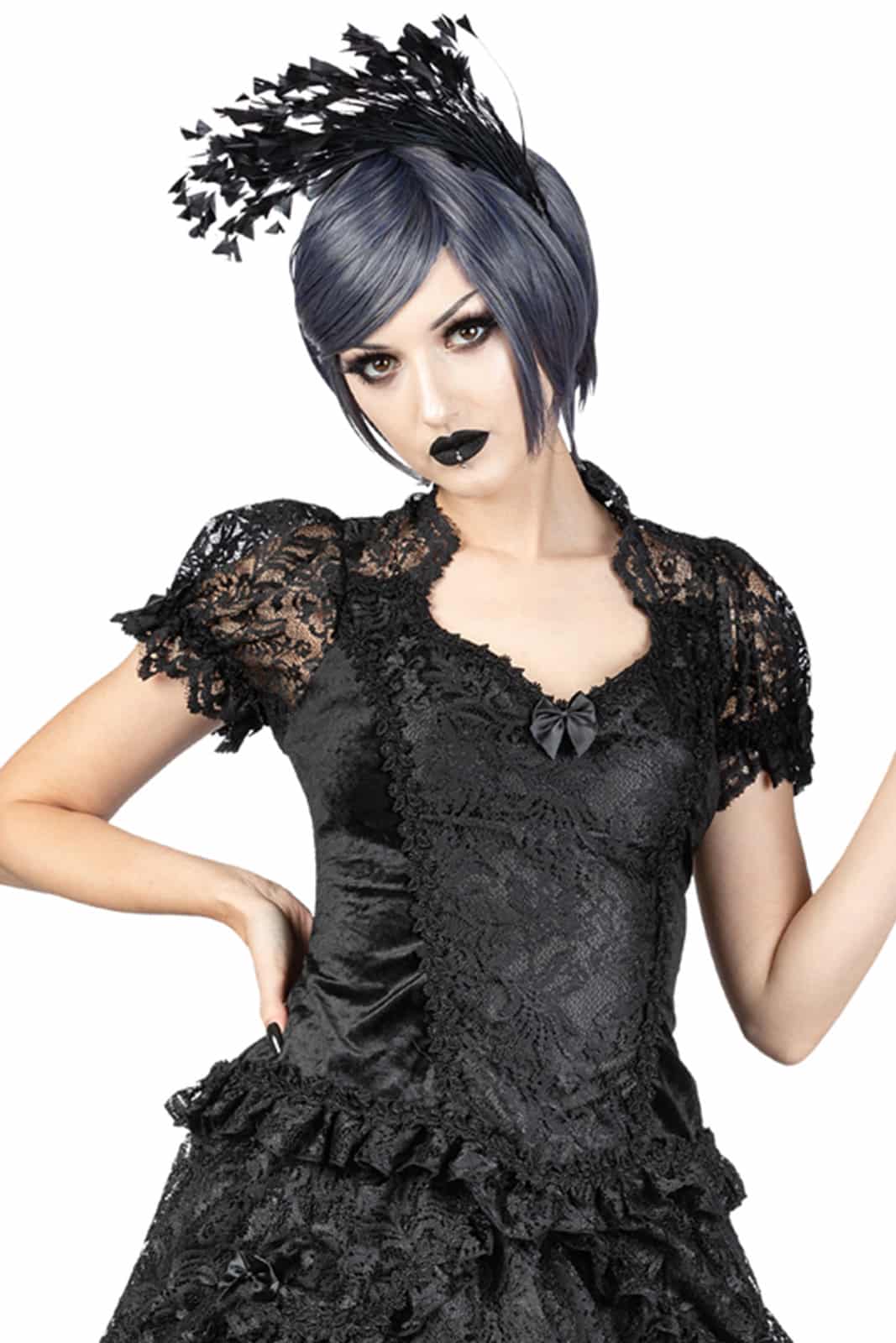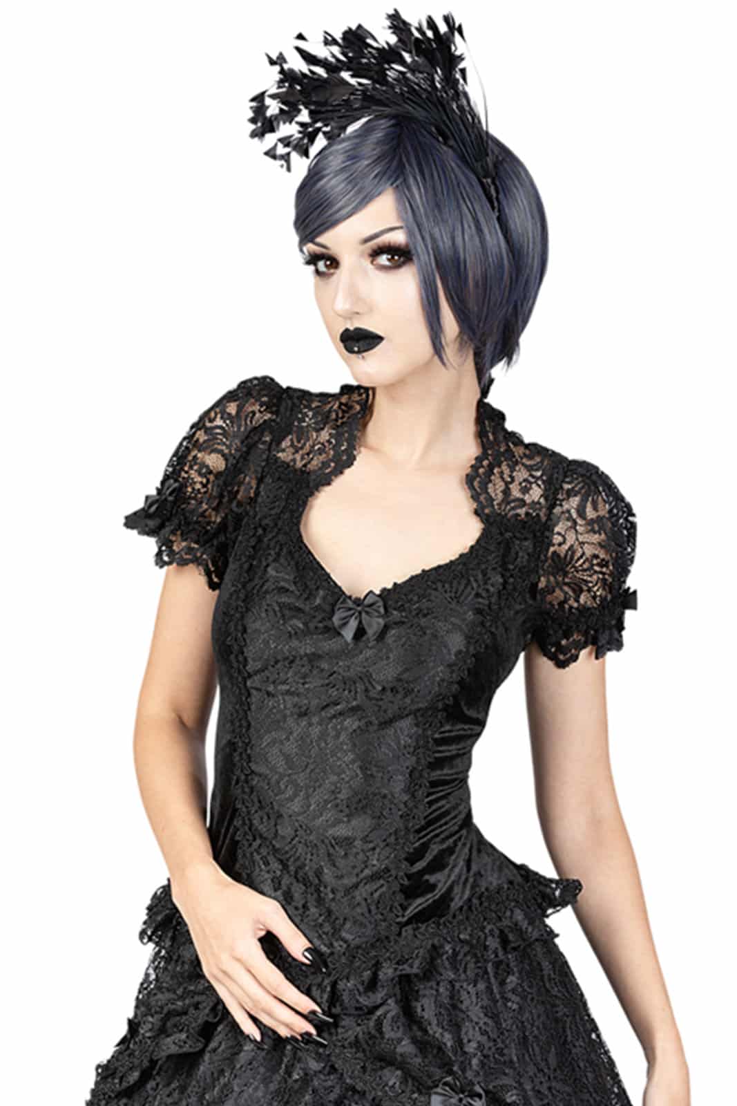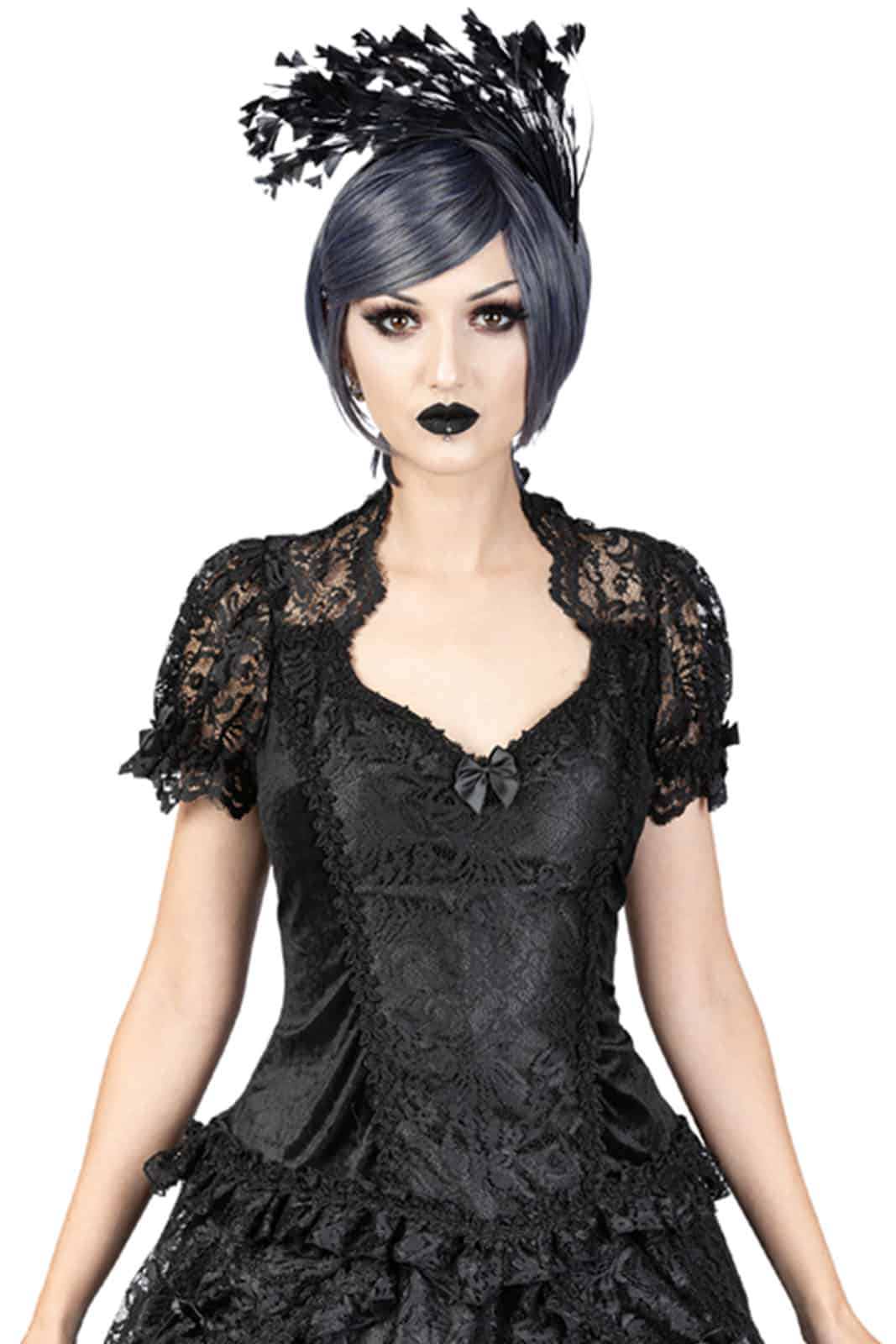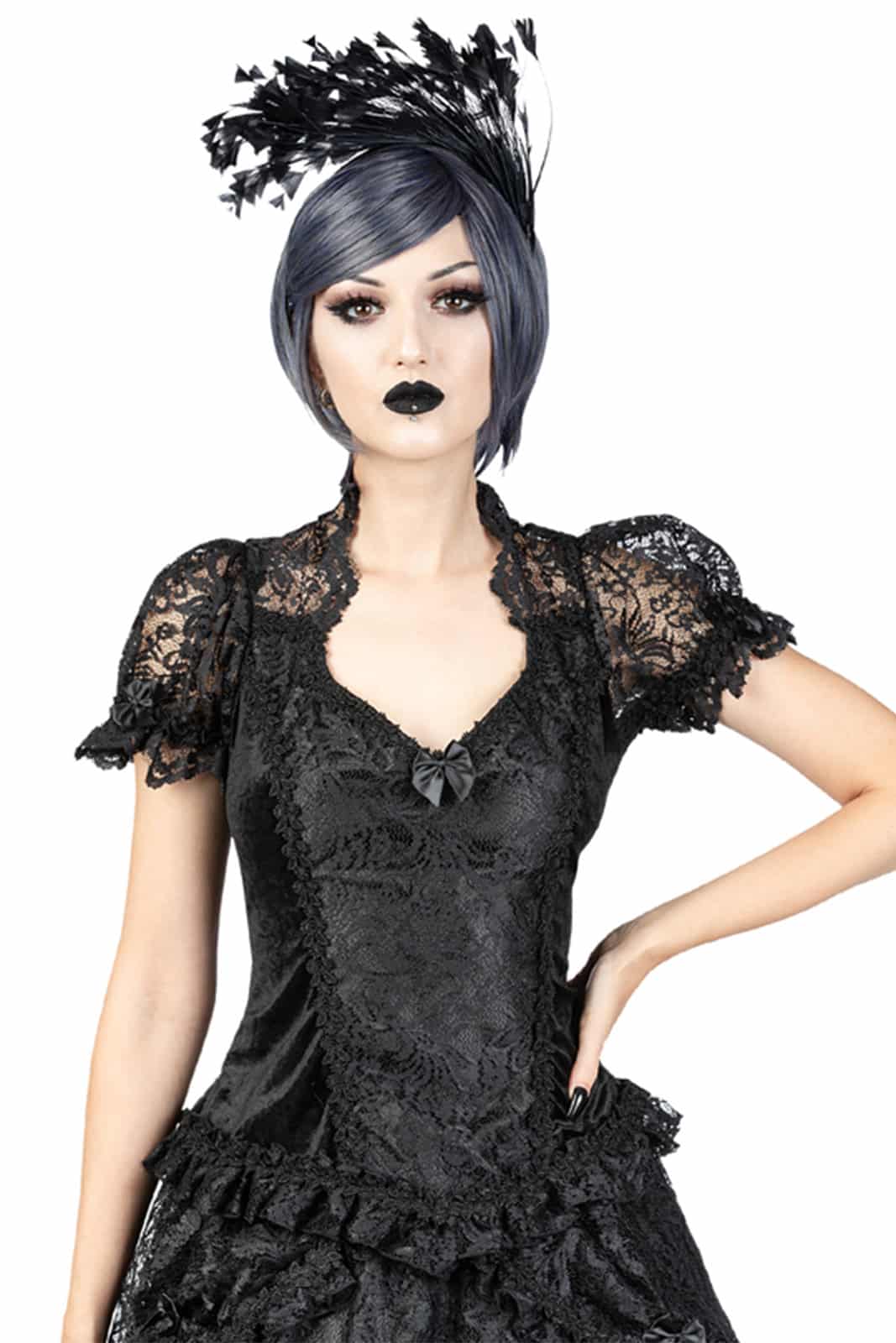 Klassisches viktorianisches Gothic-Top mit Diamantausschnitt und schwarzem Spitzenkragen. Die Puffärmel aus sizilianischer Spitze sind elastisch, haben einen blattförmigen Besatz und sind mit einer großen Satinschleife verziert. Die Satin-Frontplatte des Samtmieders ist mit einer venezianischen Spitzenauflage eingebettet und mit schwarzem Spitzenbesatz verziert. Überall am Saum ist eine schwarze Spitzenrüsche mit venezianischer Spitze besetzt. Der hohe Rücken ist aus schwarzer Spitze und hat schwarzen Samt am unteren Rücken. Ein Reißverschluss befindet sich auf der Rückseite des Oberteils.
