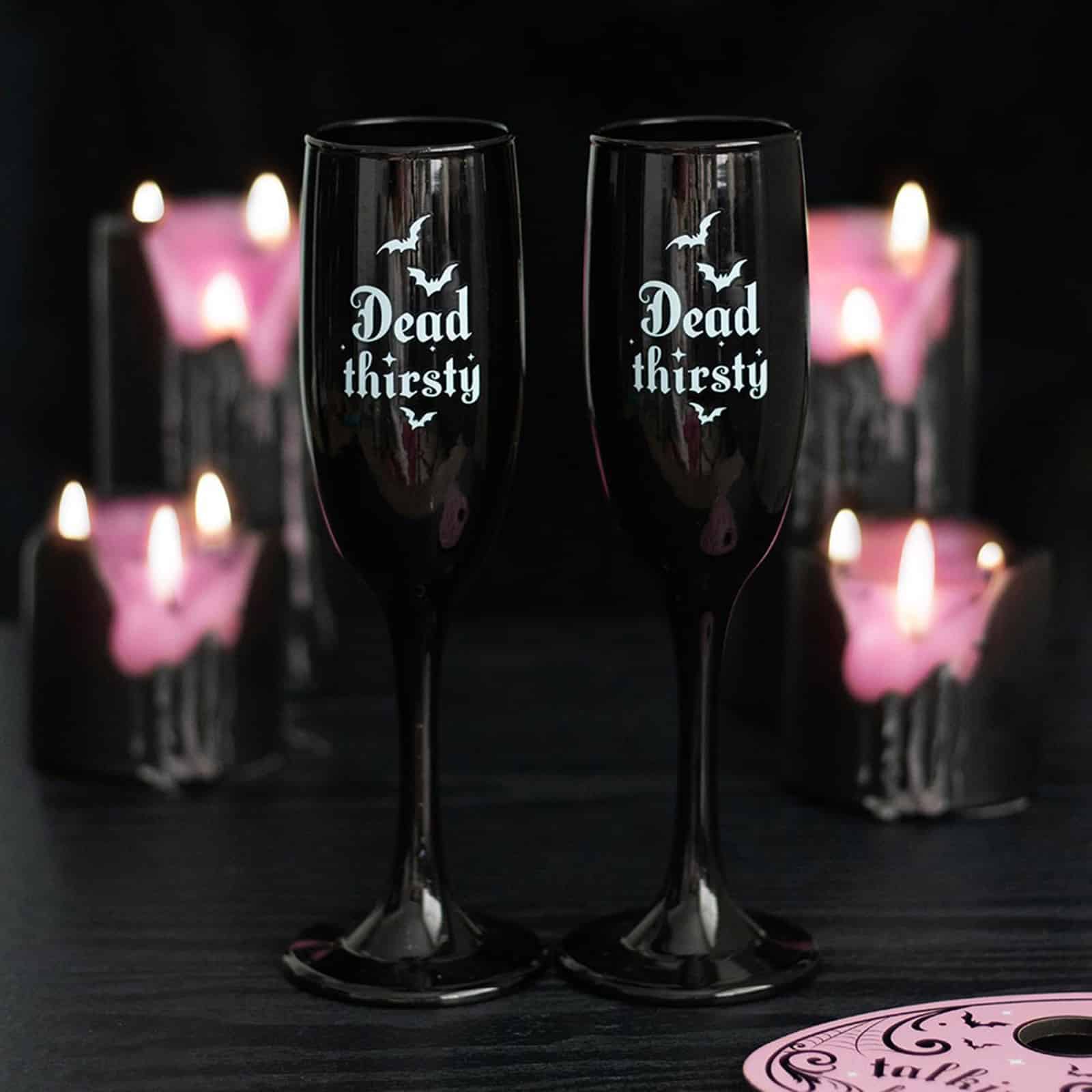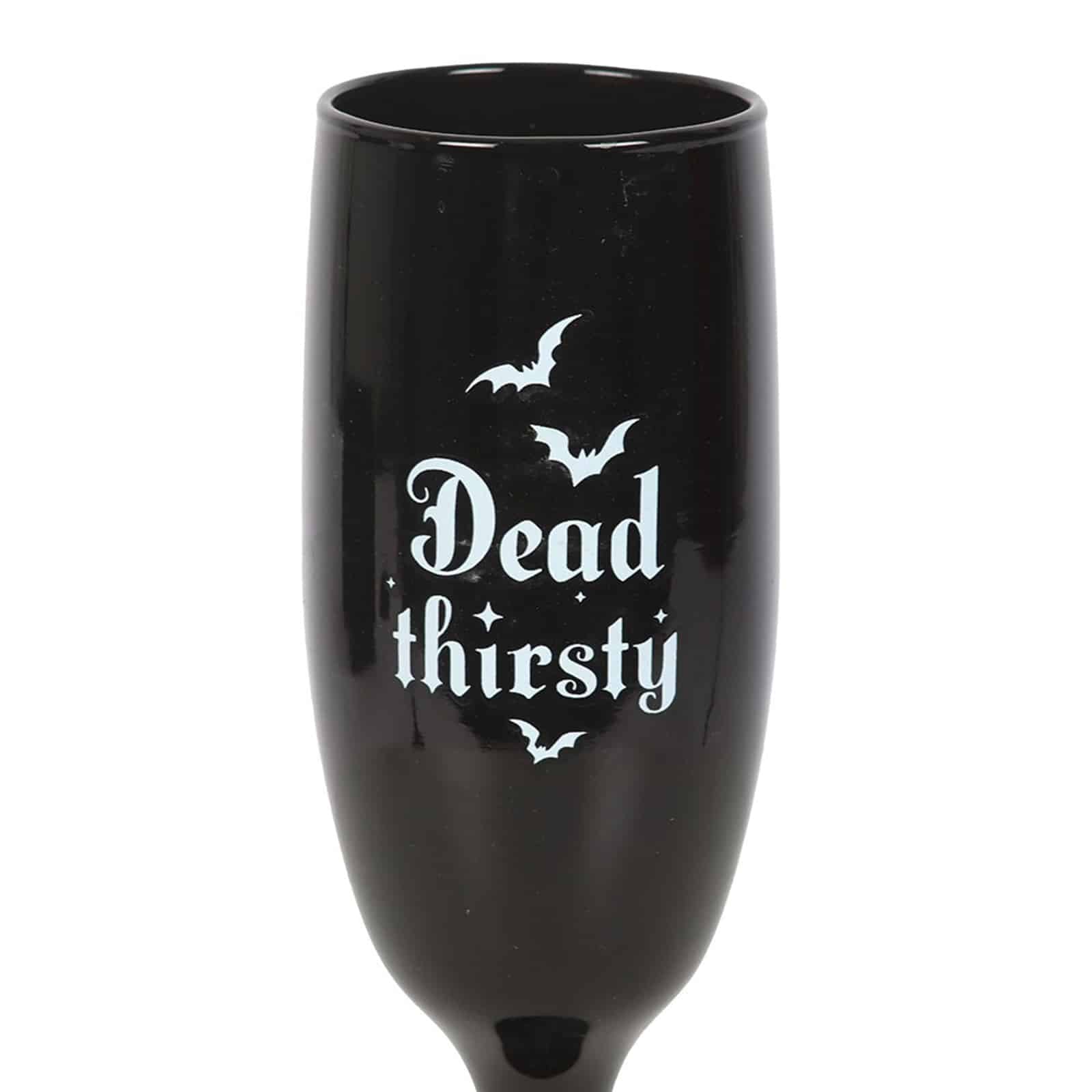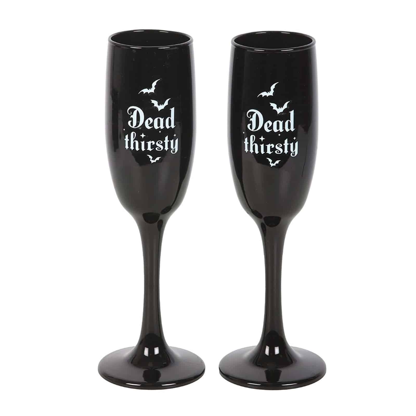 Feier mit einem Gothic-Touch mit diesem 2er-Set Dead Thirsty Champagnerflöten. Mit ihrem eleganten schwarzen Design eignen sie sich perfekt für gruselige Feiern, Hochzeiten oder besondere Anlässe mit einem Hauch von Flair.