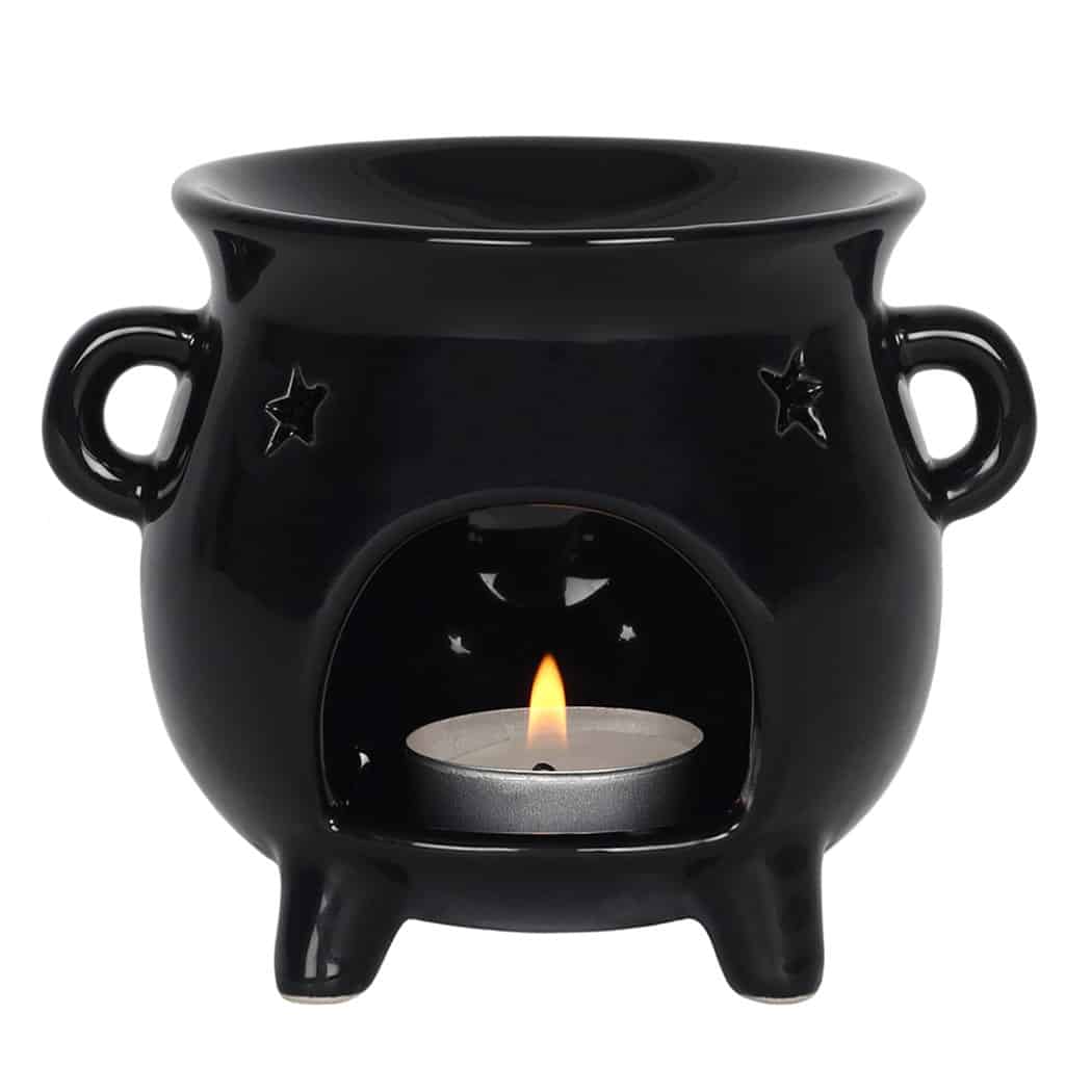 Schwarze Duftlampe aus Keramik in Form eines kleinen Hexenkessels.