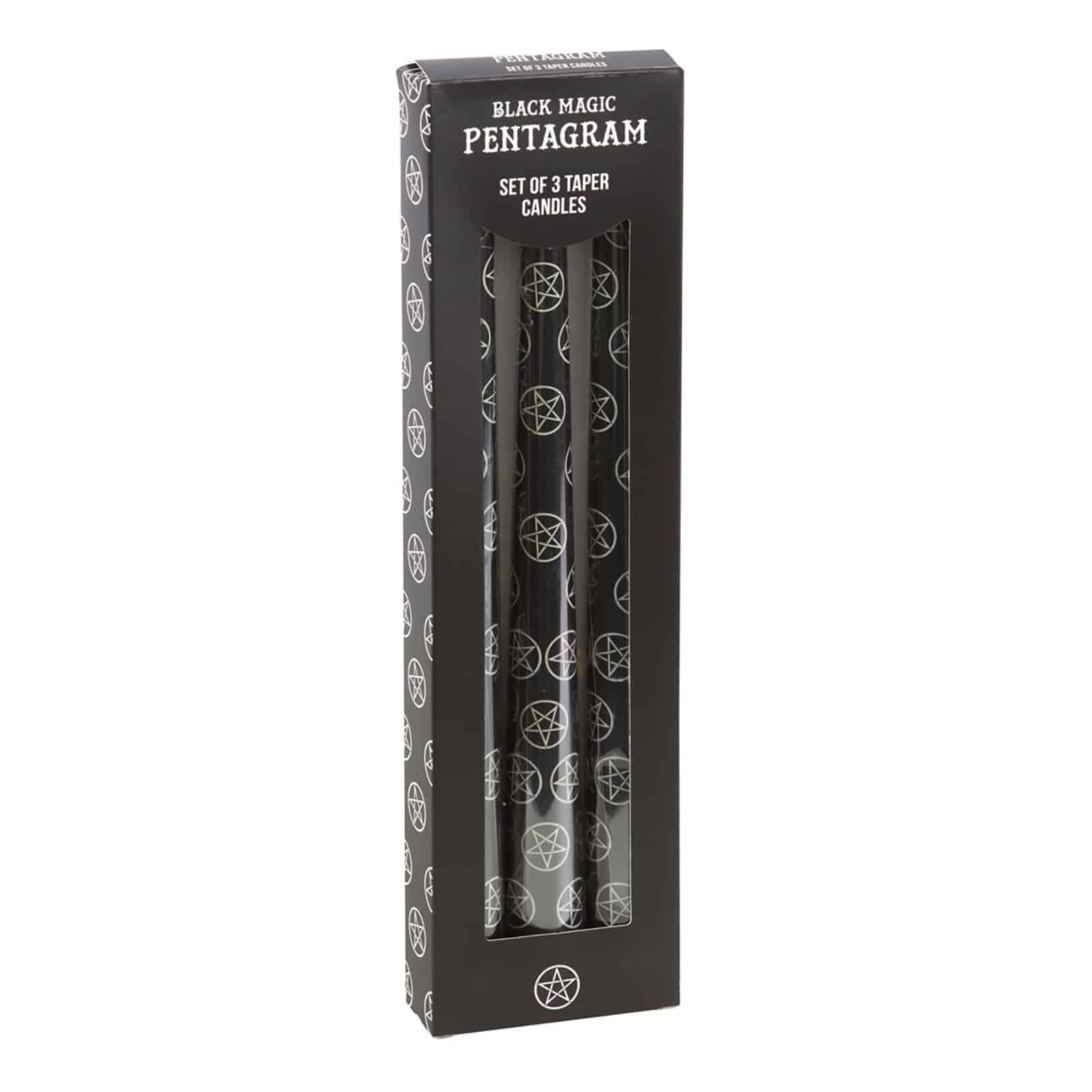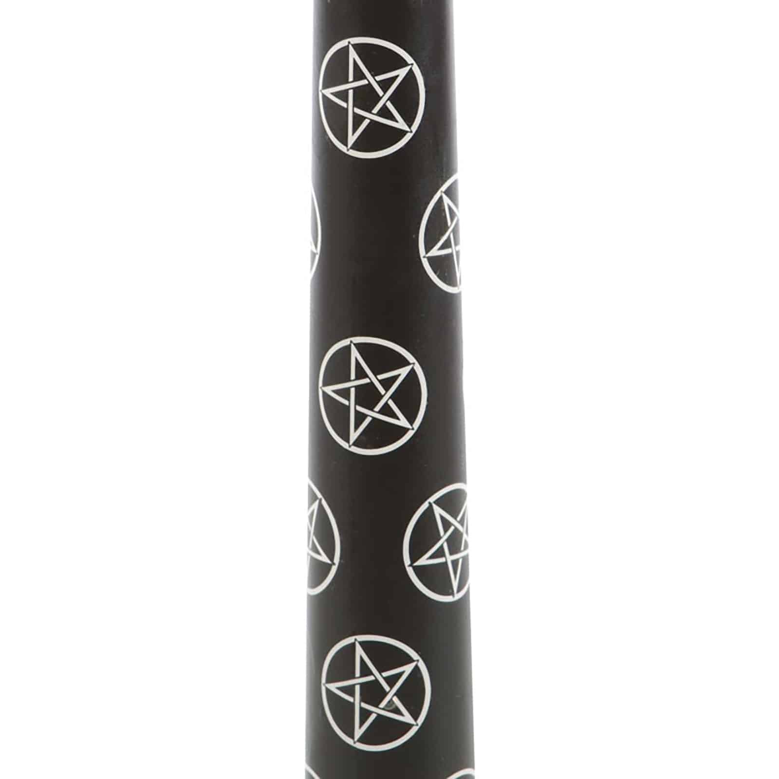 Diese Packung mit 3 schwarzen Spitzkerzen eignet sich perfekt, um einem gedeckten Tisch den letzten Schliff zu verleihen oder dekorative Akzente im ganzen Haus zu setzen. Die mit einem mystischen Pentagramm-Design verzierten Kerzen bieten die perfekte Mischung aus Eleganz und magischer Symbolik und sind ein Muss für jeden, der seinem Wohnraum eine einzigartige Note verleihen möchte.