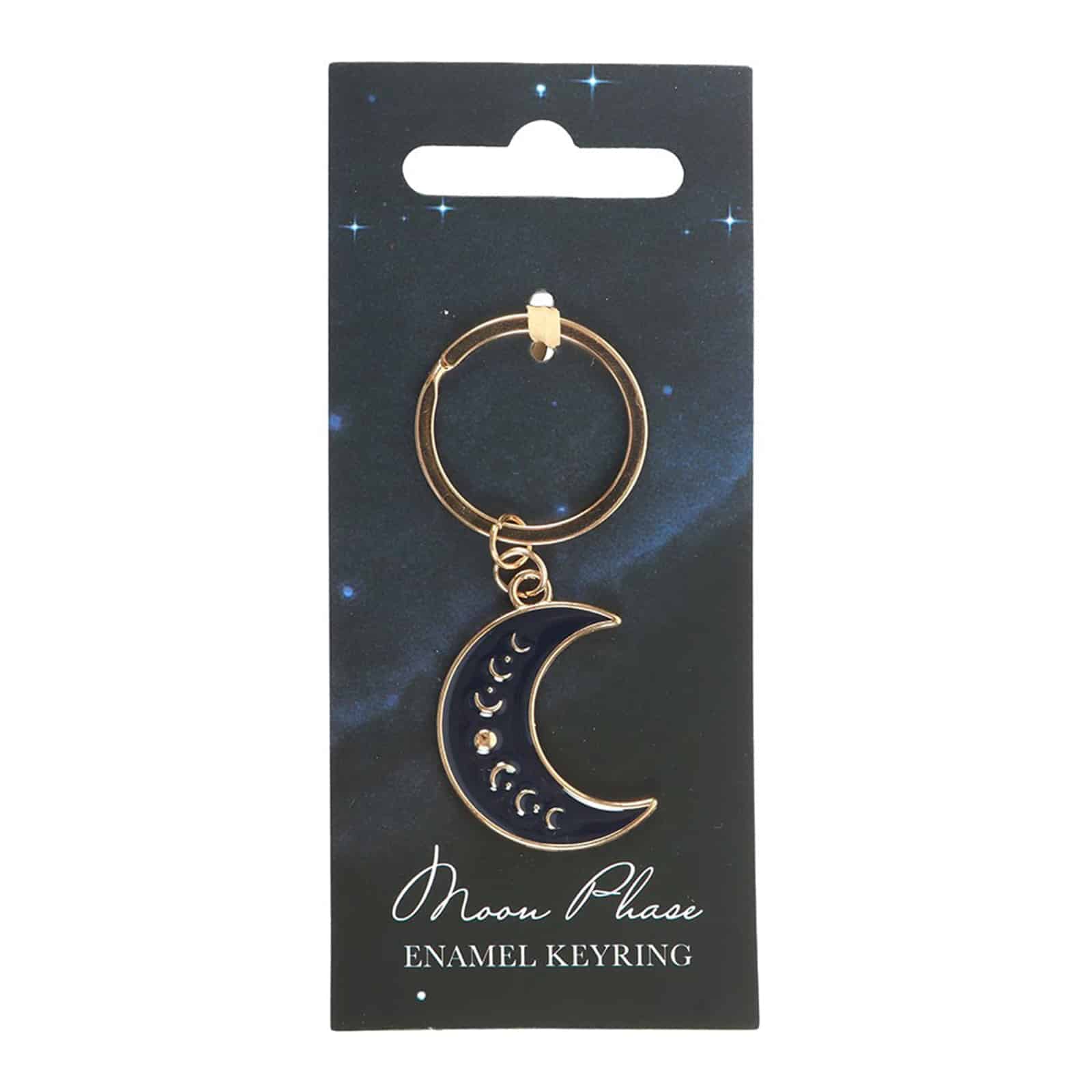 Eleganter Schlüsselanhänger mit Mondsichel und feinem Mondphasen-Emaille in goldfarbener Fassung. Inspiriert vom Nachthimmel – ideal für Schlüssel, Taschen oder Reißverschlüsse.