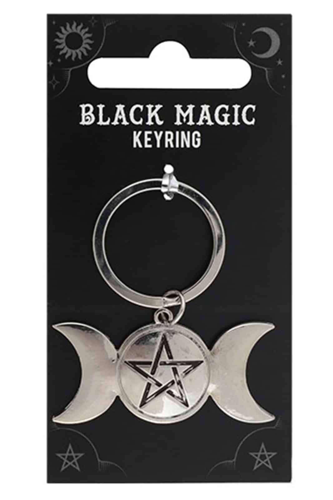 Widerstandsfähiger Schlüsselanhänger aus Metall in Form von drei Mondphasen mit einem Pentagramm auf dem mittleren Vollmond.