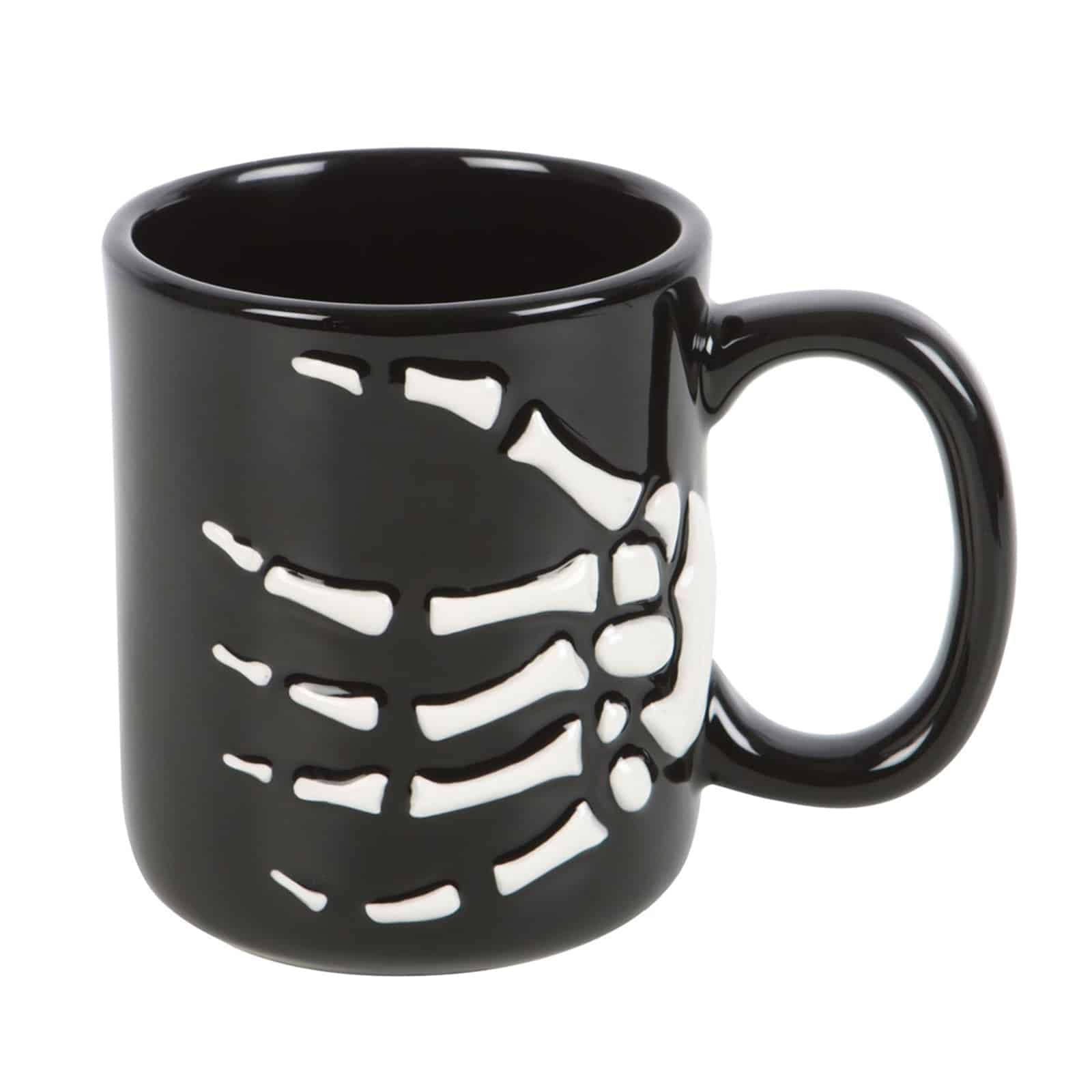Fühlst Du Dich auch tot ohne Deine morgendliche Tasse Kaffee? Mach Dir den Übergang von der gemütlichen Gruft zum kalten Arbeitsweg mit dieser Skelett-Handtasse etwas wärmer.