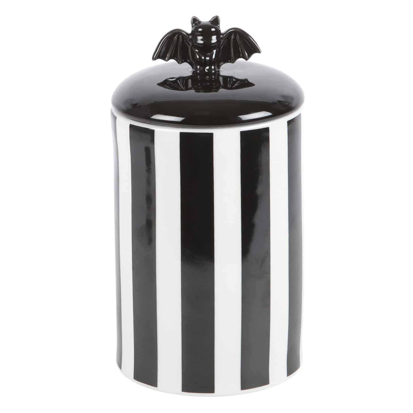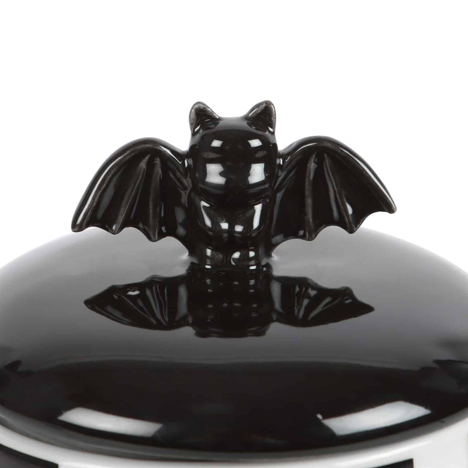 Ein auffälliges schwarz-weißes Keramik-Vorratsglas mit abnehmbarem Deckel mit Fledermaus-Detail – perfekt für alle, die auffällige und einzigartige Stücke lieben. Ob für Kekse oder kleine Schmuckstücke – es wird garantiert ein Lieblingsstück in einem liebevoll eingerichteten Zuhause.