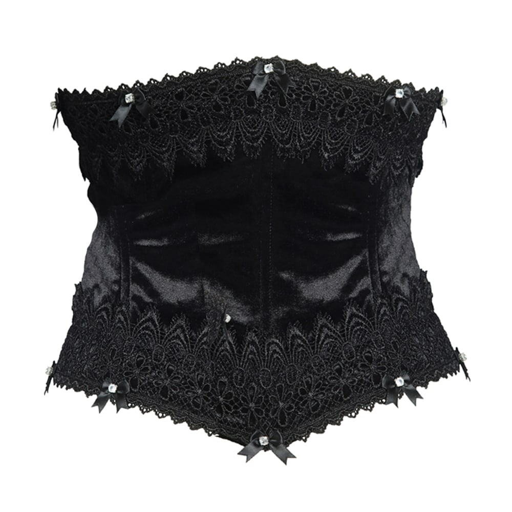 Leichtes Unterbrustkorsett aus schwarzem Samt mit Kunststoff-Stäbchen. Üppig verziert mit schwarzer Spitze, farblosen Schmucksteinen und kleinen Schleifchen.