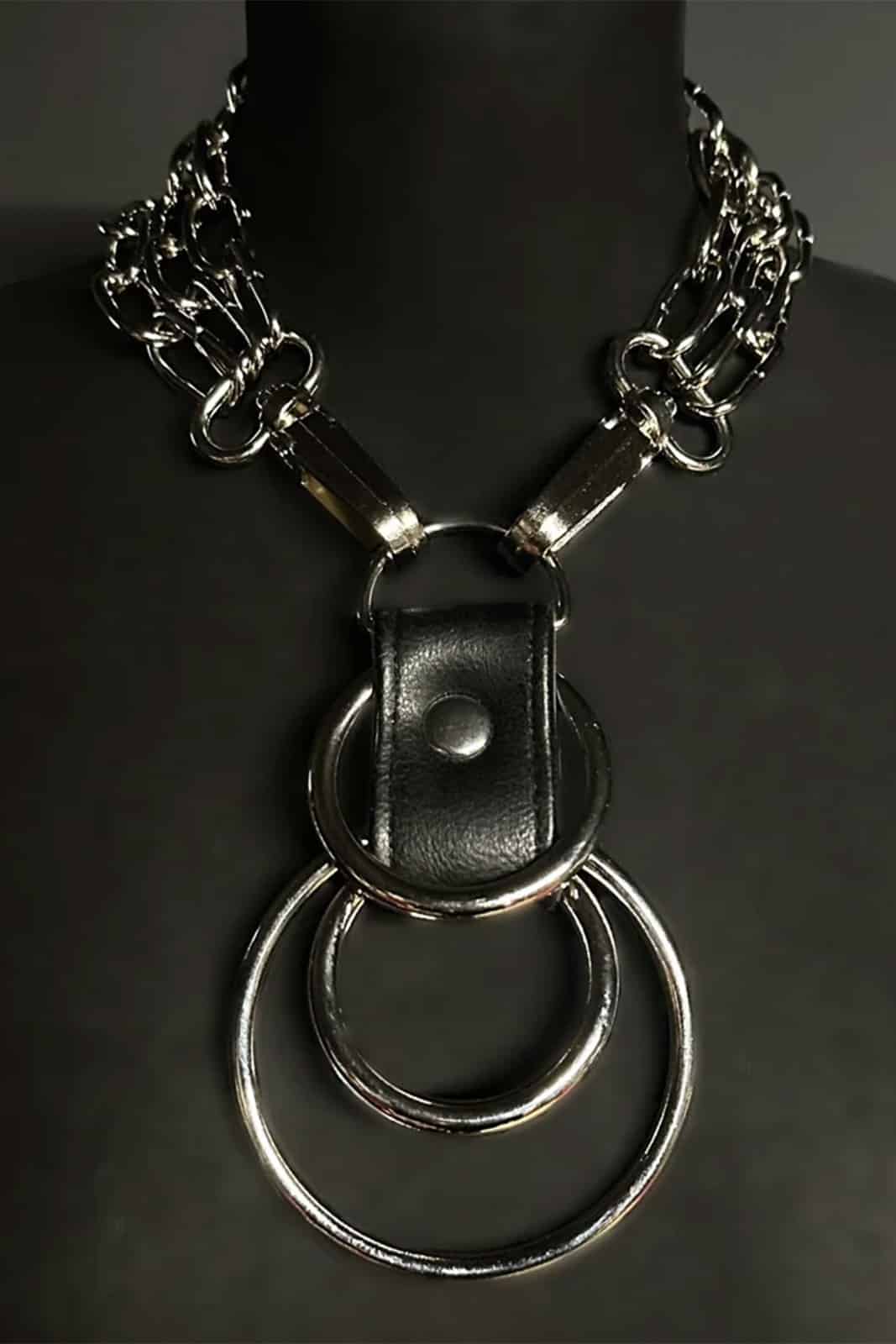 Diese auffällige Halskette kombiniert veganes Leder mit massiven Ketten und markanten Ringen. Drei O-Ringe hängen an einem D-Ring, der mit einem Ledersteg fixiert ist und dem Design einen kraftvollen Mittelpunkt verleiht. Die Halskette schließt mit zwei Clips, die den D-Ring mit drei stabilen Kettensträngen verbinden, die sich um den Nacken legen. Ein ausdrucksstarkes Accessoire für ein starkes, edgy Statement.
