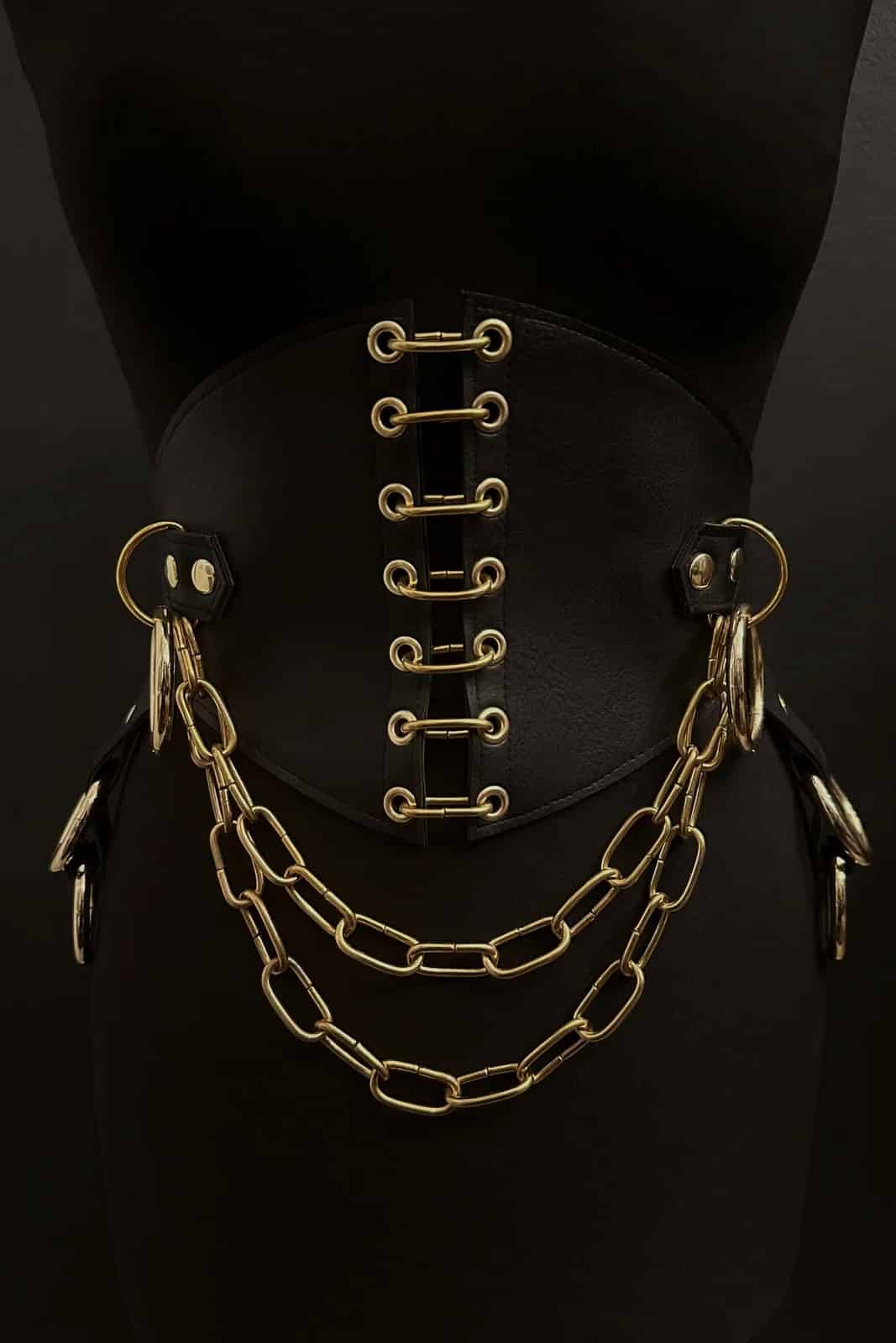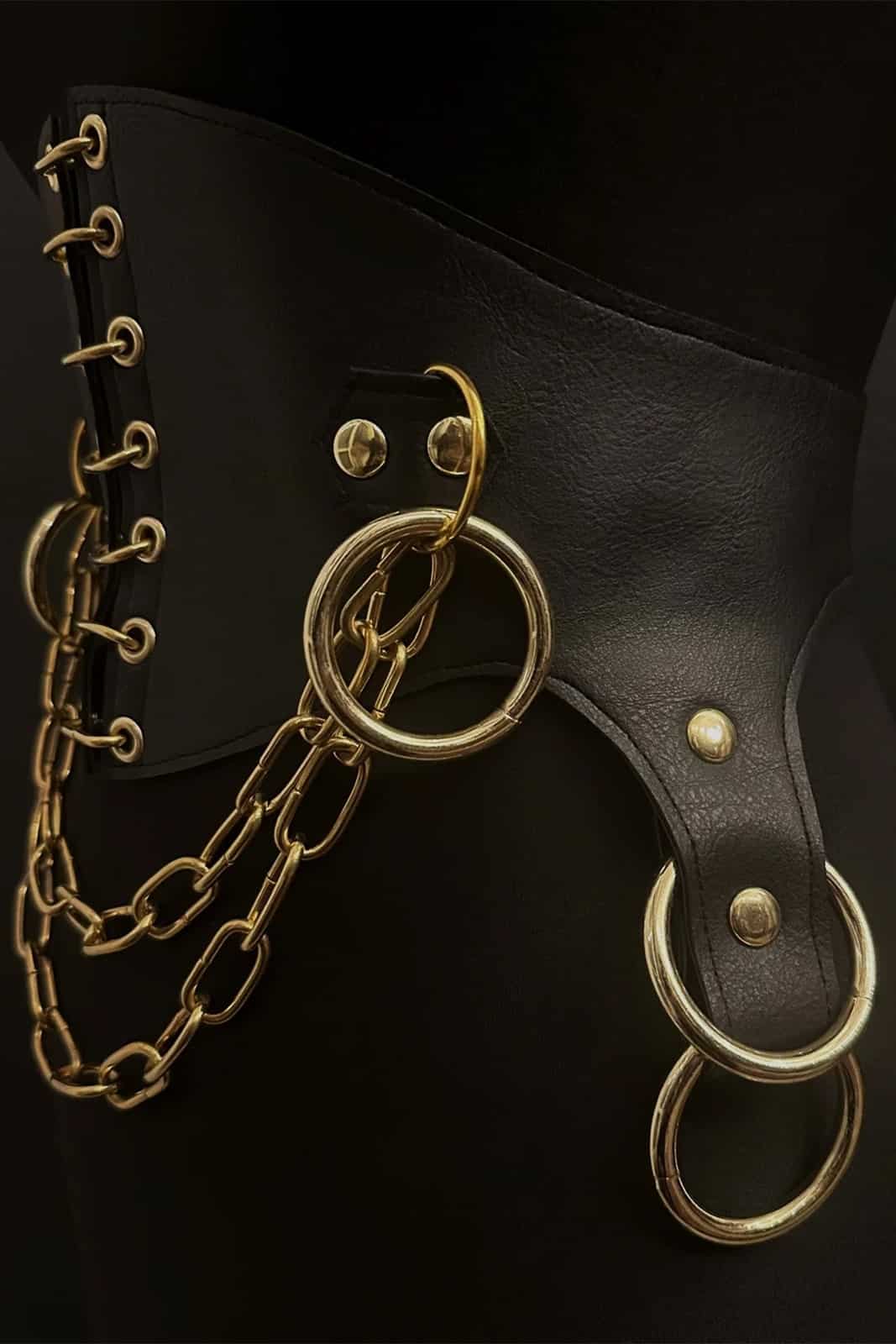 Dieser Gürtel besteht aus schwarzem veganem Leder und Nickelbeschlägen. Er verfügt über Glieder in der vorderen Mitte, Ketten und Ringe sowie eine Hosenträgerform, die mit O-Ringen verziert ist. Er wird hinten mit einer Schnalle und Ösen geschlossen.