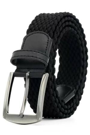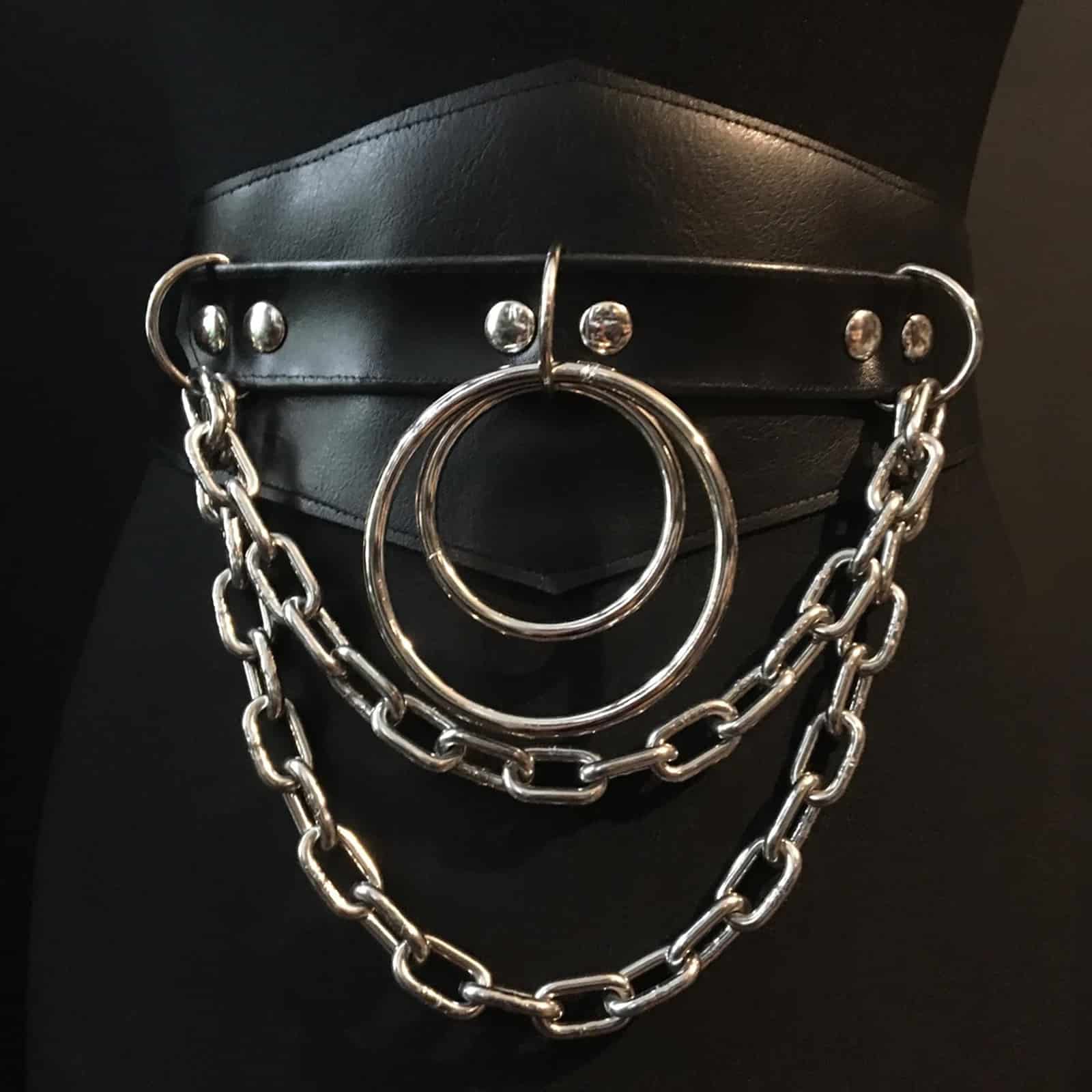 Dieser Gürtel besteht aus schwarzem veganem Leder und Messingbeschlägen. Es ist vorne mit Ketten und Ringen versehen und wird hinten mit einer Schnalle und einer Gürtelschlaufe geschlossen.
