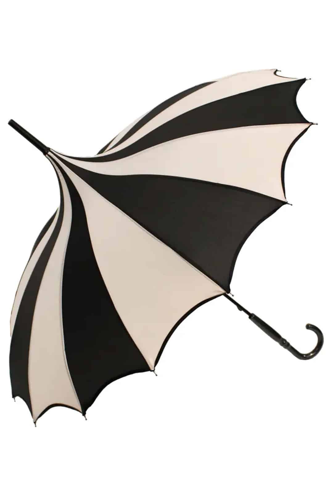 Ein außergewöhnlicher Pagoden-Schirm im viktorianisch-düsteren Stil. Die markante Streifenoptik kombiniert mit der geschwungenen Fledermausflügelkante macht diesen Schirm zu einem echten Statement-Accessoire – funktional und zugleich ein Blickfang für Gothic- und Alternative-Looks.