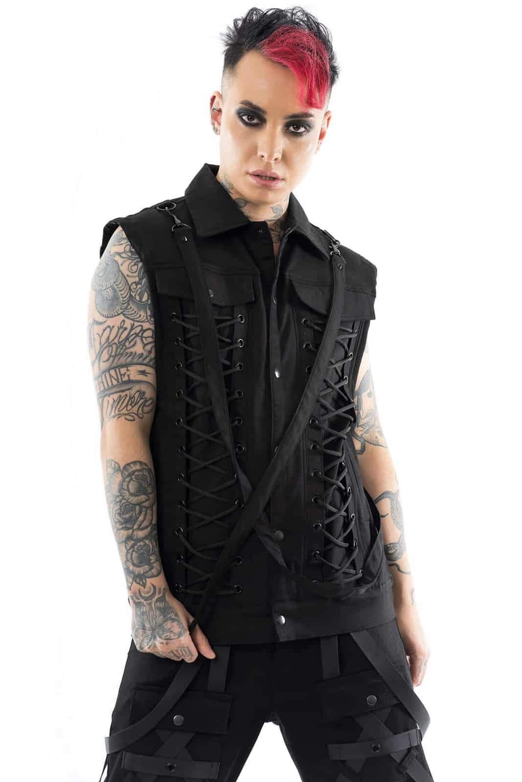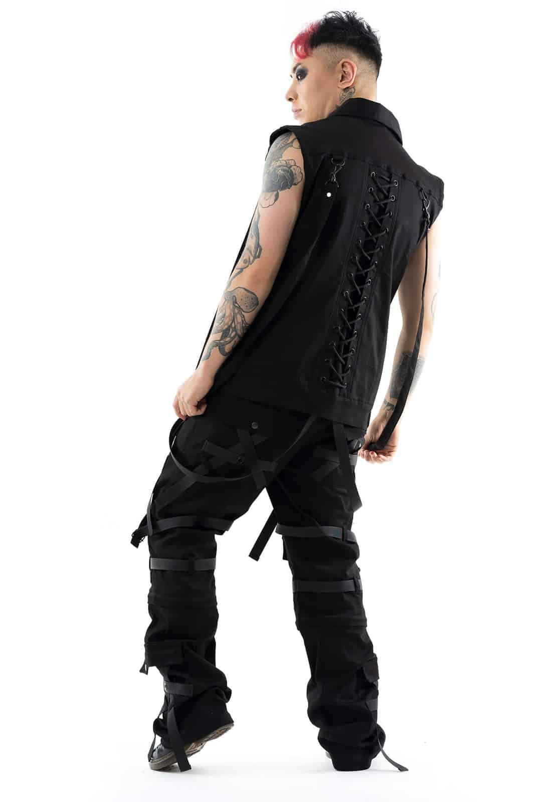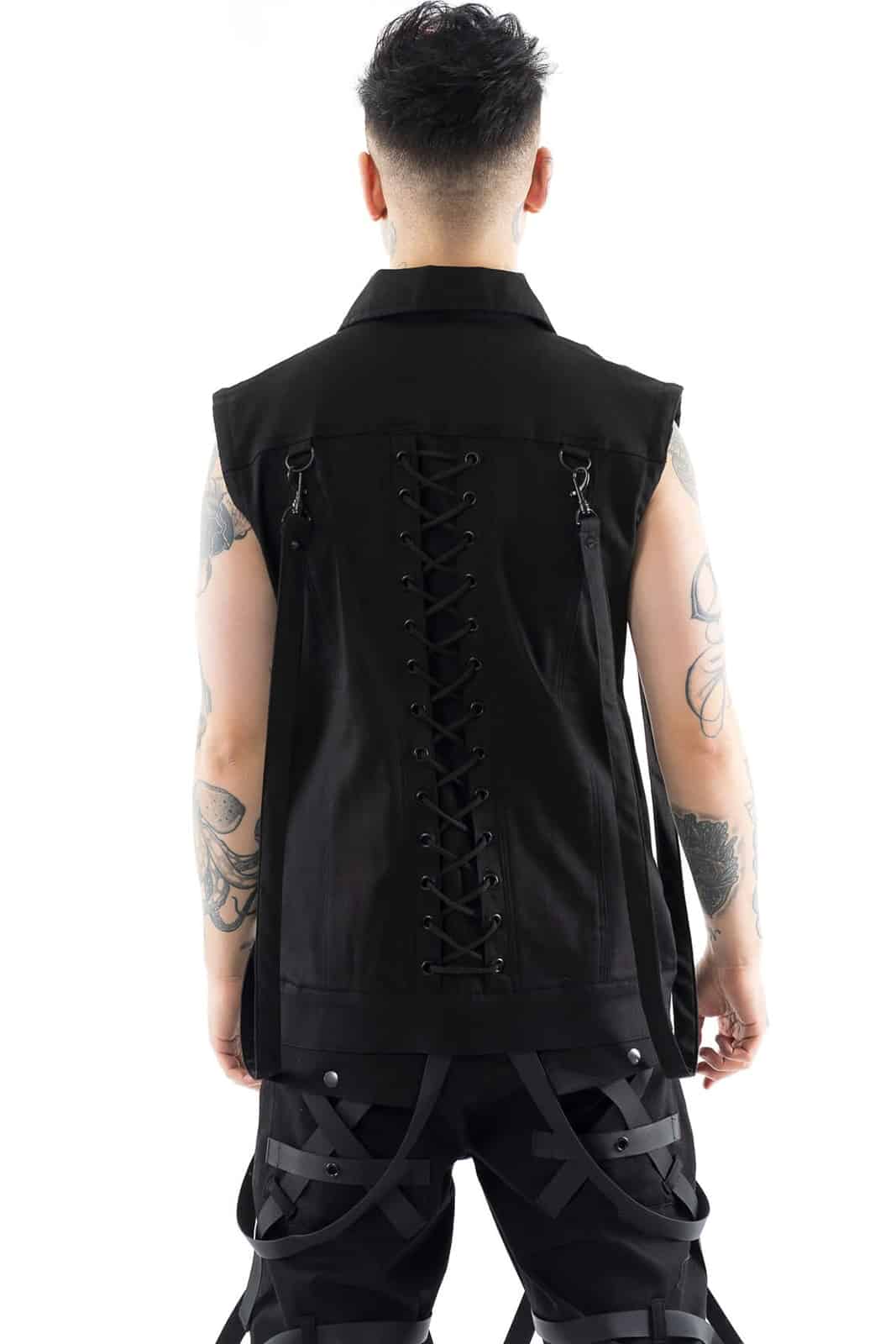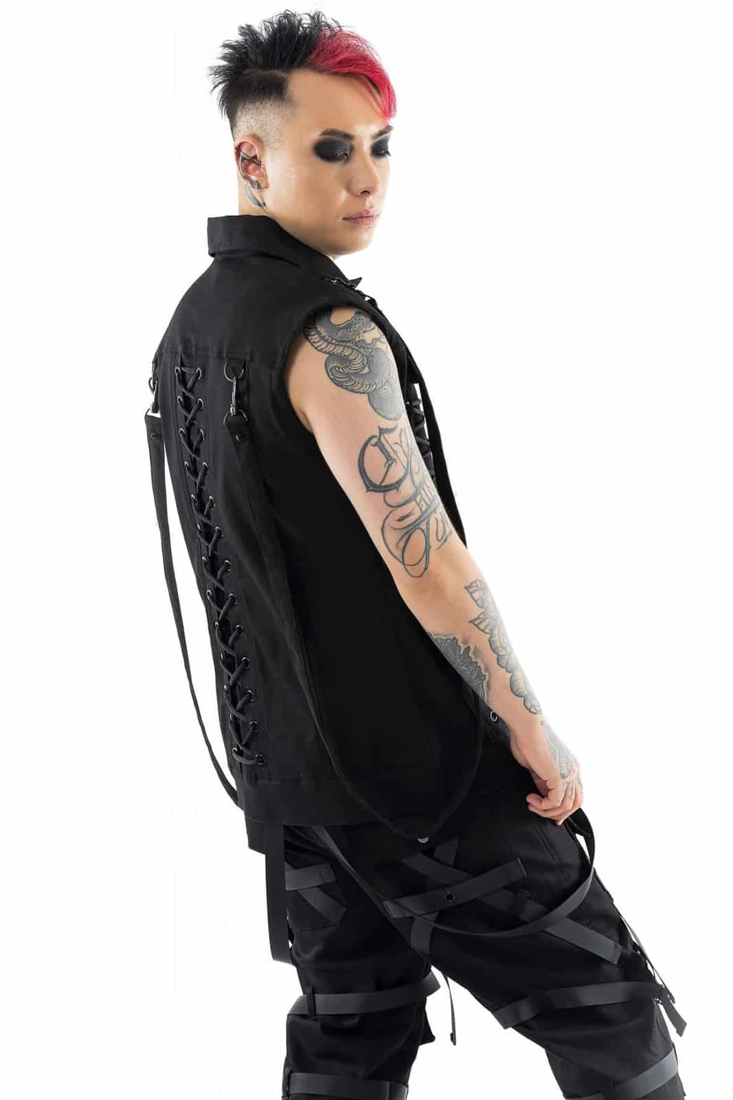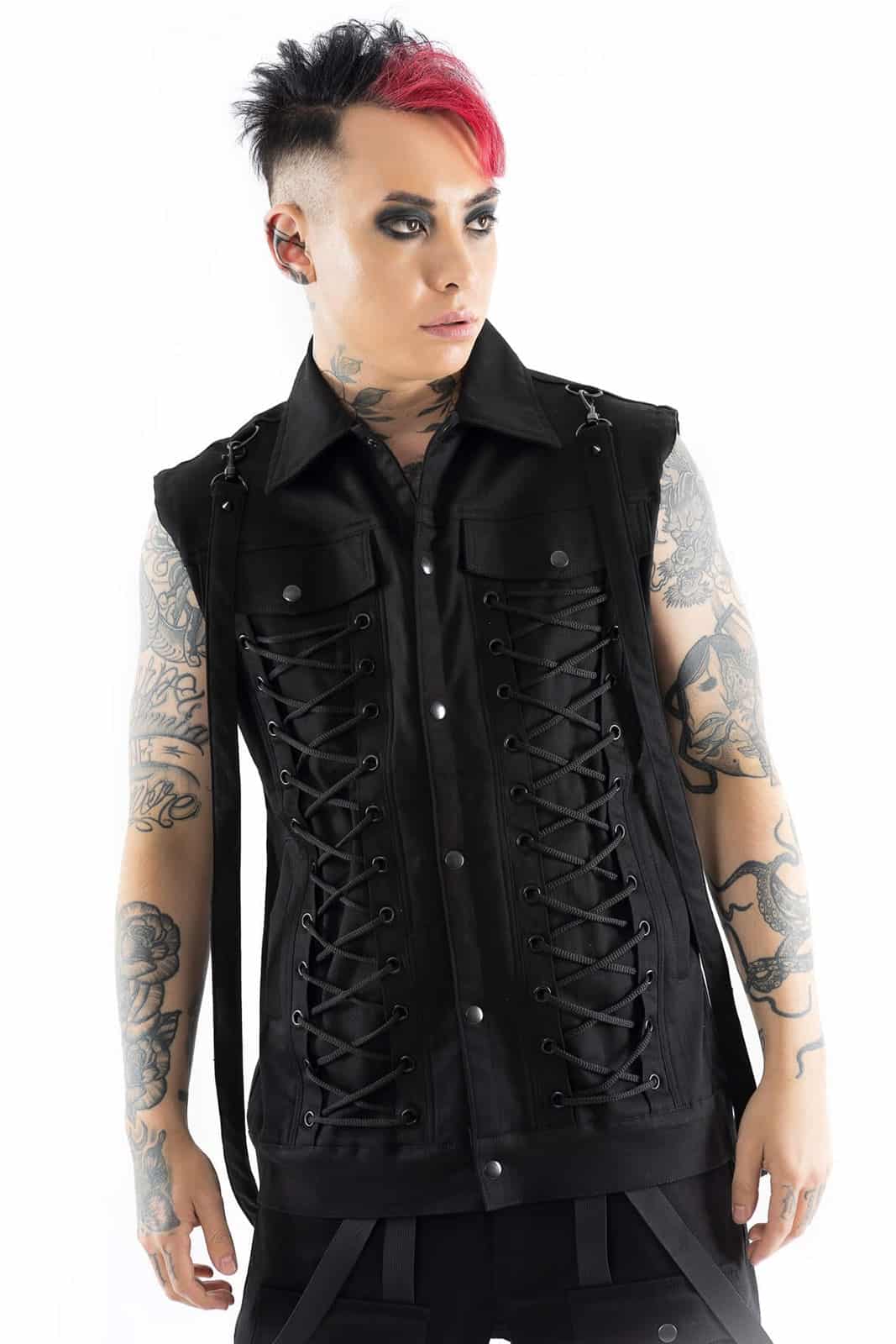 Diese ärmellose schwarze Weste vereint rebellischen Industrial-Style mit auffälligen Details. Die doppelte Frontschnürung auf beiden Seiten und eine zusätzliche Schnürung am Rücken ermöglichen eine individuelle Passform und betonen die Silhouette. Zwei Brusttaschen mit Klappen und Druckknöpfen sowie matte Zierknöpfe in der Mitte verleihen dem Design Struktur. Seitlich angebrachte D-Ringe und lange Zierbänder unterstreichen den markanten, funktionalen Look. Gefertigt aus einem robusten Baumwoll-Materialmix bietet die Weste eine angenehme Mischung aus Formstabilität und Tragekomfort. Ihr leicht verlängerter, locker fallender Schnitt macht sie ideal für Gothic-, Cyber- oder Industrial-Outfits und lässt sich hervorragend mit Cargohosen und schweren Boots kombinieren.