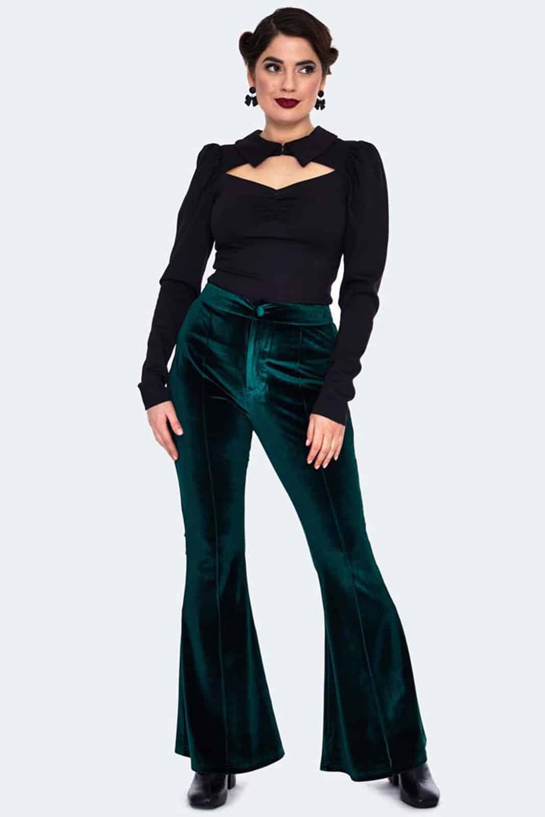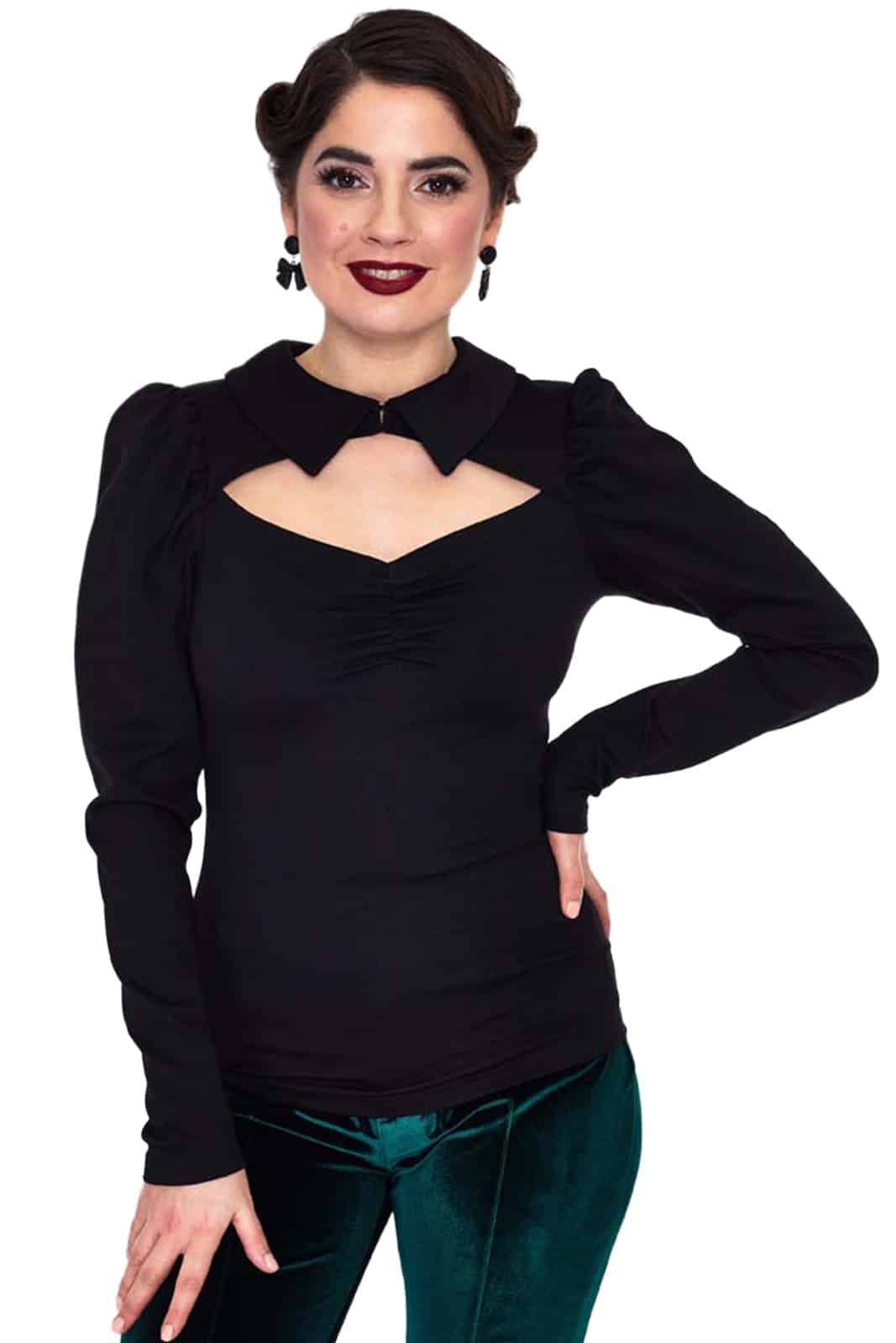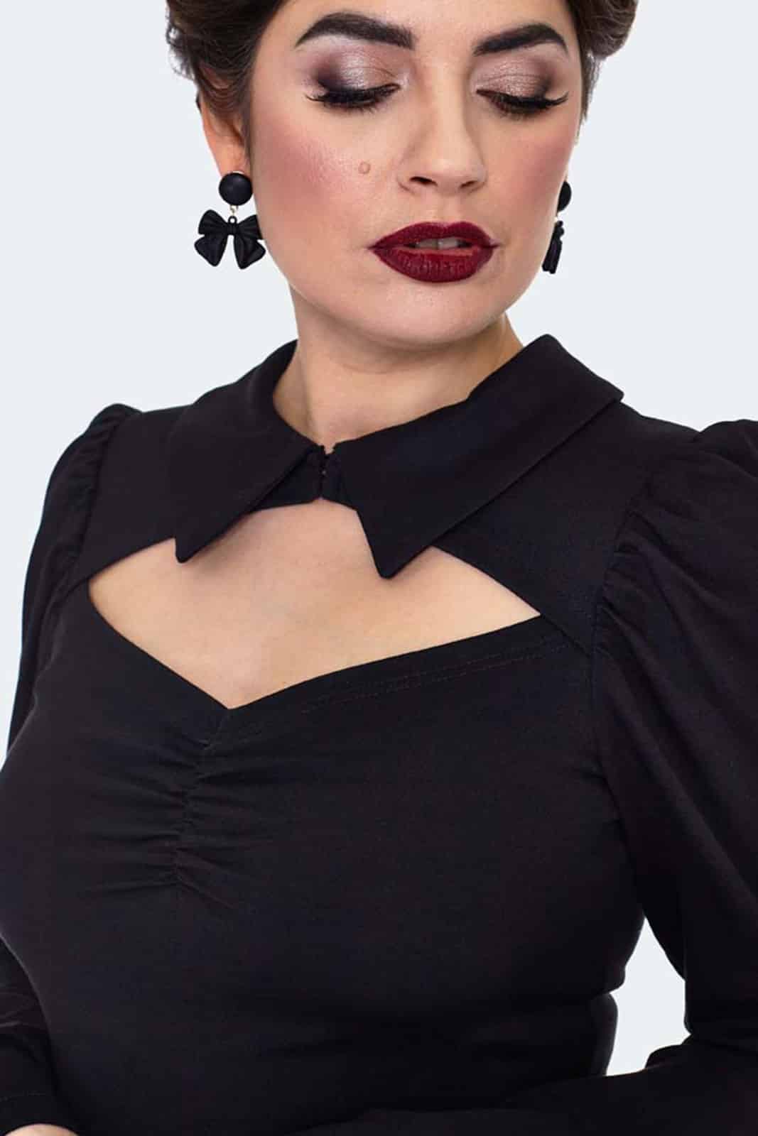 Dieses figurbetonte Langarmtop versprüht mit seinem raffinierten Cut-Out und dem markanten Kragen nostalgischen Retro-Charme. Die geraffte Büste betont die Silhouette elegant, während der kleine Hakenverschluss am Hals für einen dezenten, aber wirkungsvollen Akzent sorgt. Das stretchige Material schmiegt sich weich an den Körper und sorgt für eine bequeme Passform – perfekt für einen dramatisch-eleganten Look zwischen Vintage-Flair und moderner Attitüde.