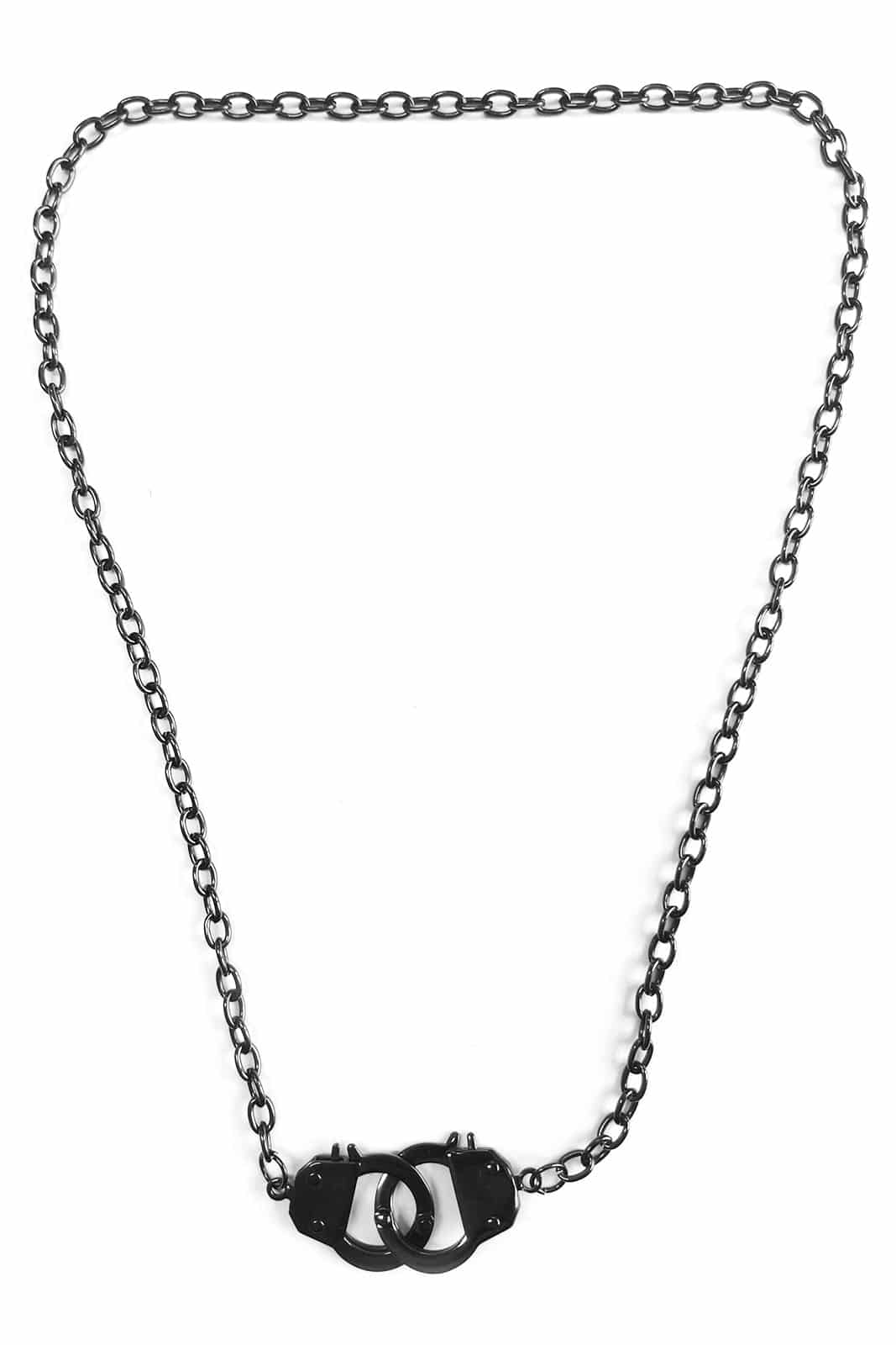 Halskette in Form von Handschellen an einer schwarzen Edelstahlkette.
