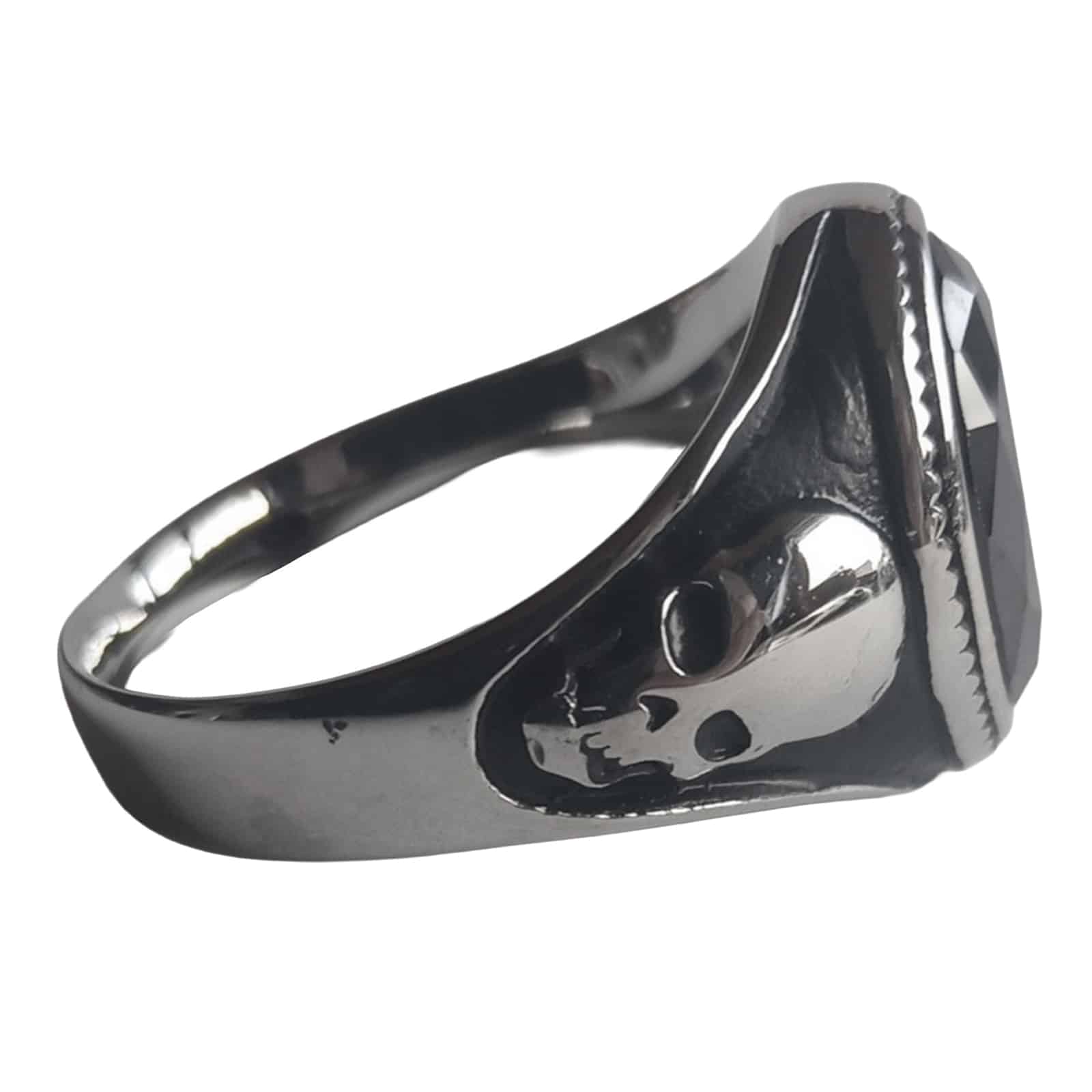 Ausdrucksstarker Ring aus glänzendem Chirurgenstahl mit seitlich eingearbeiteten Totenkopf-Details. Der dunkle, facettierte Stein bildet den Mittelpunkt und verleiht dem Ring eine geheimnisvolle, düstere Aura. Ein markantes Schmuckstück für alle, die Stärke, Rebellion und dunkle Eleganz vereinen wollen.