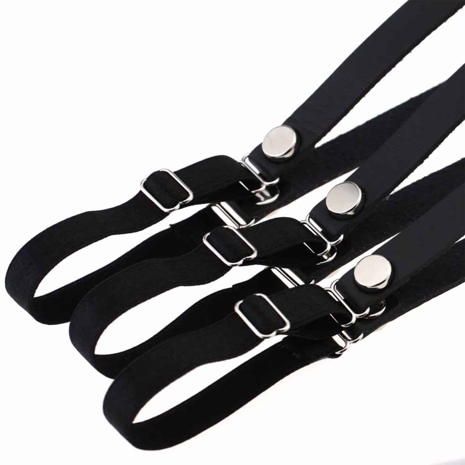 Auffälliger Strumpfhalter der an der Vorderseite aus Kunstleder-Riemen hergestellt ist. Auf der Rückseite sind elastische und verstellbare Gummizüge verarbeitet.